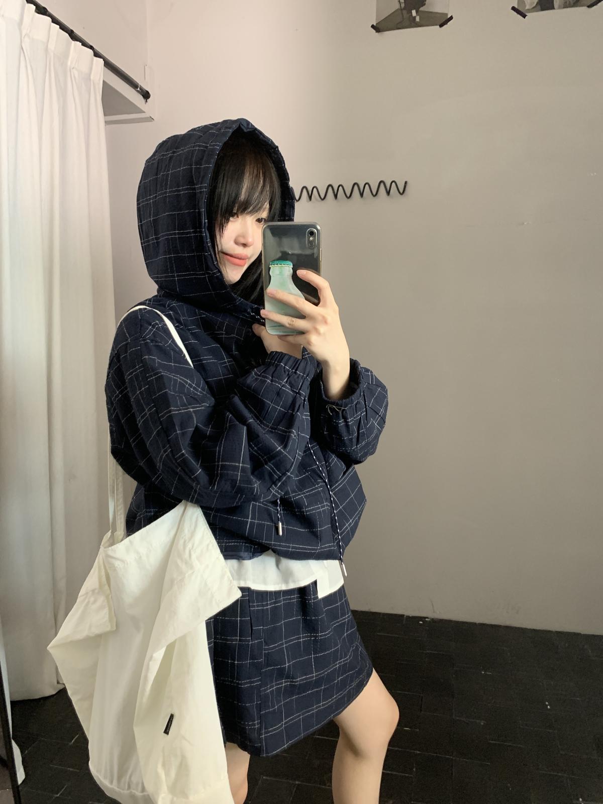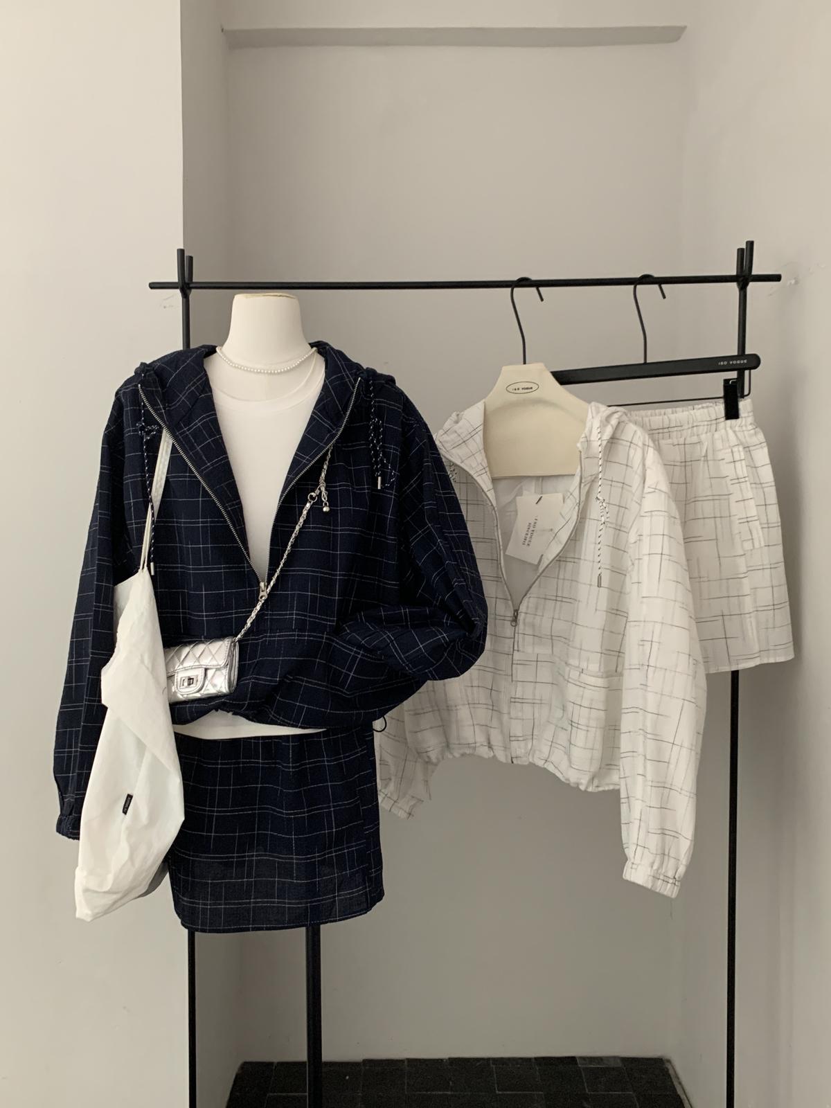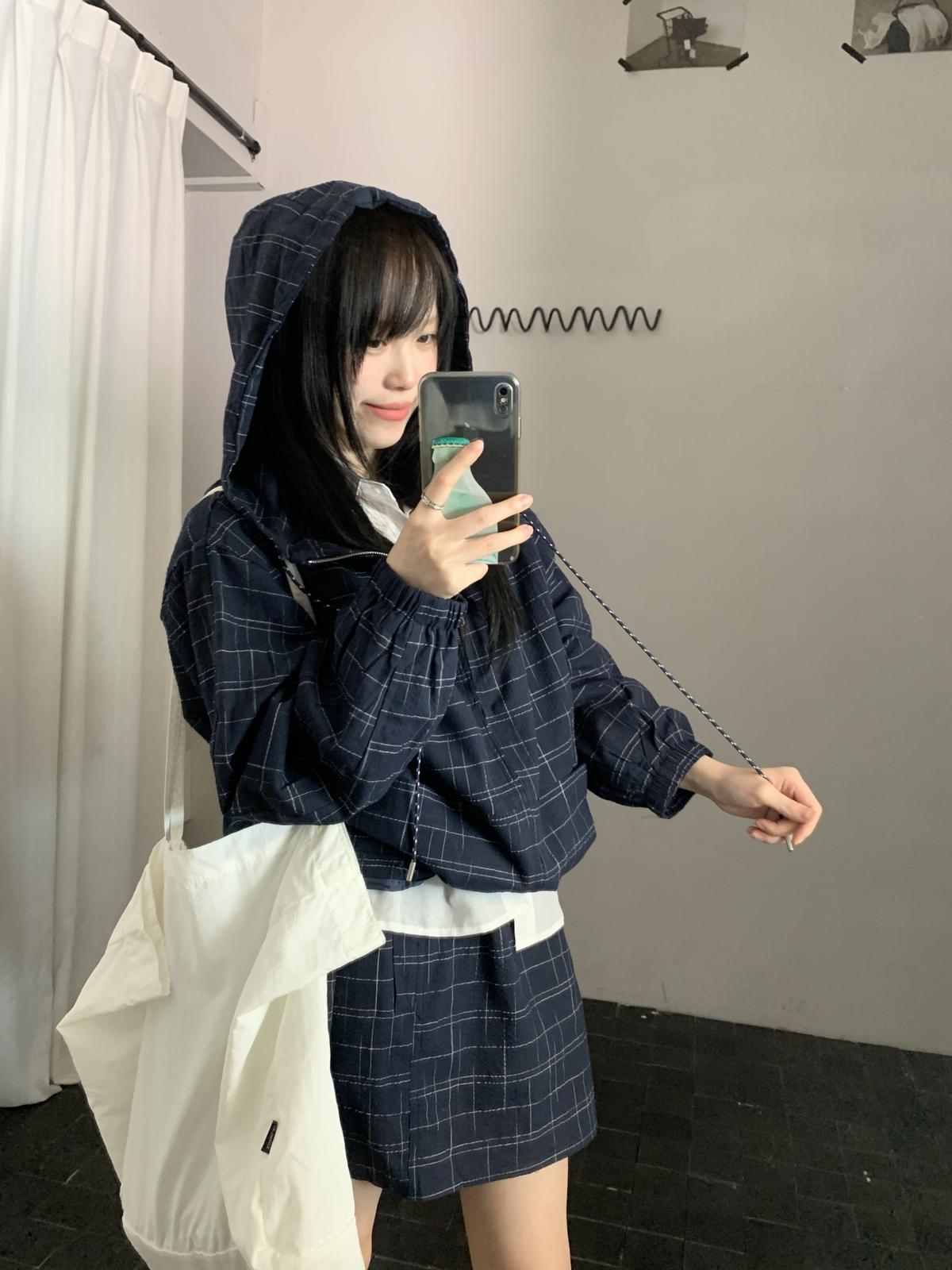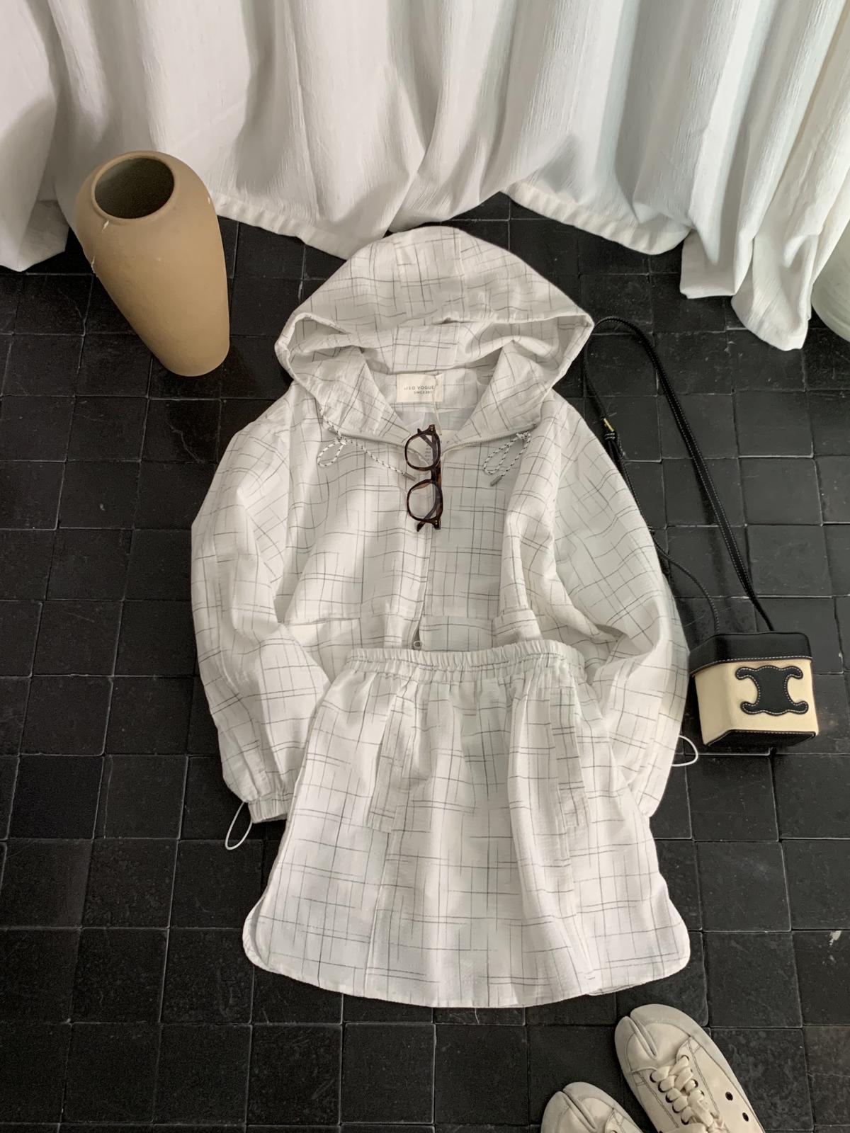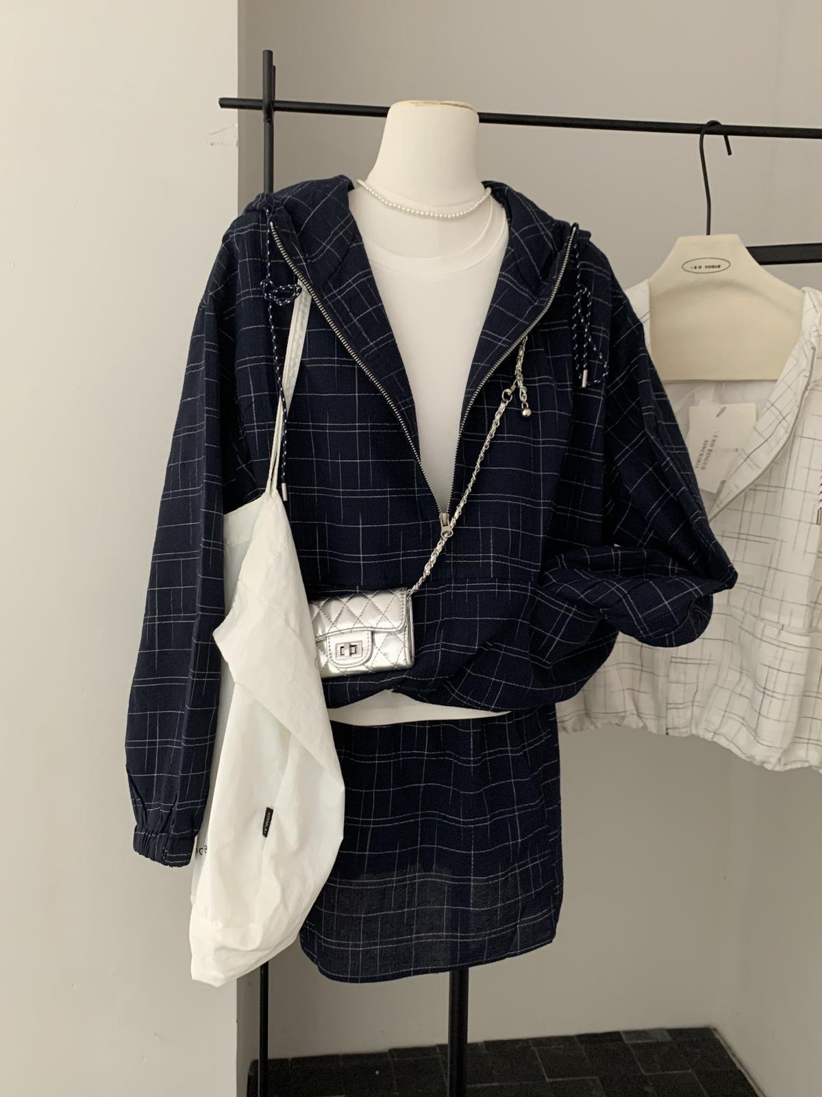 【C8665】簡約帶帽寬鬆條紋百搭半身裙+短外套套裝