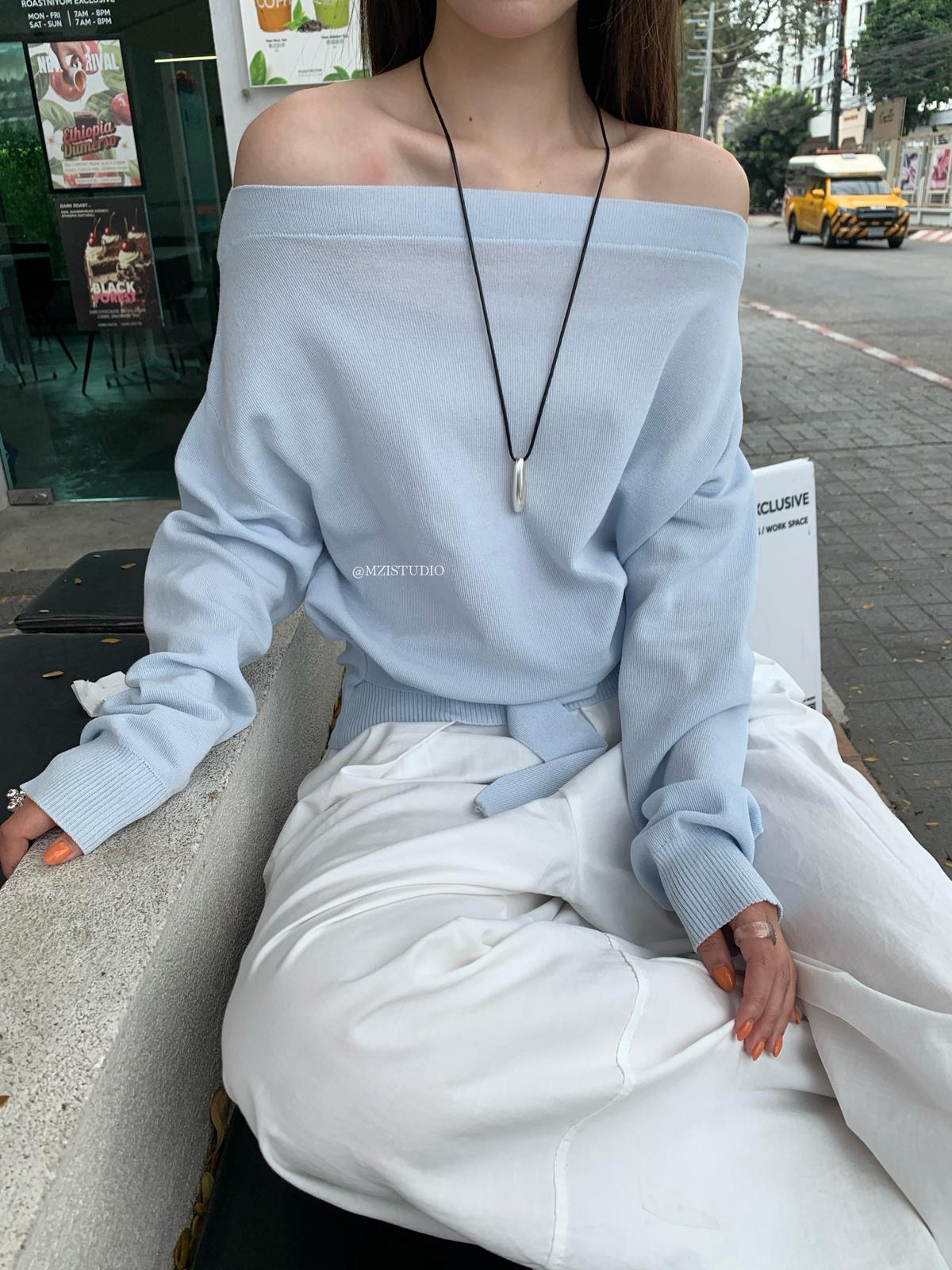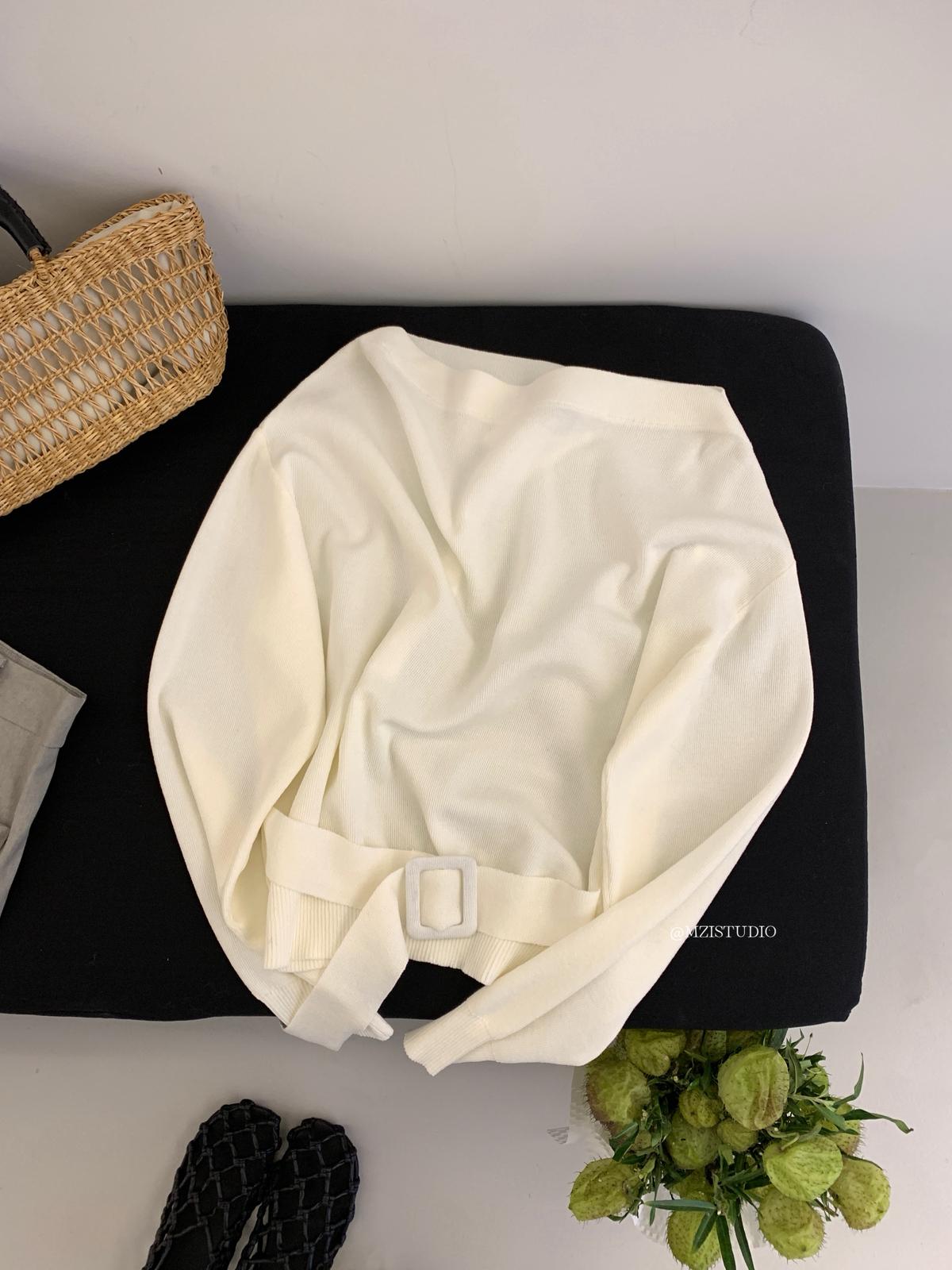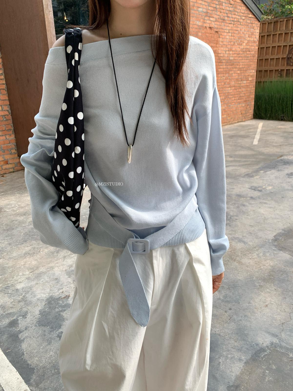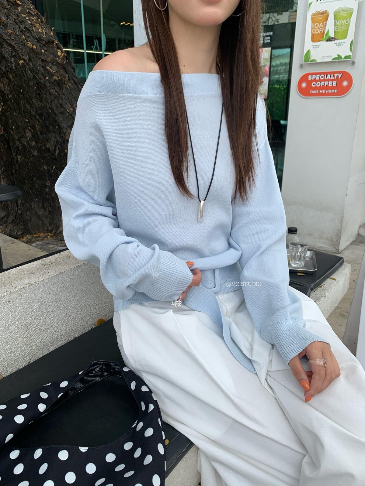 【C8704】編織的柔軟韓版春季萊賽爾細膩質感收腰一字肩小心機穿搭針織衫(配腰帶)