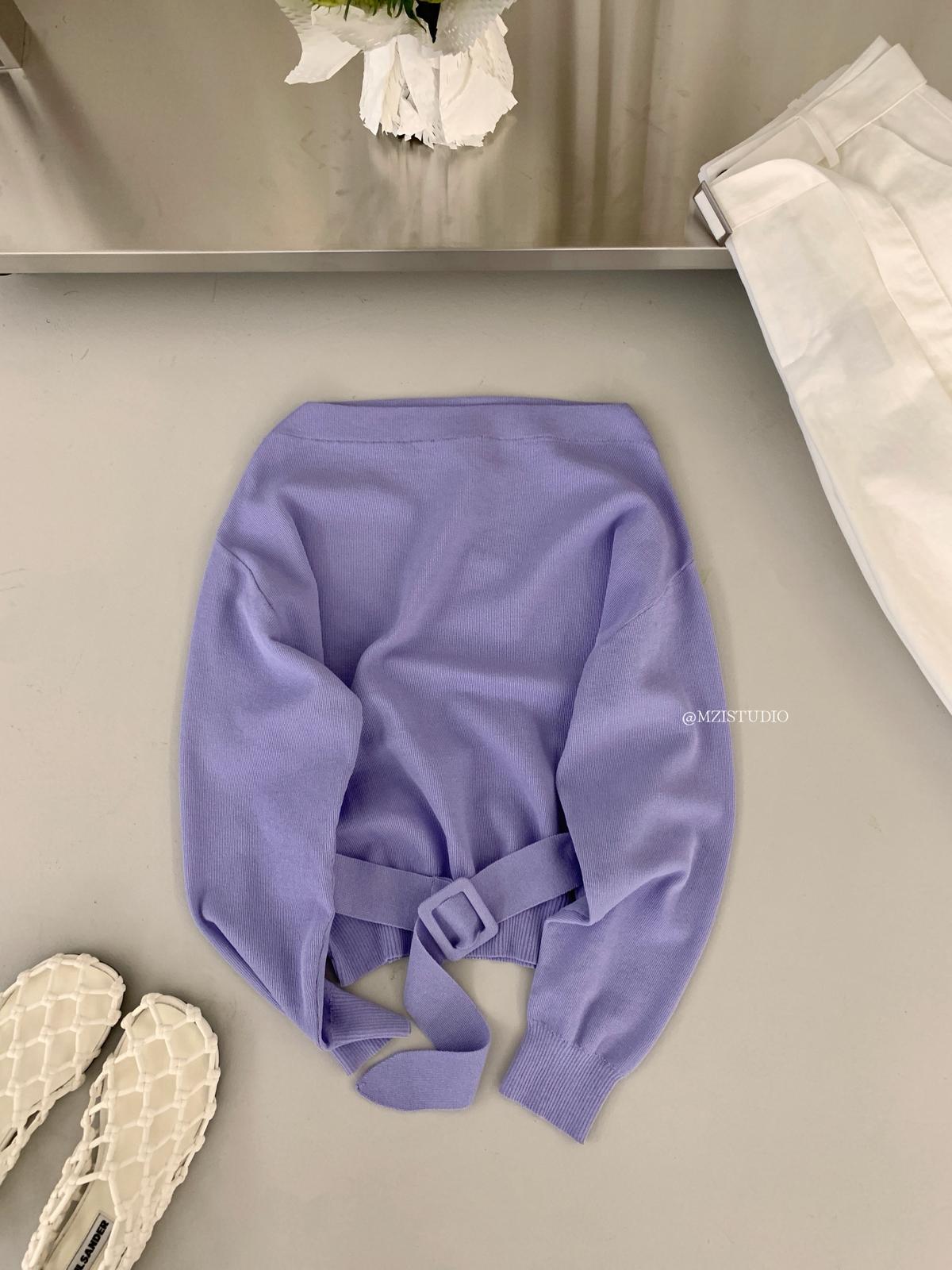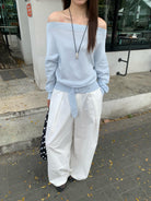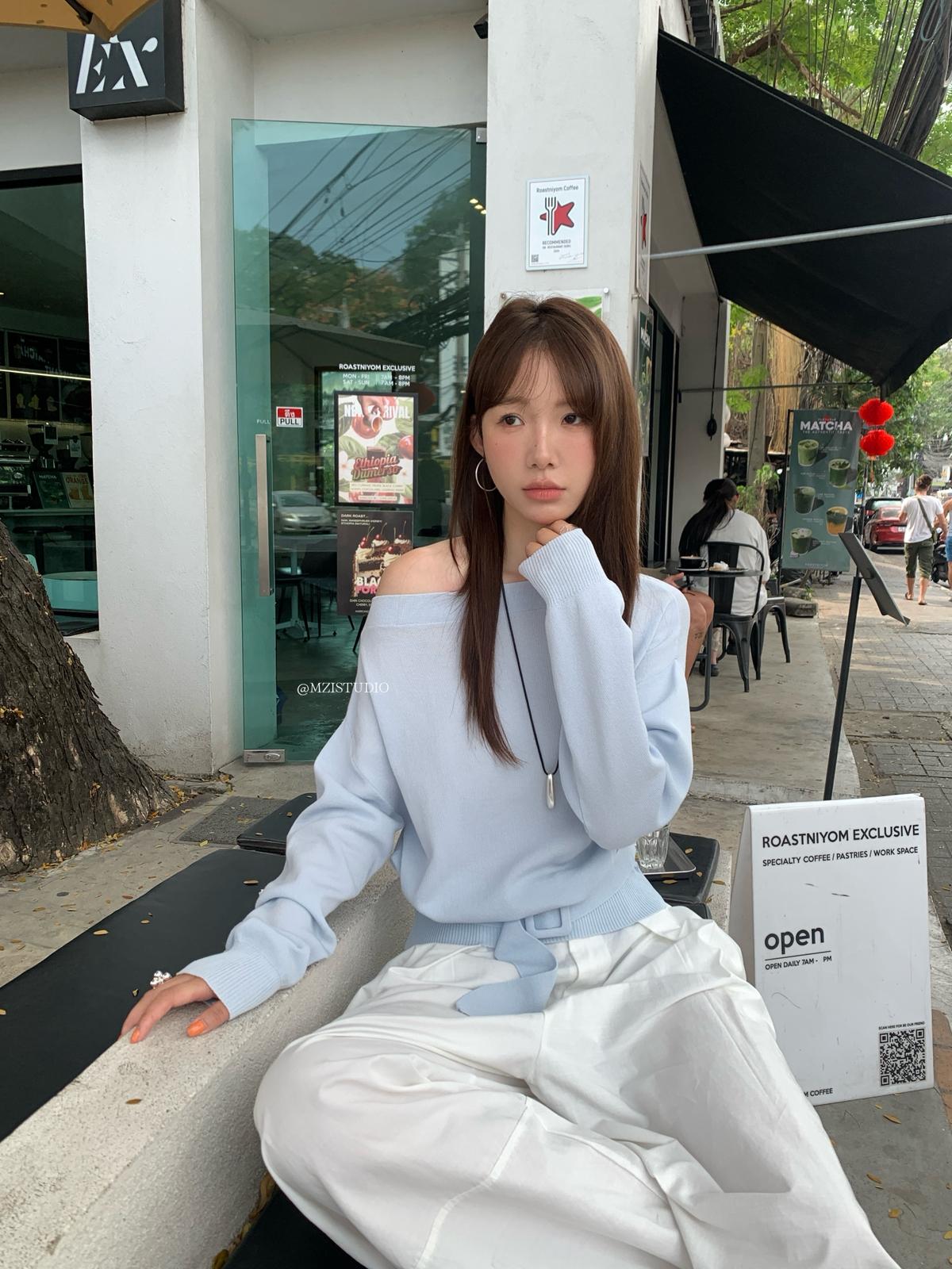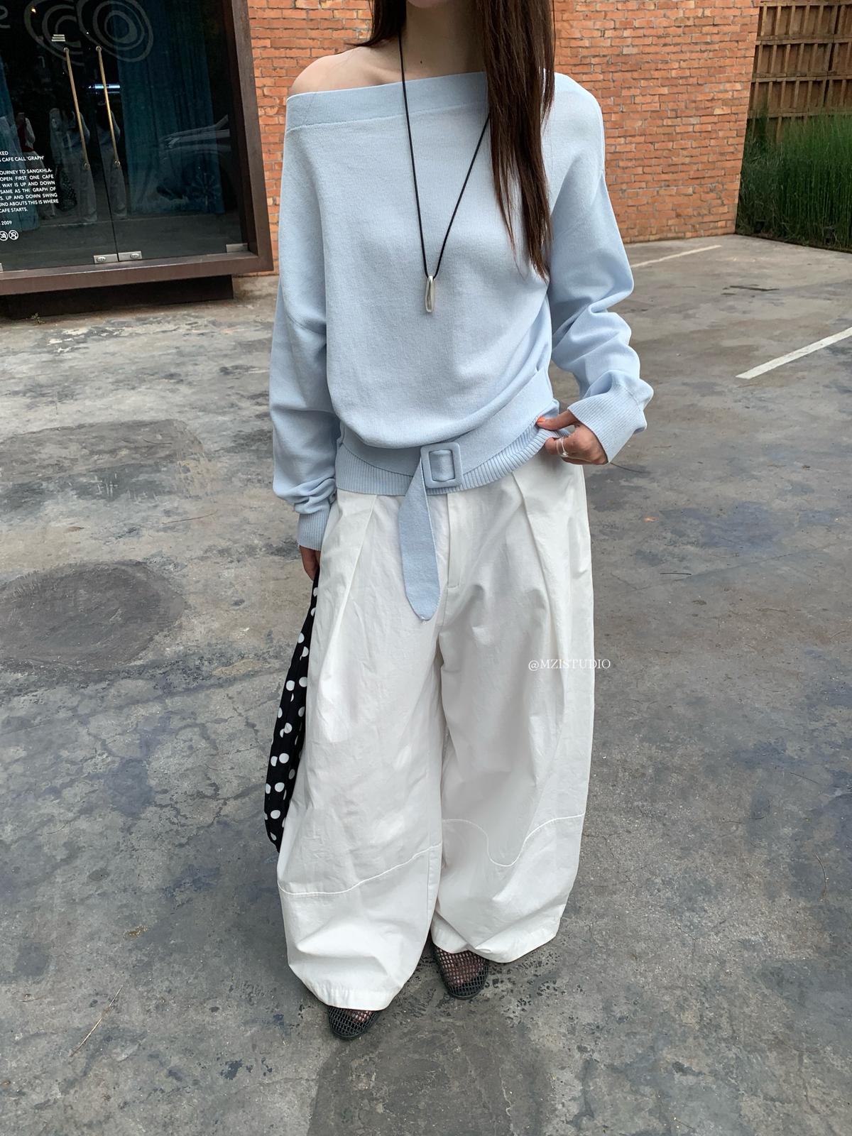 【C8704】編織的柔軟韓版春季萊賽爾細膩質感收腰一字肩小心機穿搭針織衫(配腰帶)