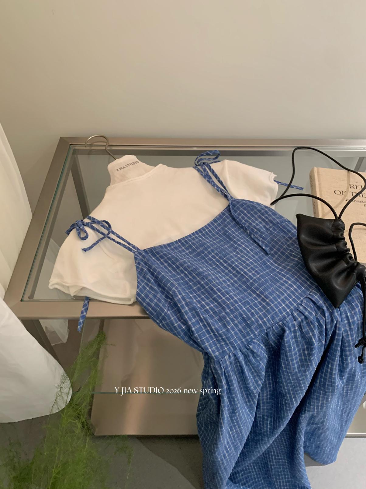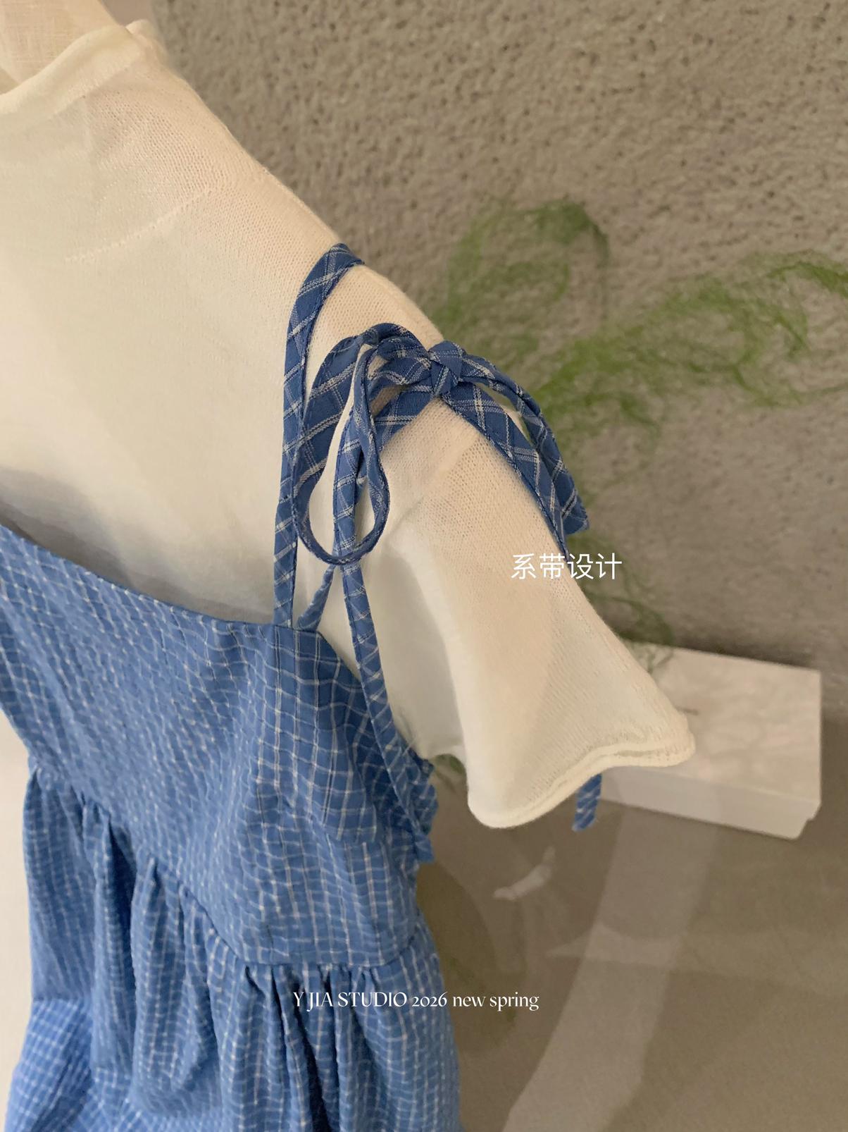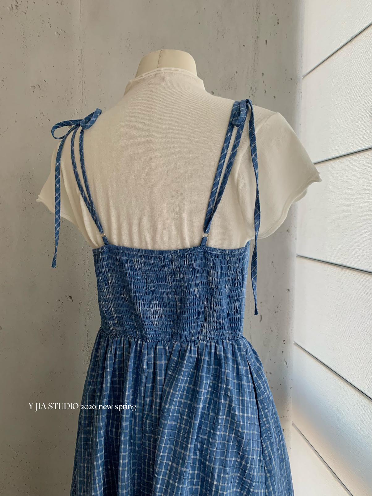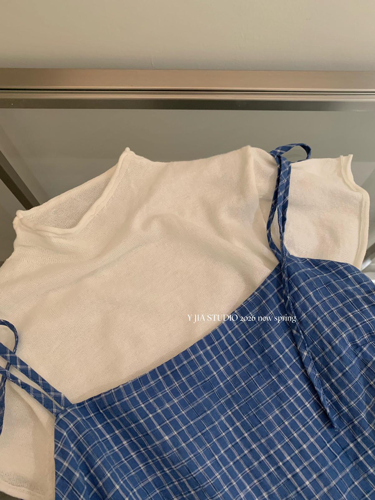 【C8749】海島熱戀~春日疊穿色織漸變藍格子吊帶連衣裙/短袖針織衫套裝