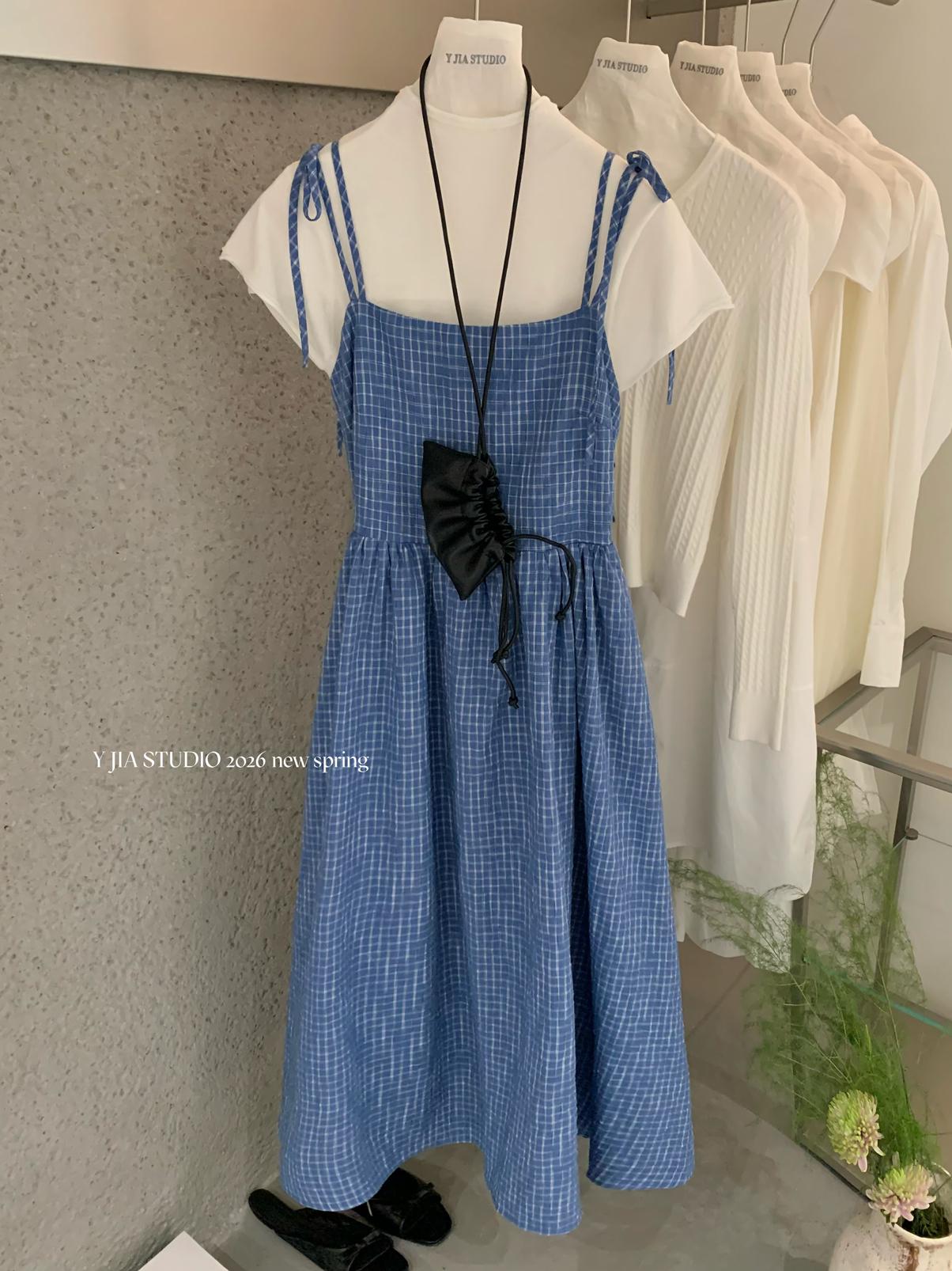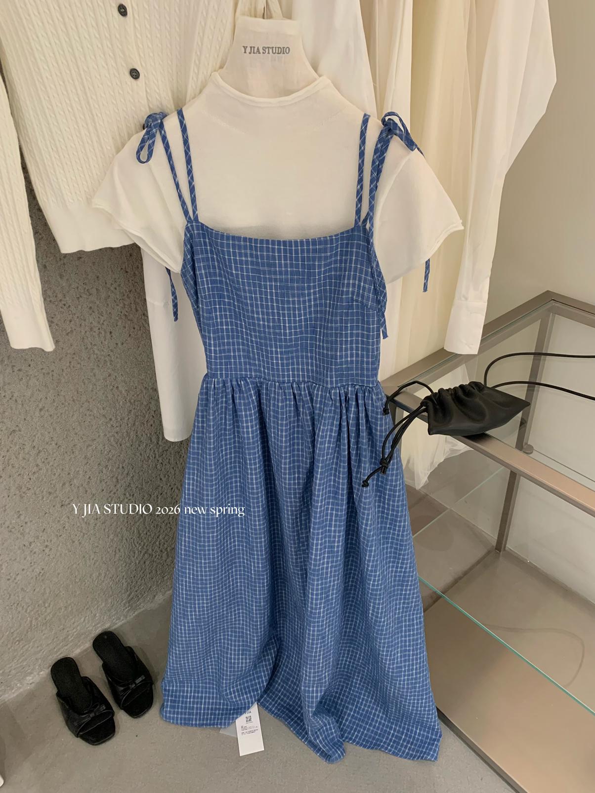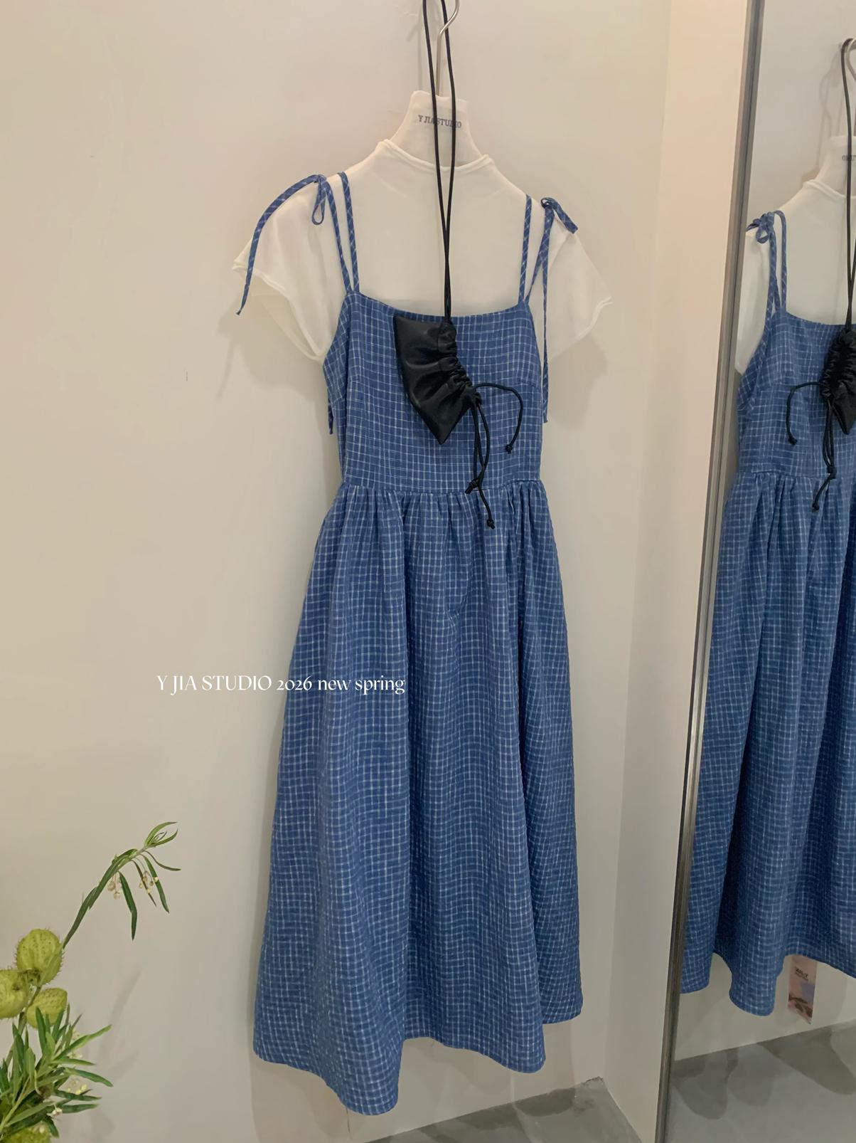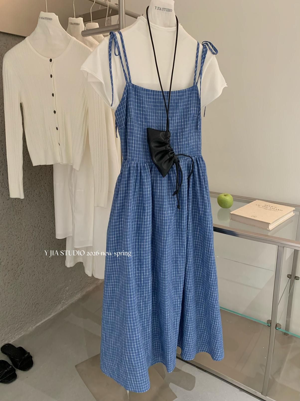【C8749】海島熱戀~春日疊穿色織漸變藍格子吊帶連衣裙/短袖針織衫套裝
