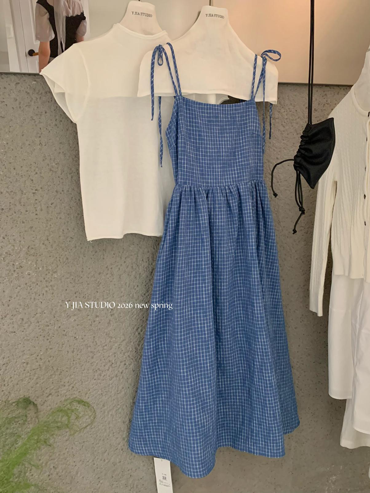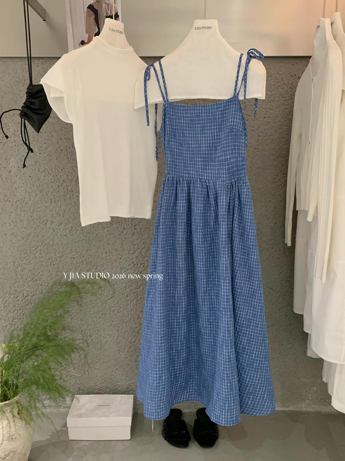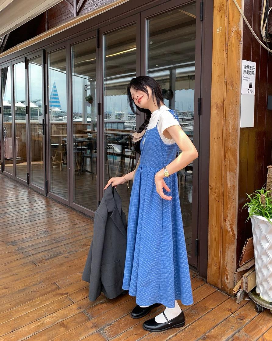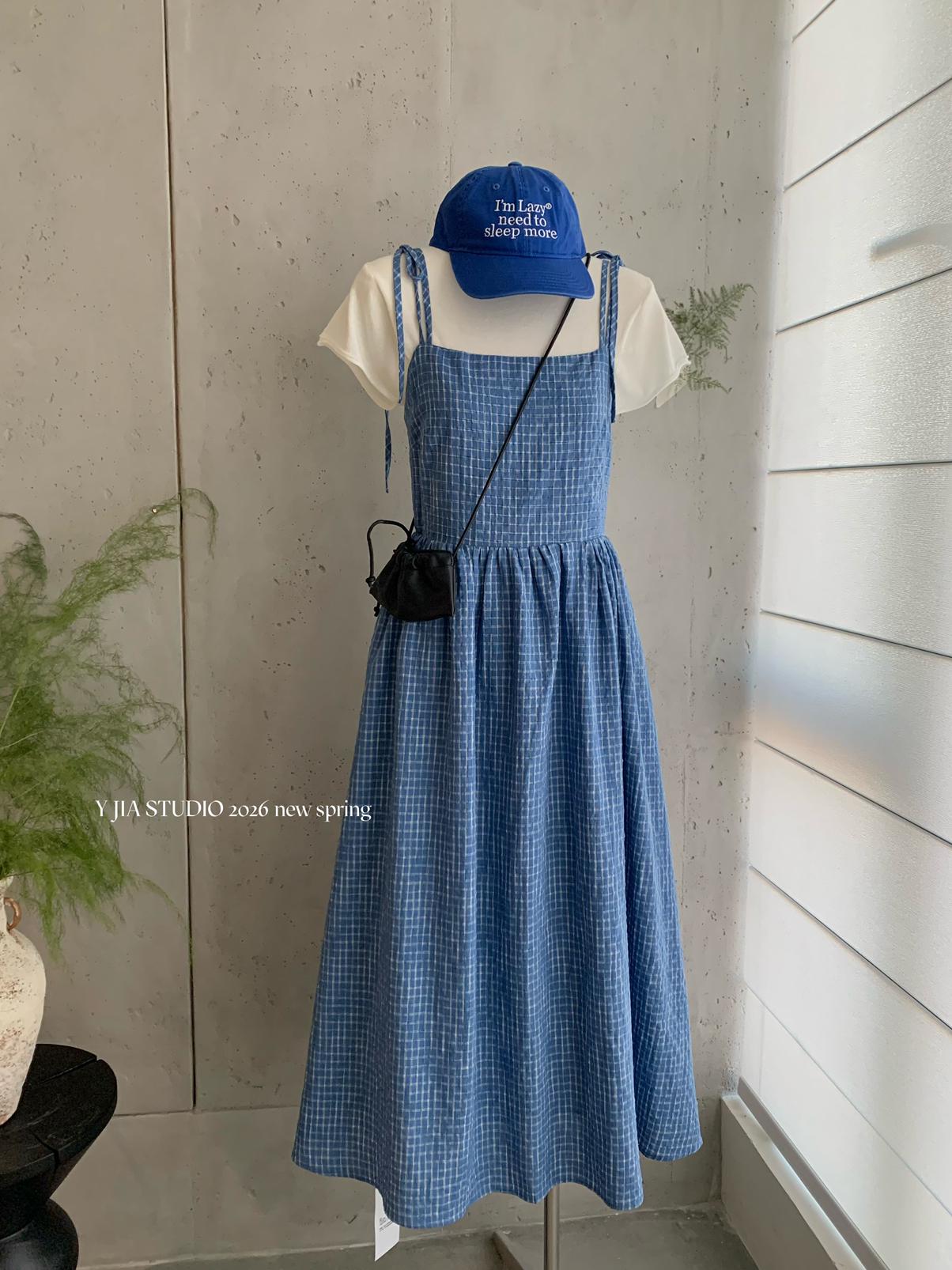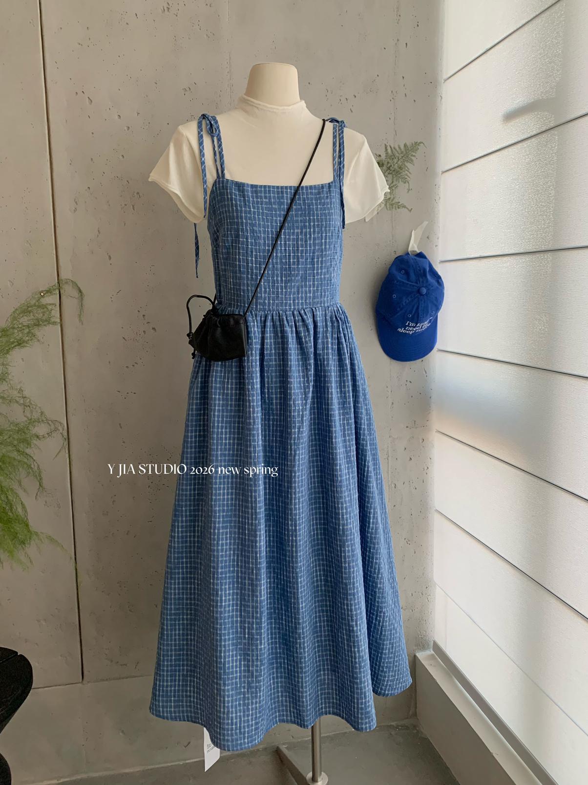 【C8749】海島熱戀~春日疊穿色織漸變藍格子吊帶連衣裙/短袖針織衫套裝