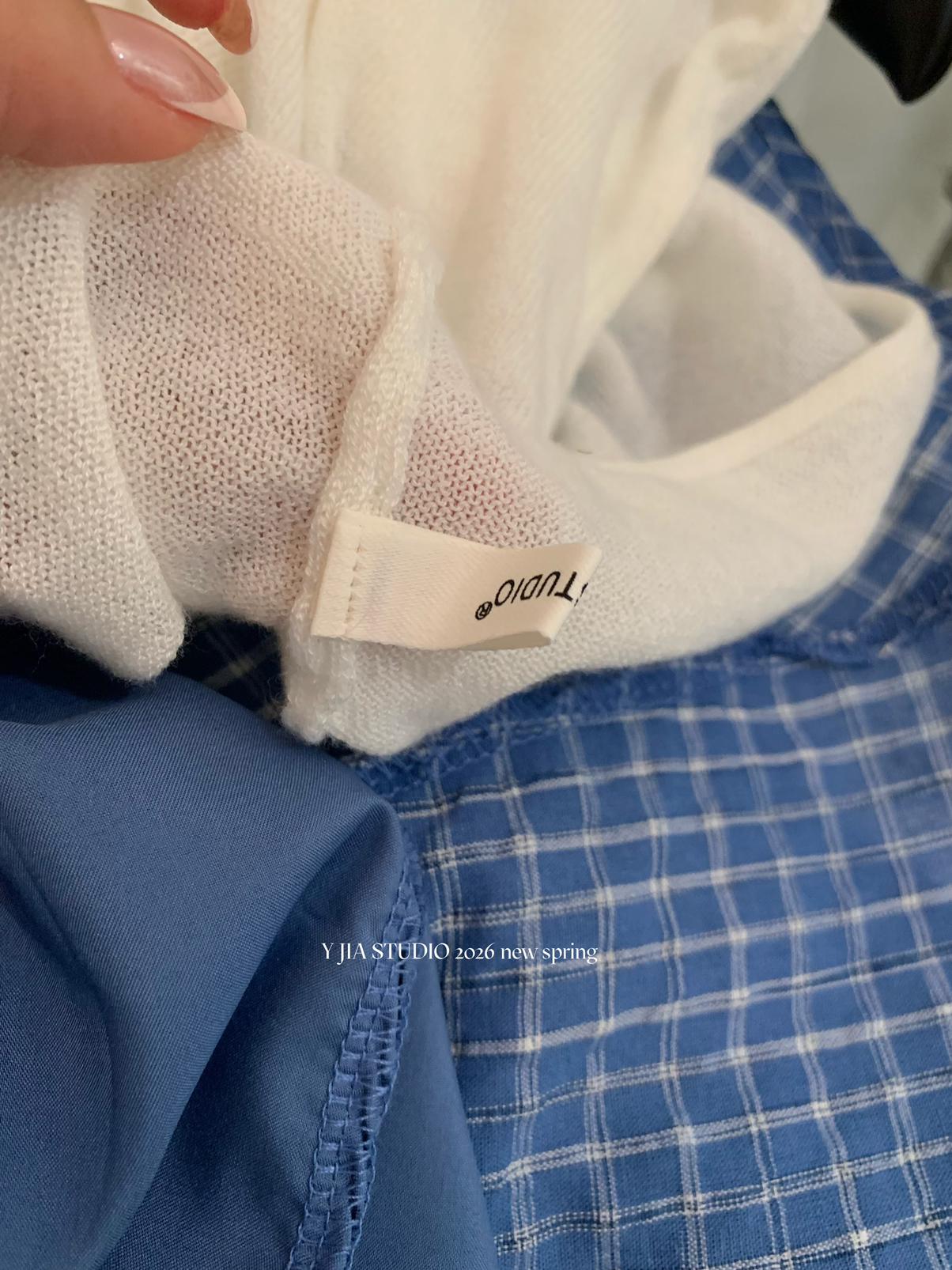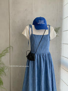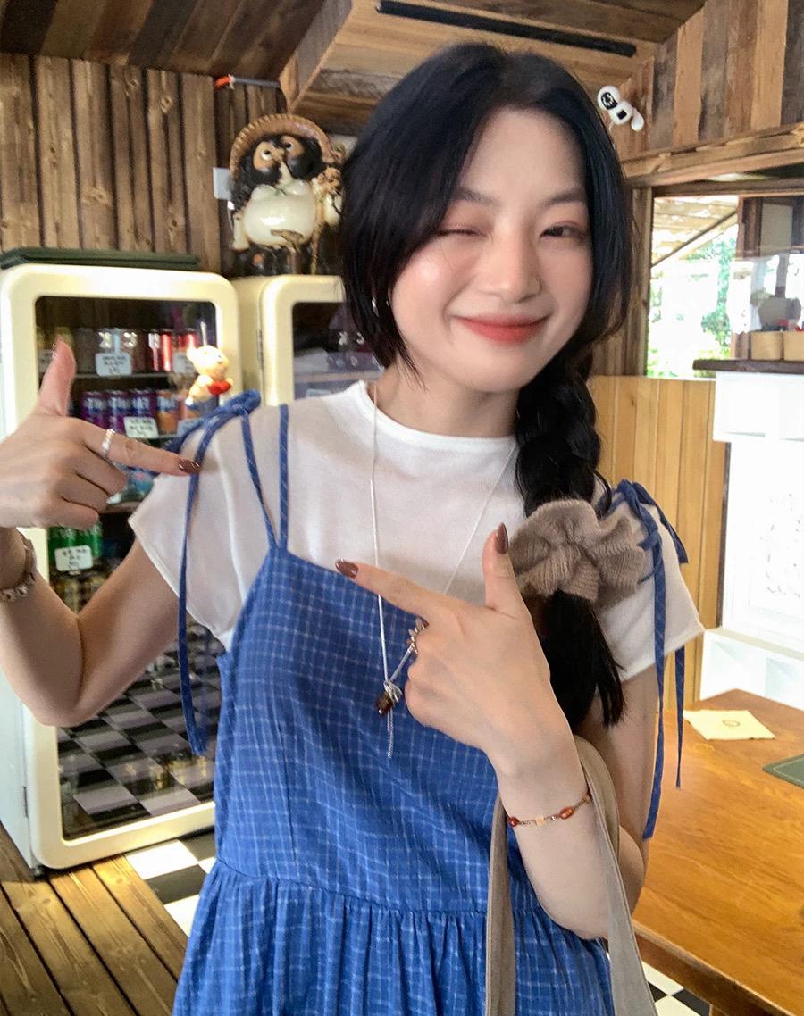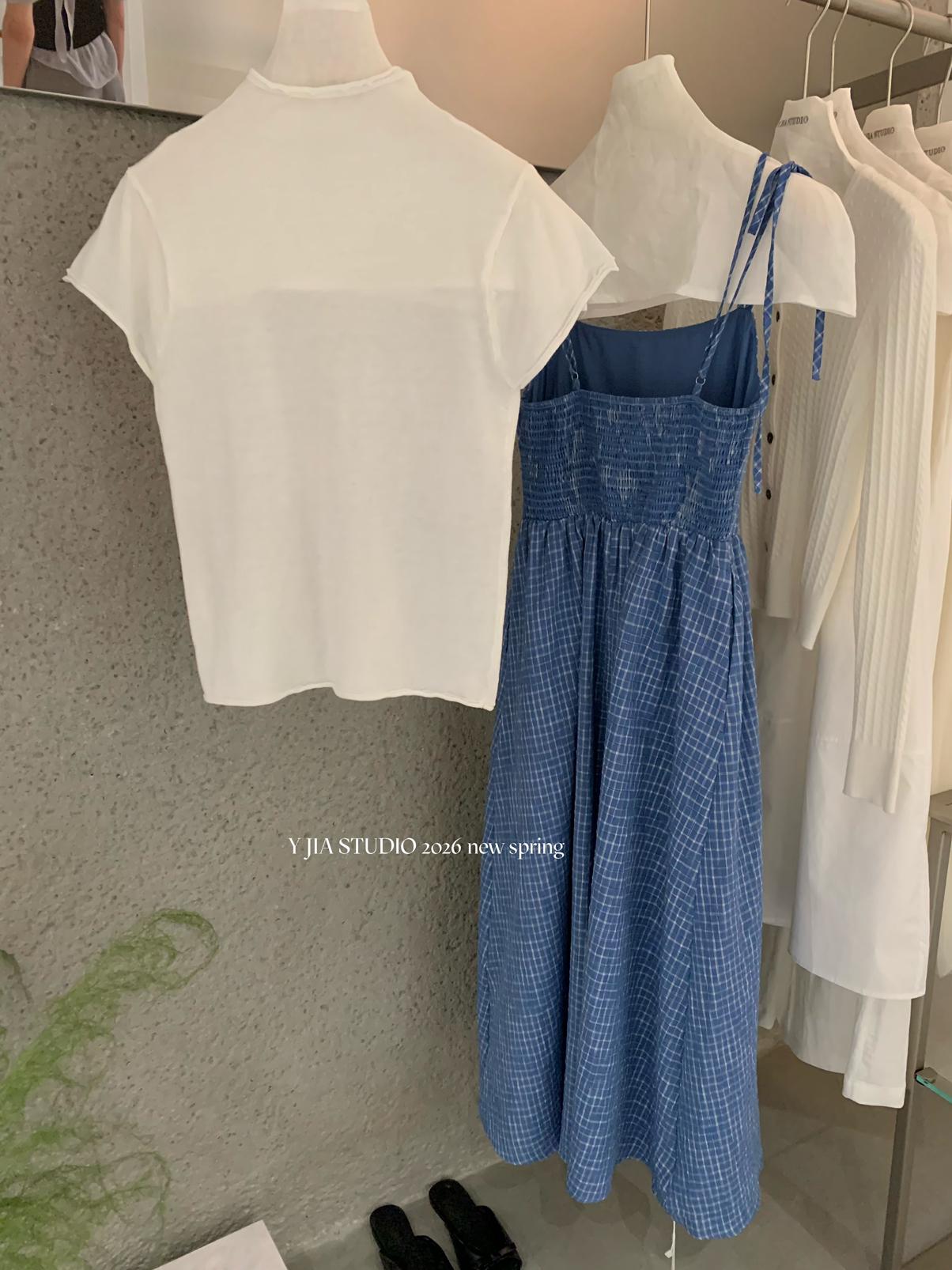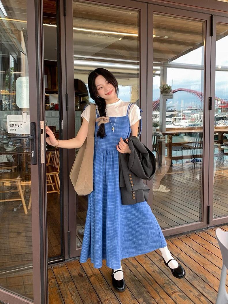 【C8749】海島熱戀~春日疊穿色織漸變藍格子吊帶連衣裙/短袖針織衫套裝