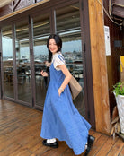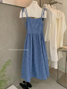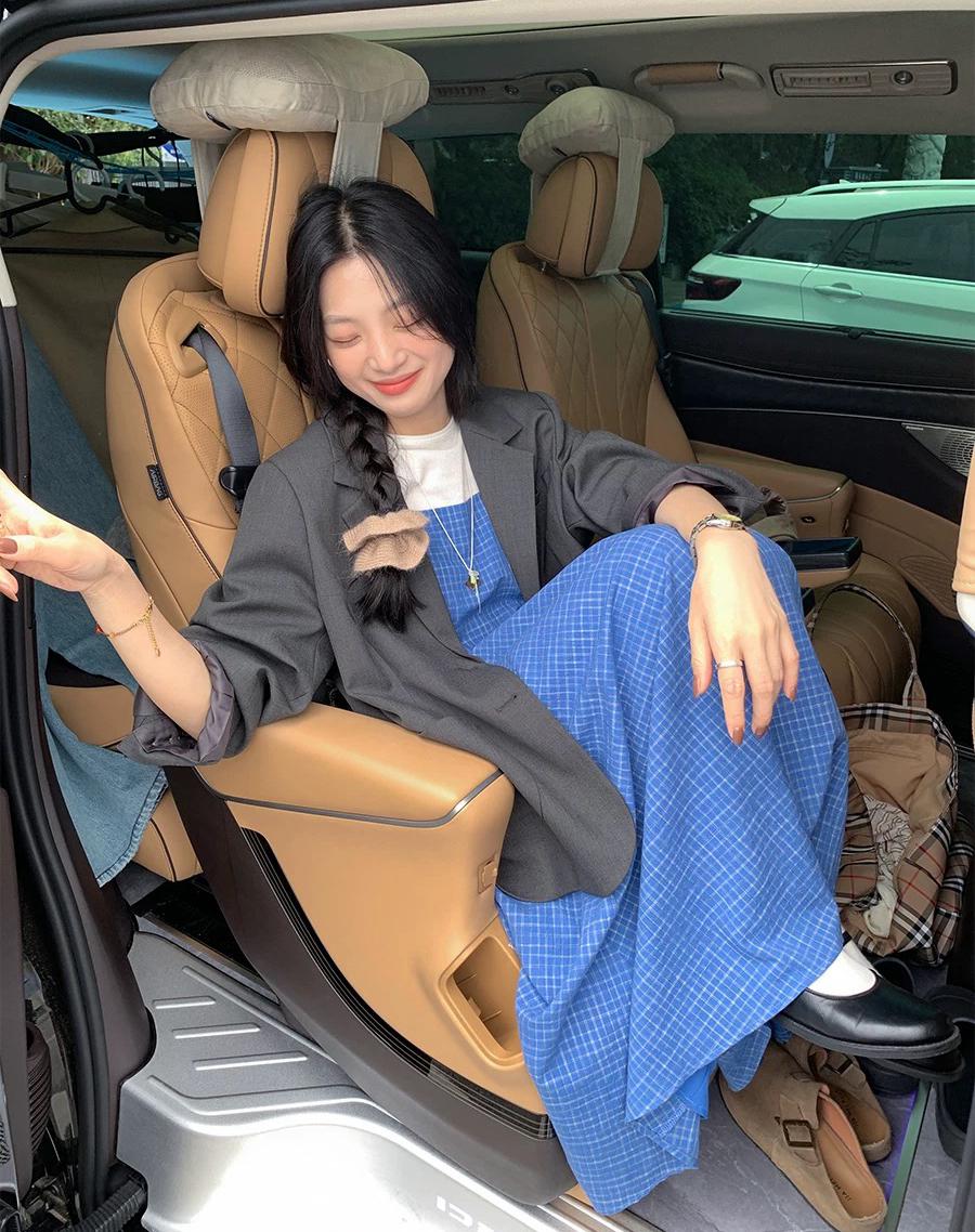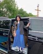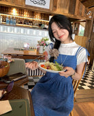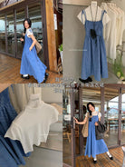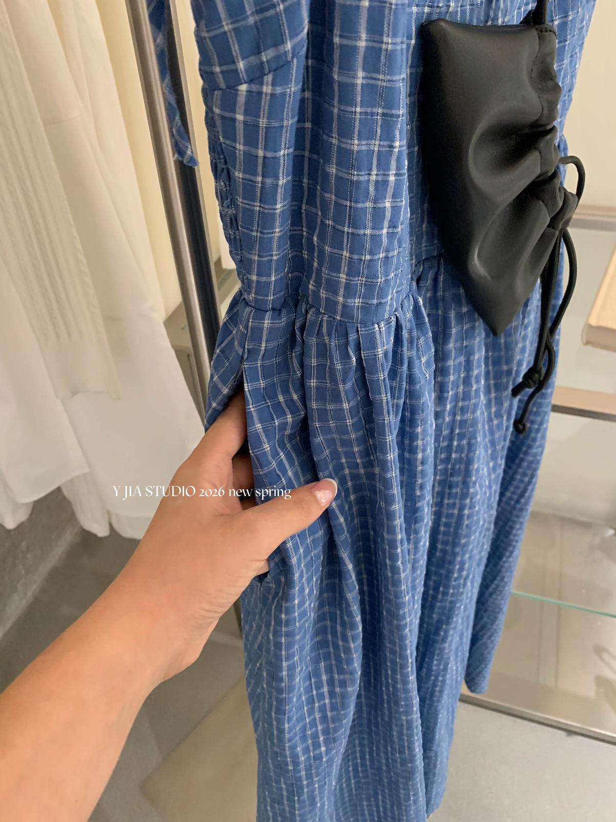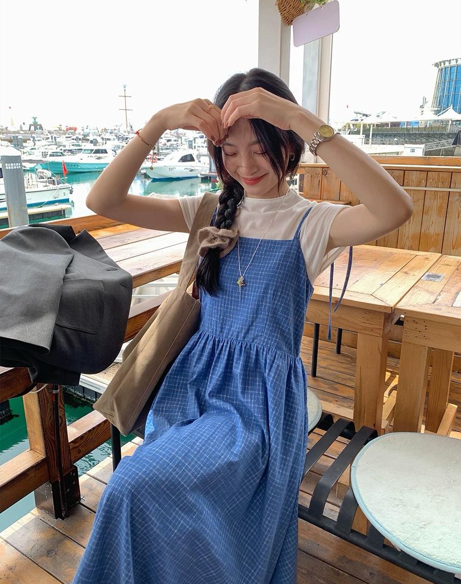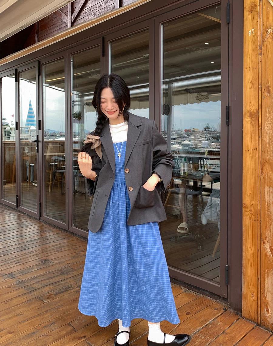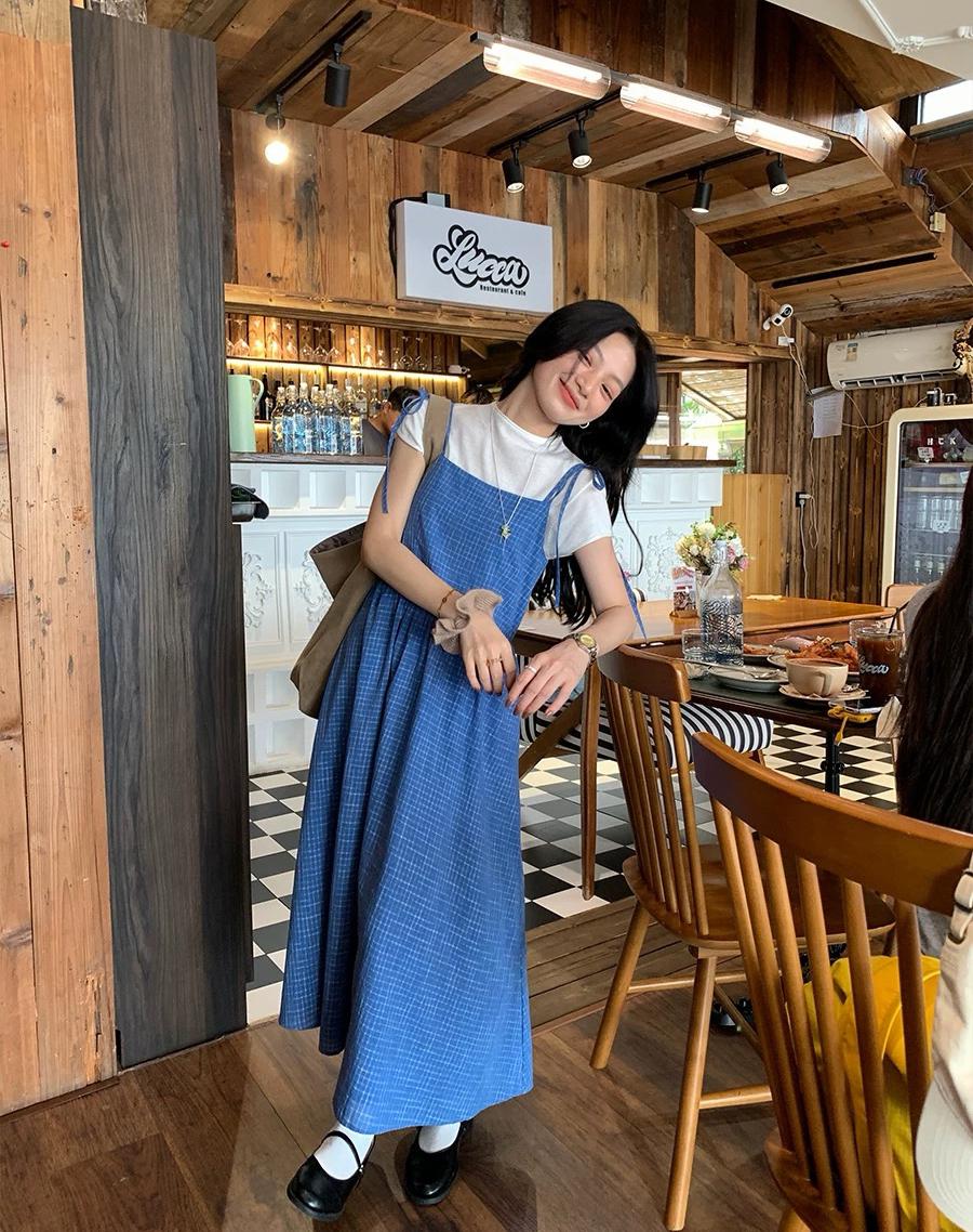 【C8749】海島熱戀~春日疊穿色織漸變藍格子吊帶連衣裙/短袖針織衫套裝
