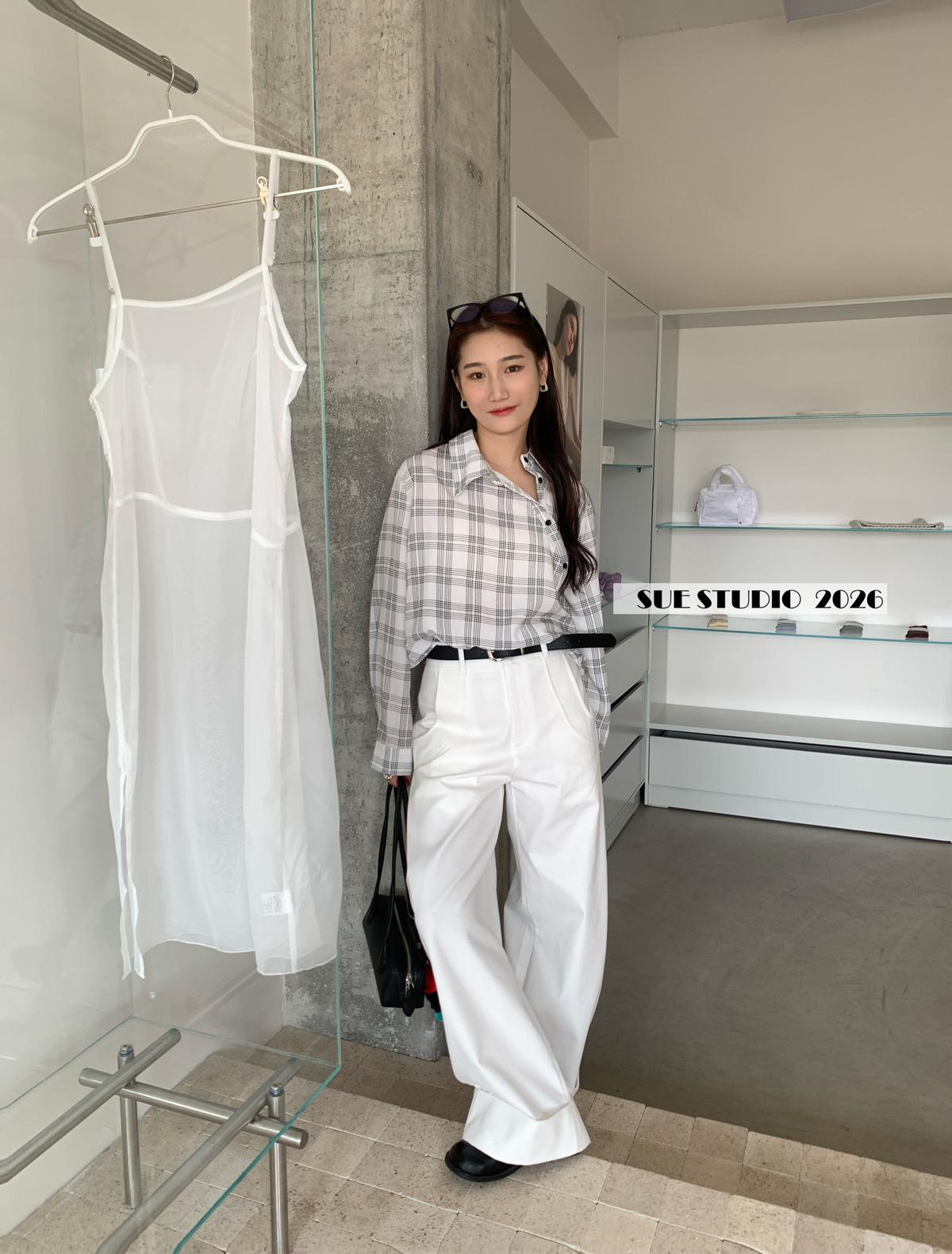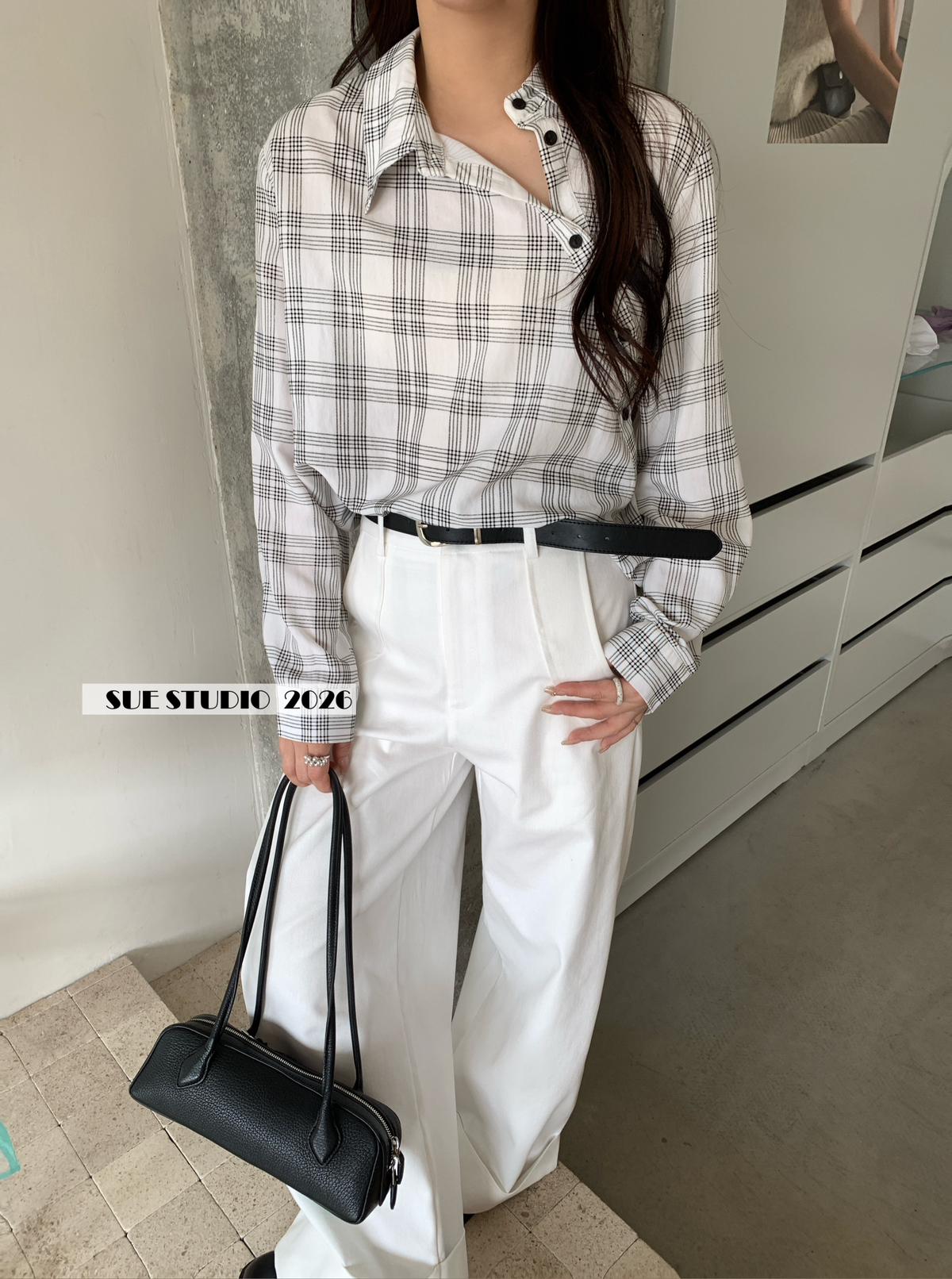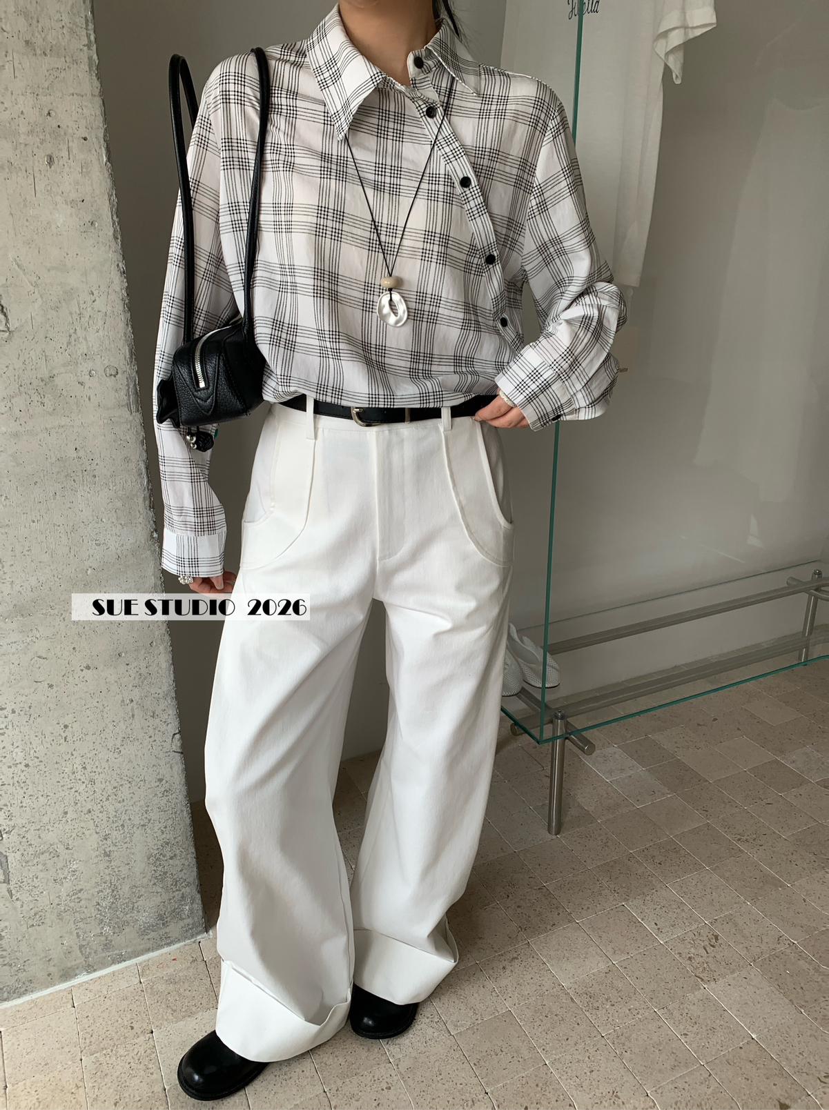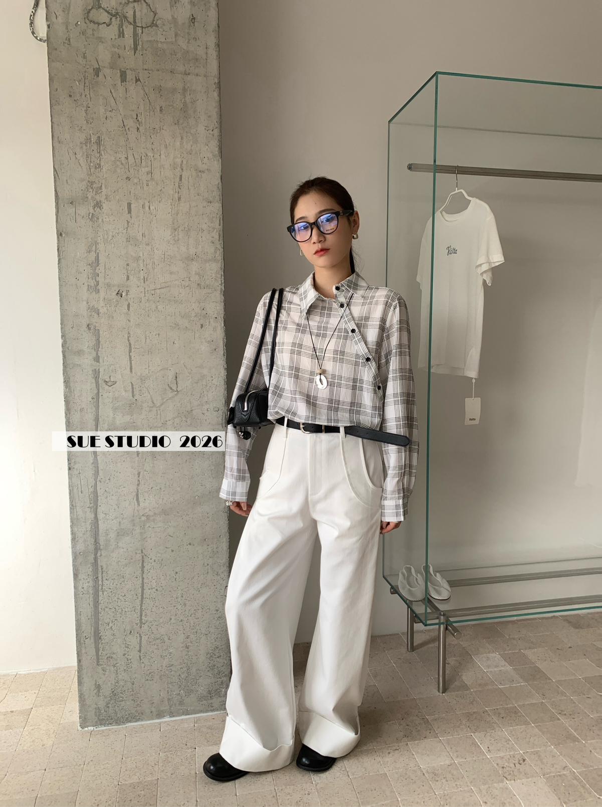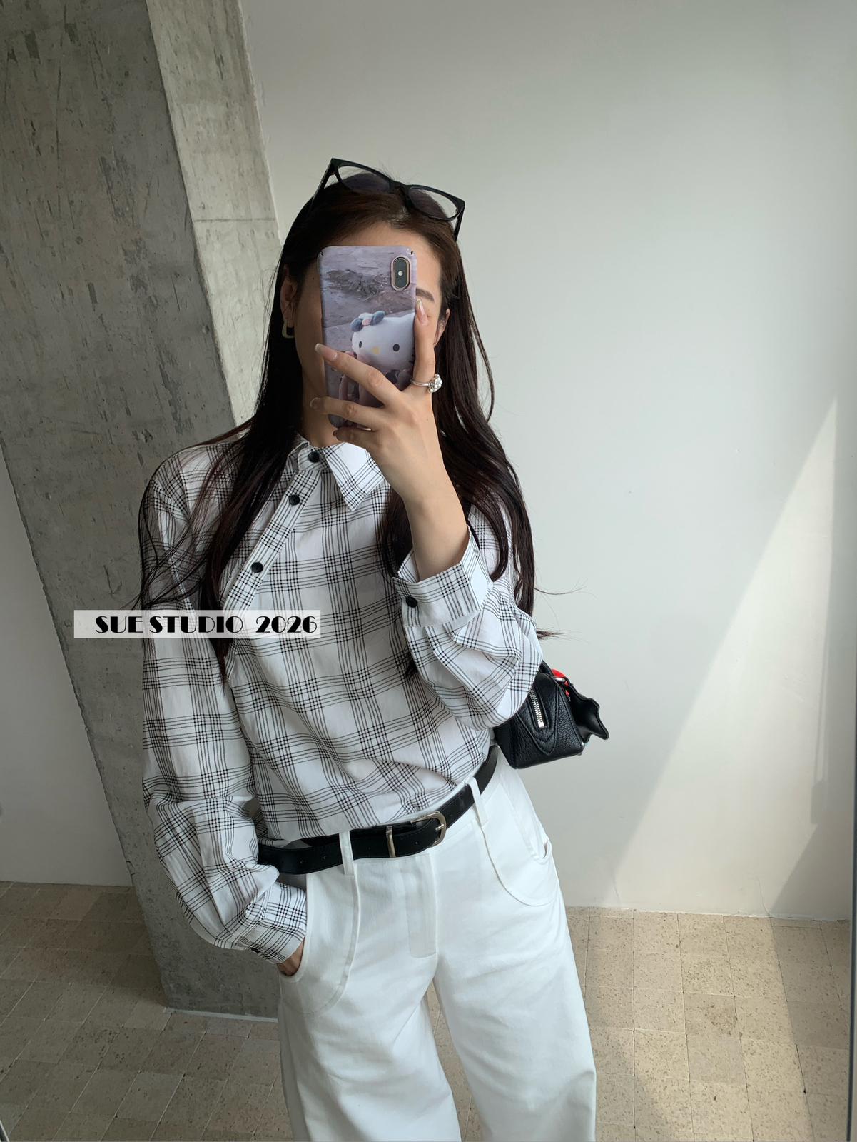 【C8751】韓系簡約設計感不規則格紋襯衫
