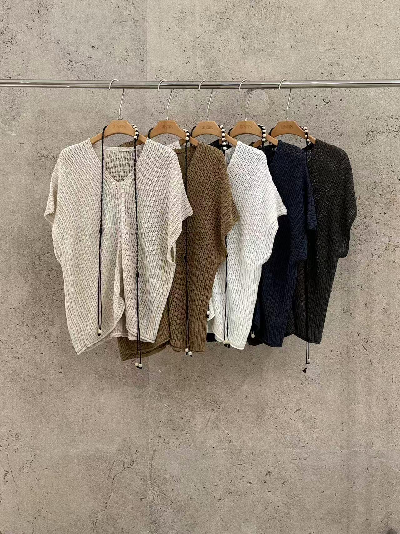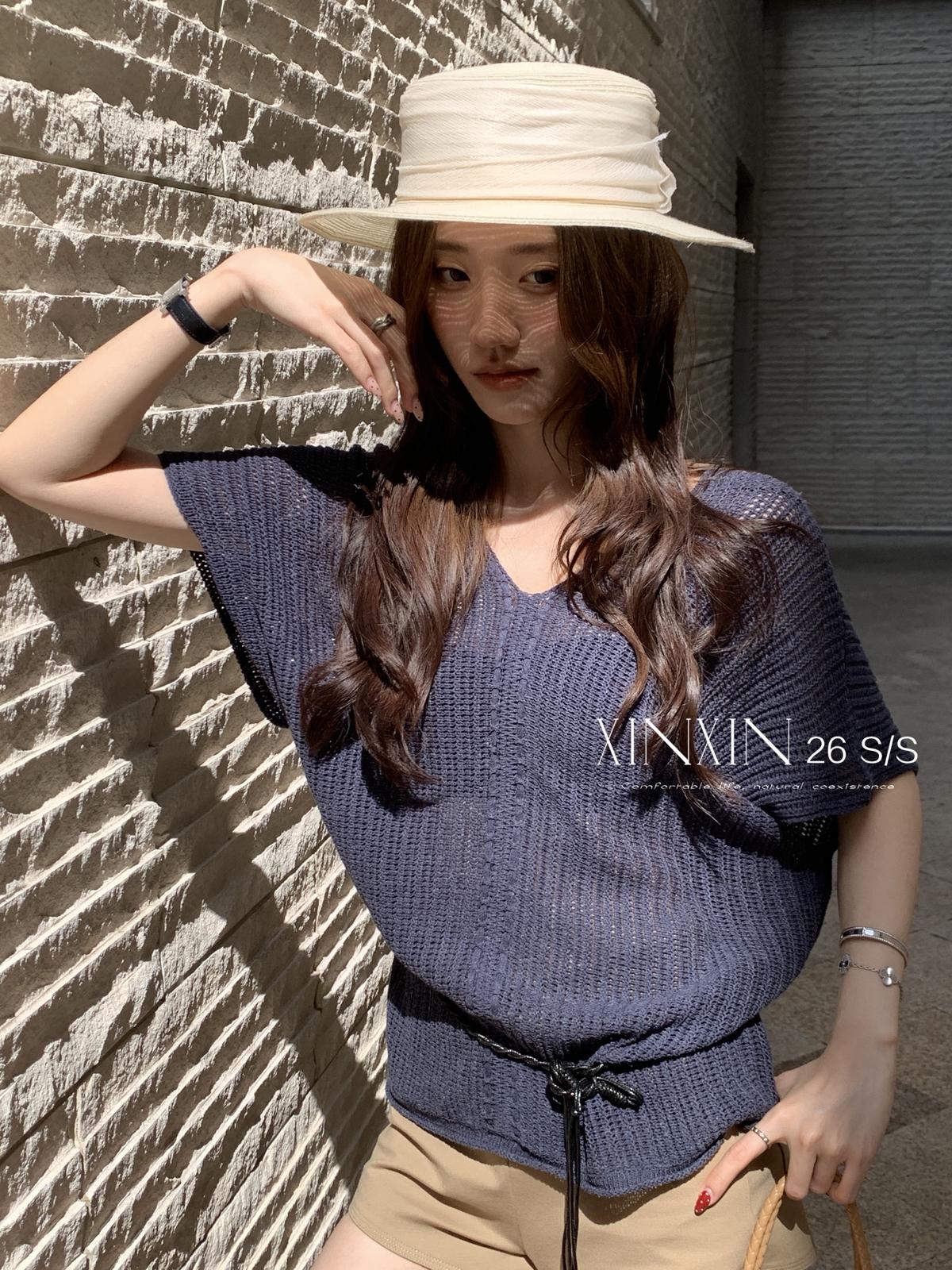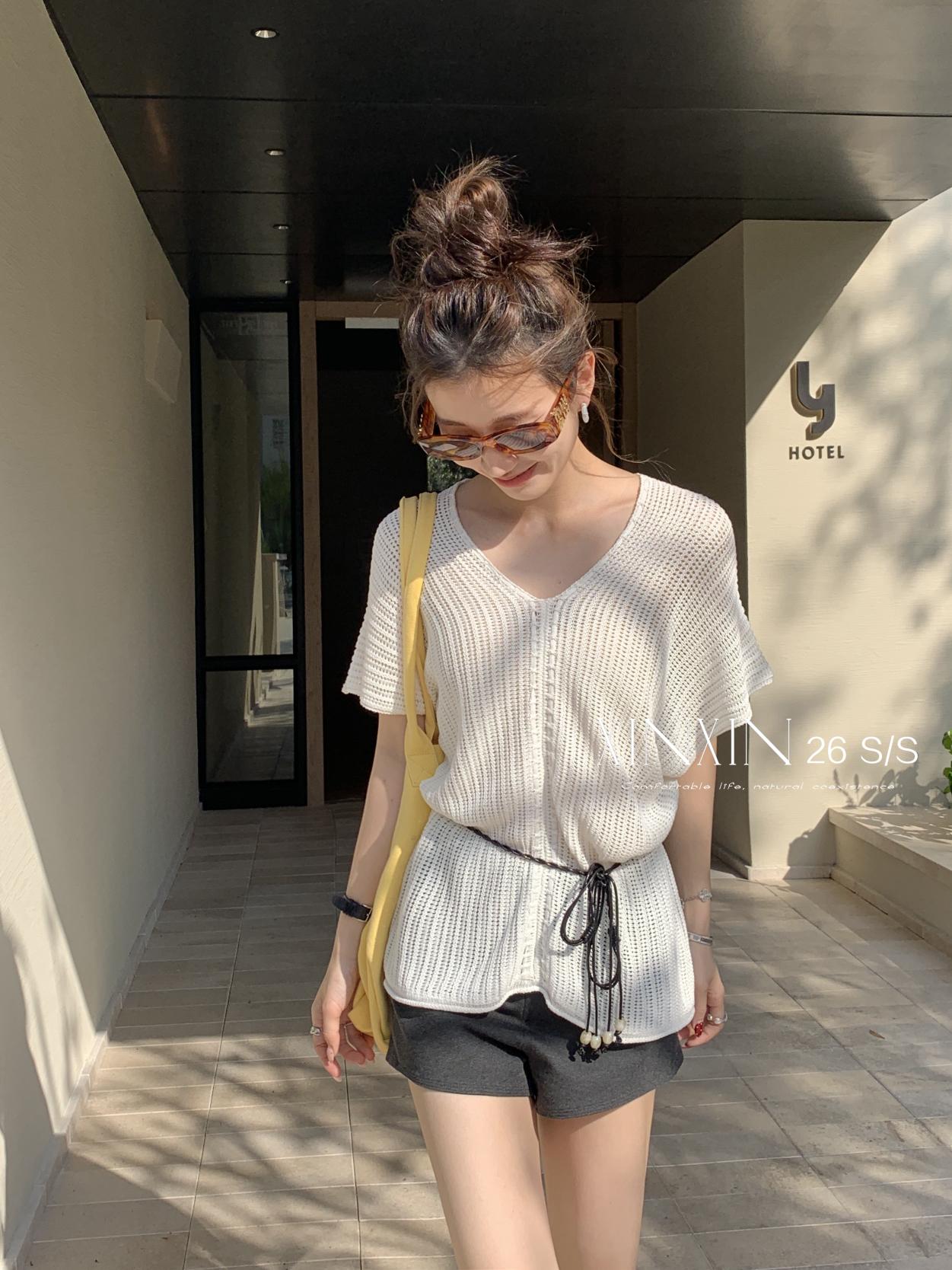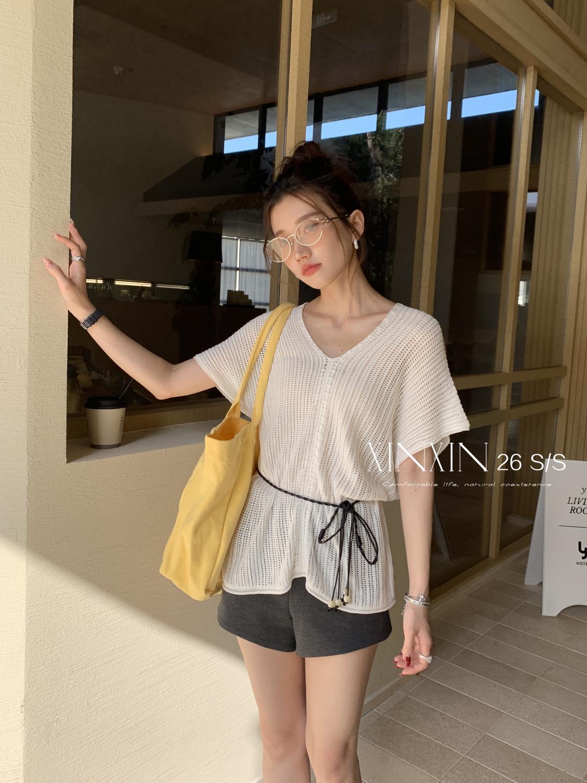 【C8786】“慵懶鬆弛感”韓版簡約V領坑條肌理感寬鬆蝙蝠袖針織衫(配腰繩)