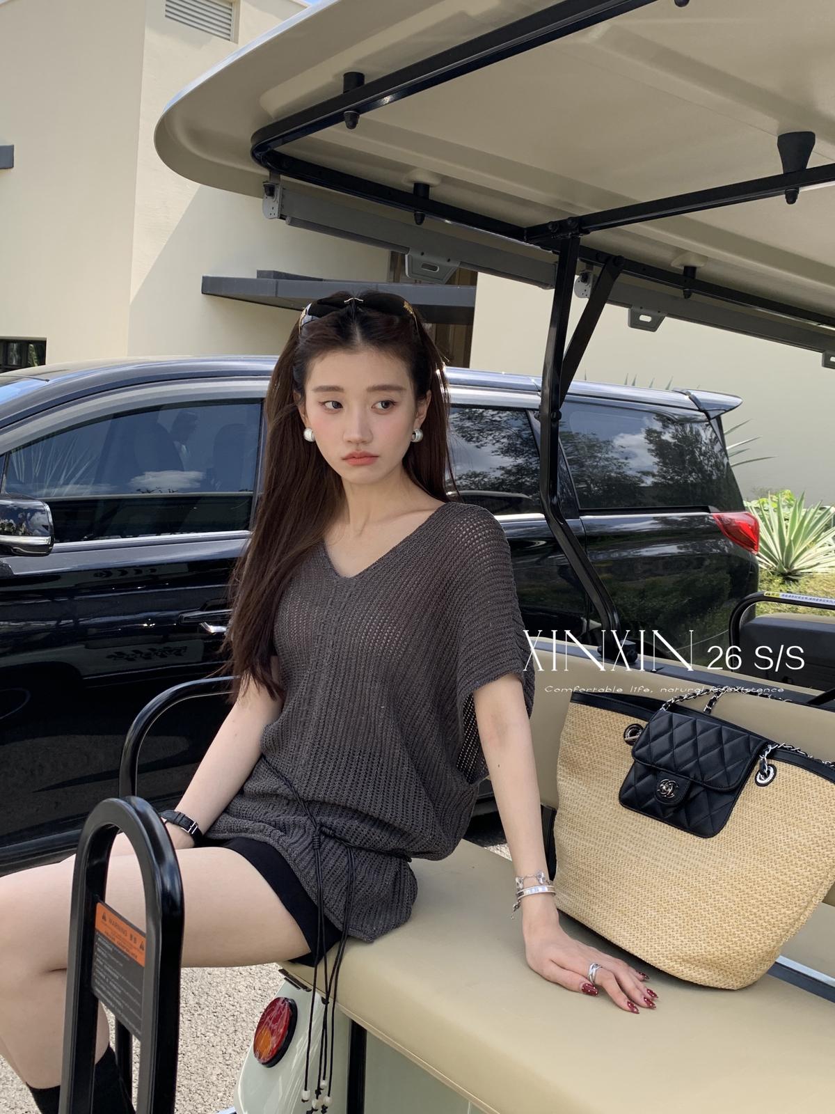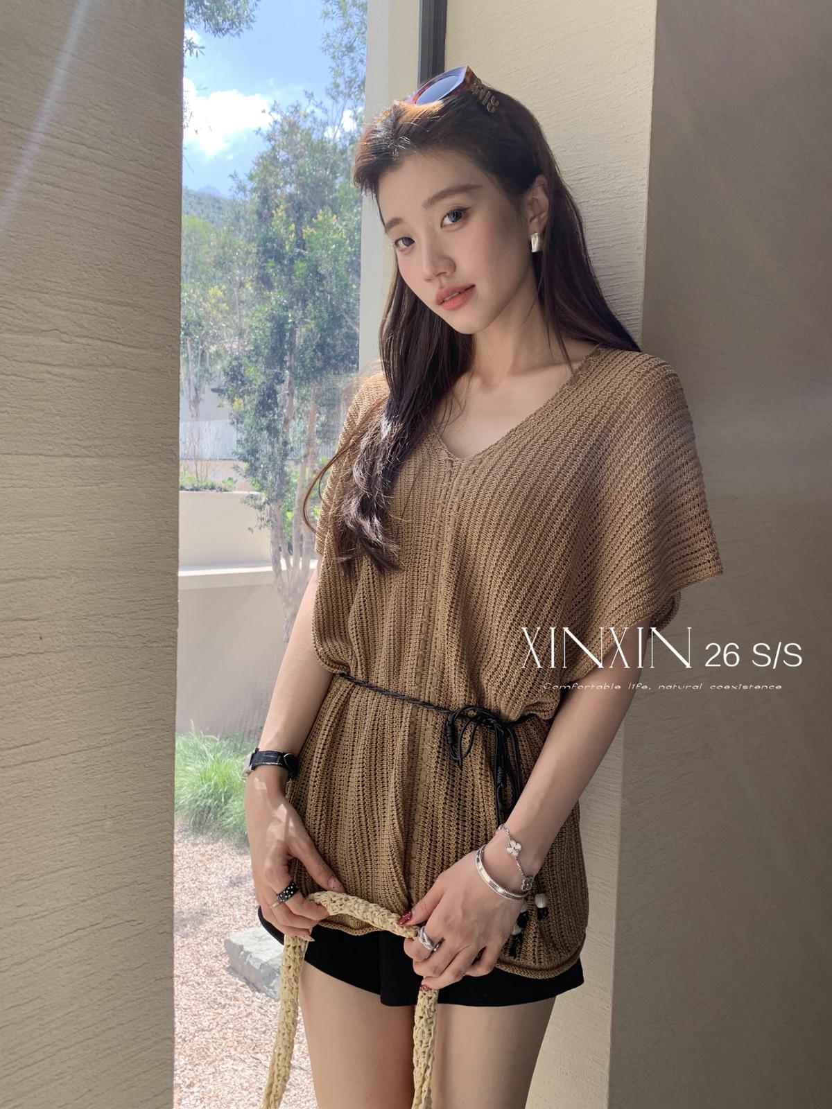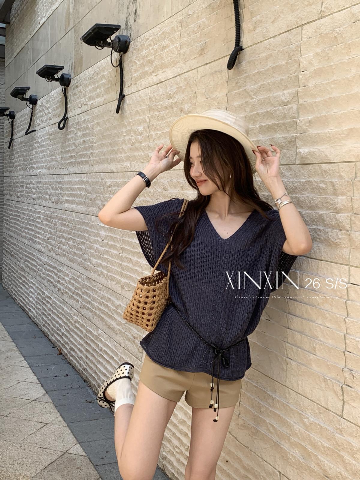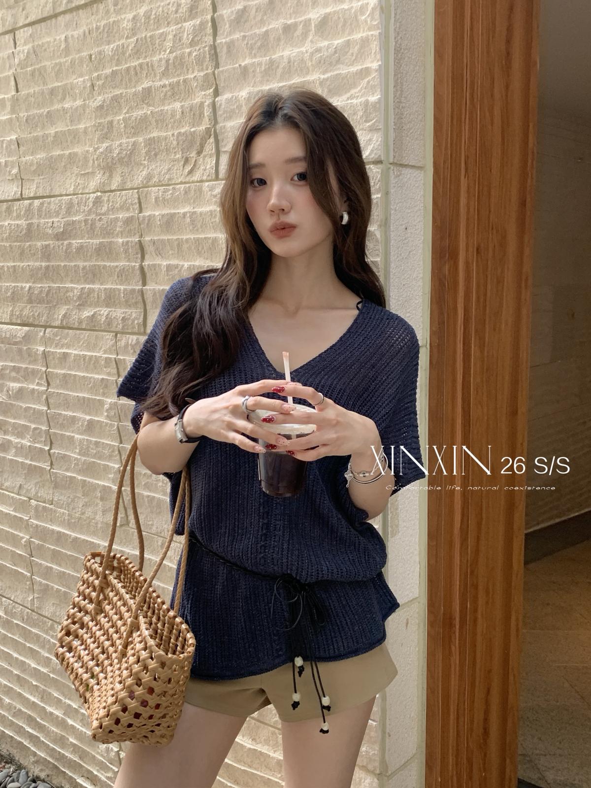 【C8786】“慵懶鬆弛感”韓版簡約V領坑條肌理感寬鬆蝙蝠袖針織衫(配腰繩)