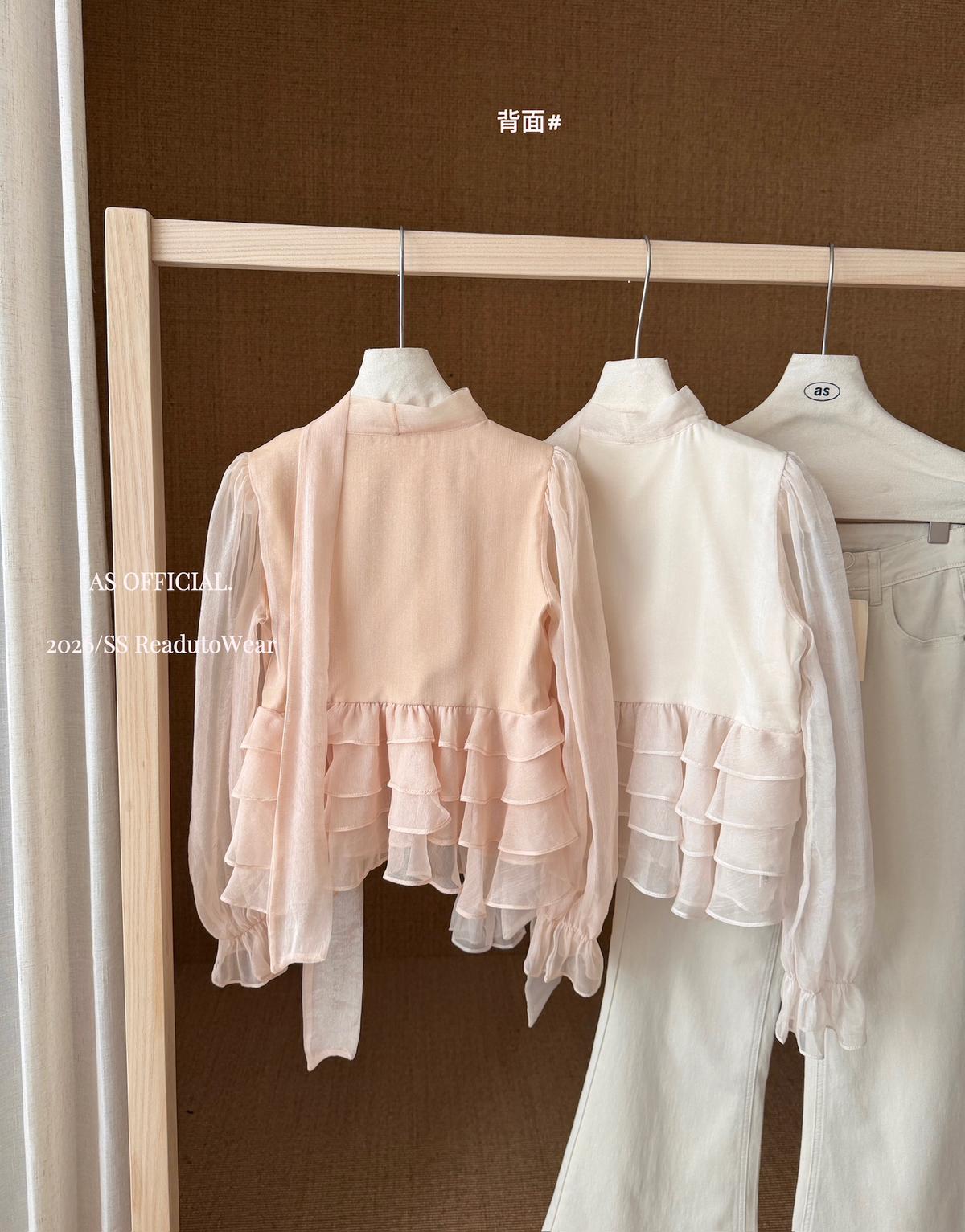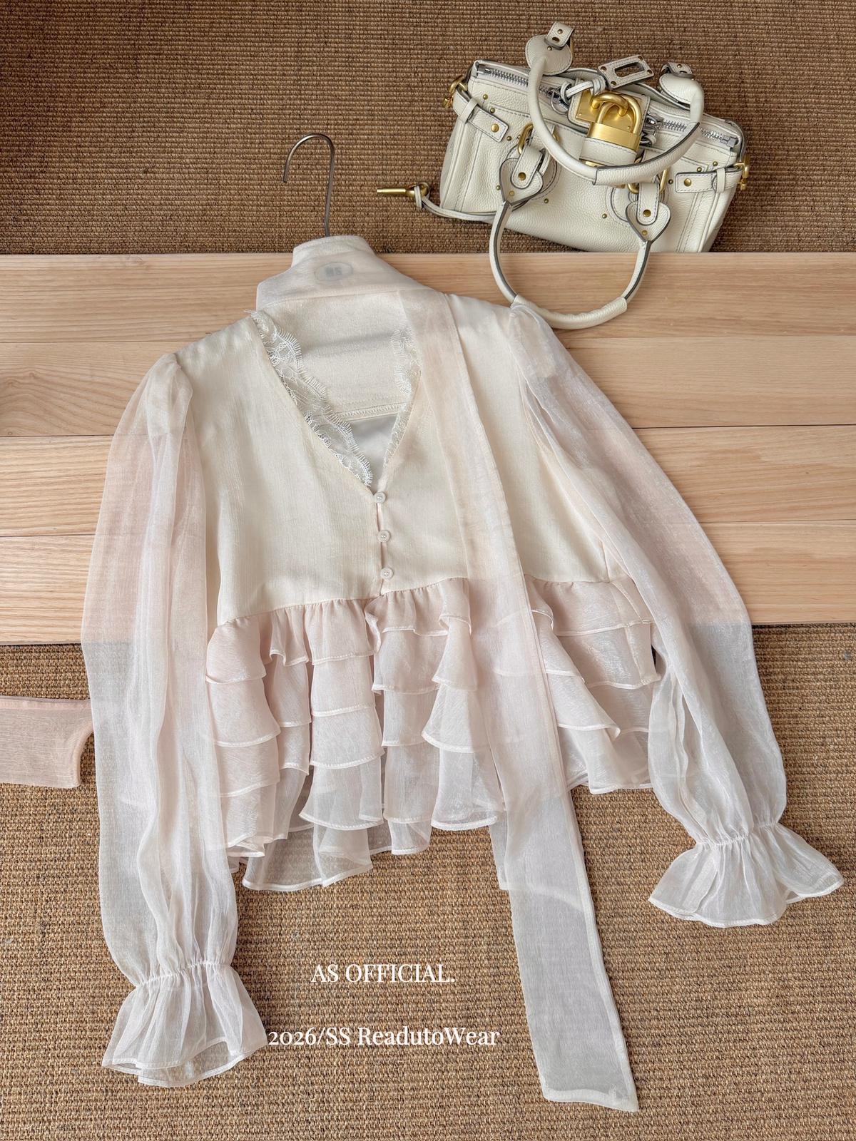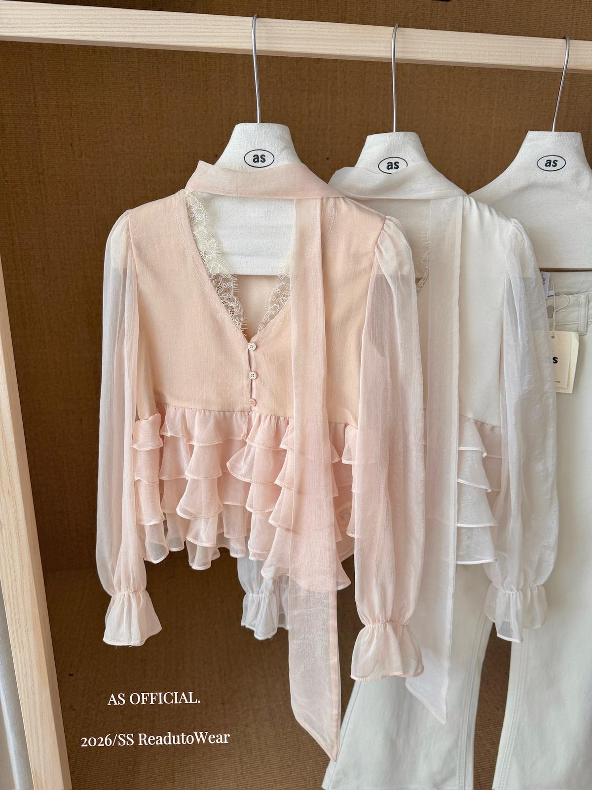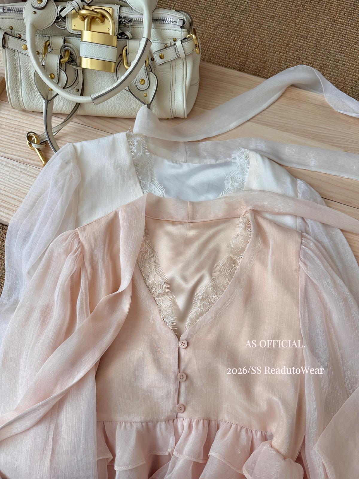 【C8794】高顏品!墜入雲絮的溫柔·爆好賣·重工法蕾荷葉花邊拼接雪紡小衫(配飄帶)(26年早春!)