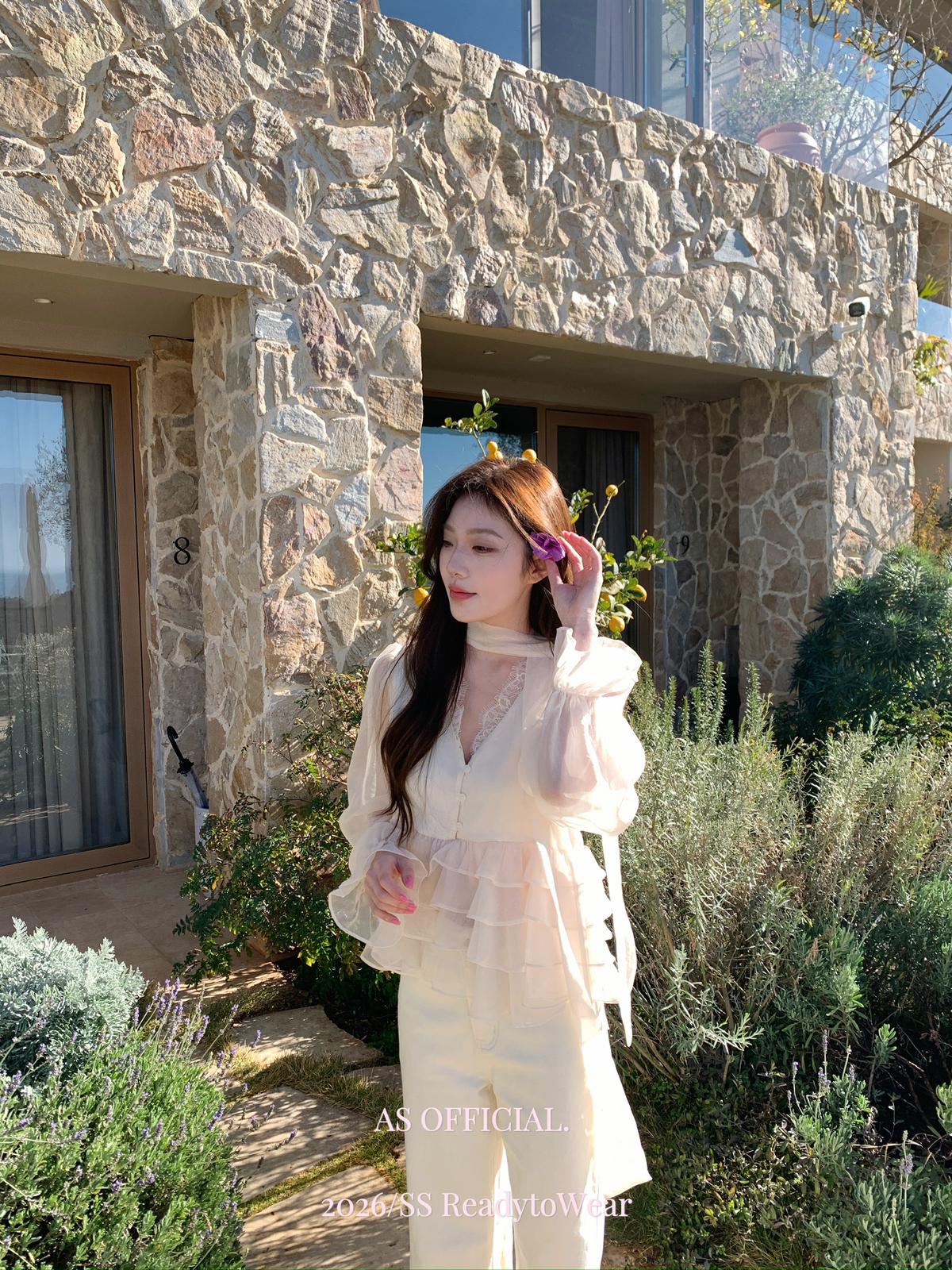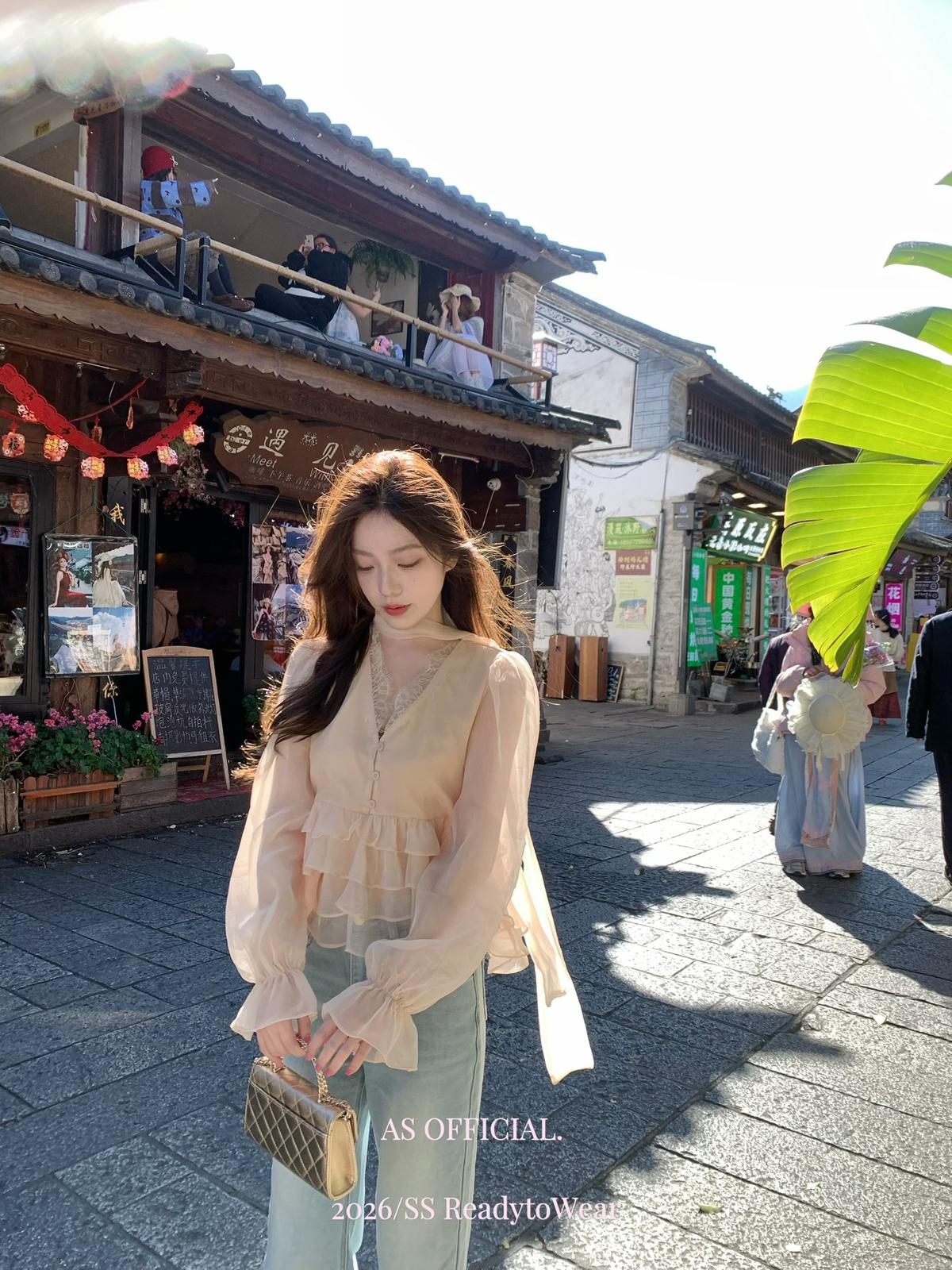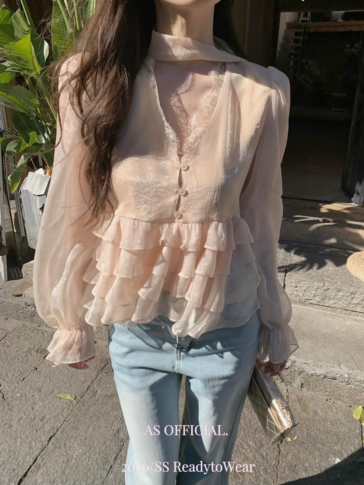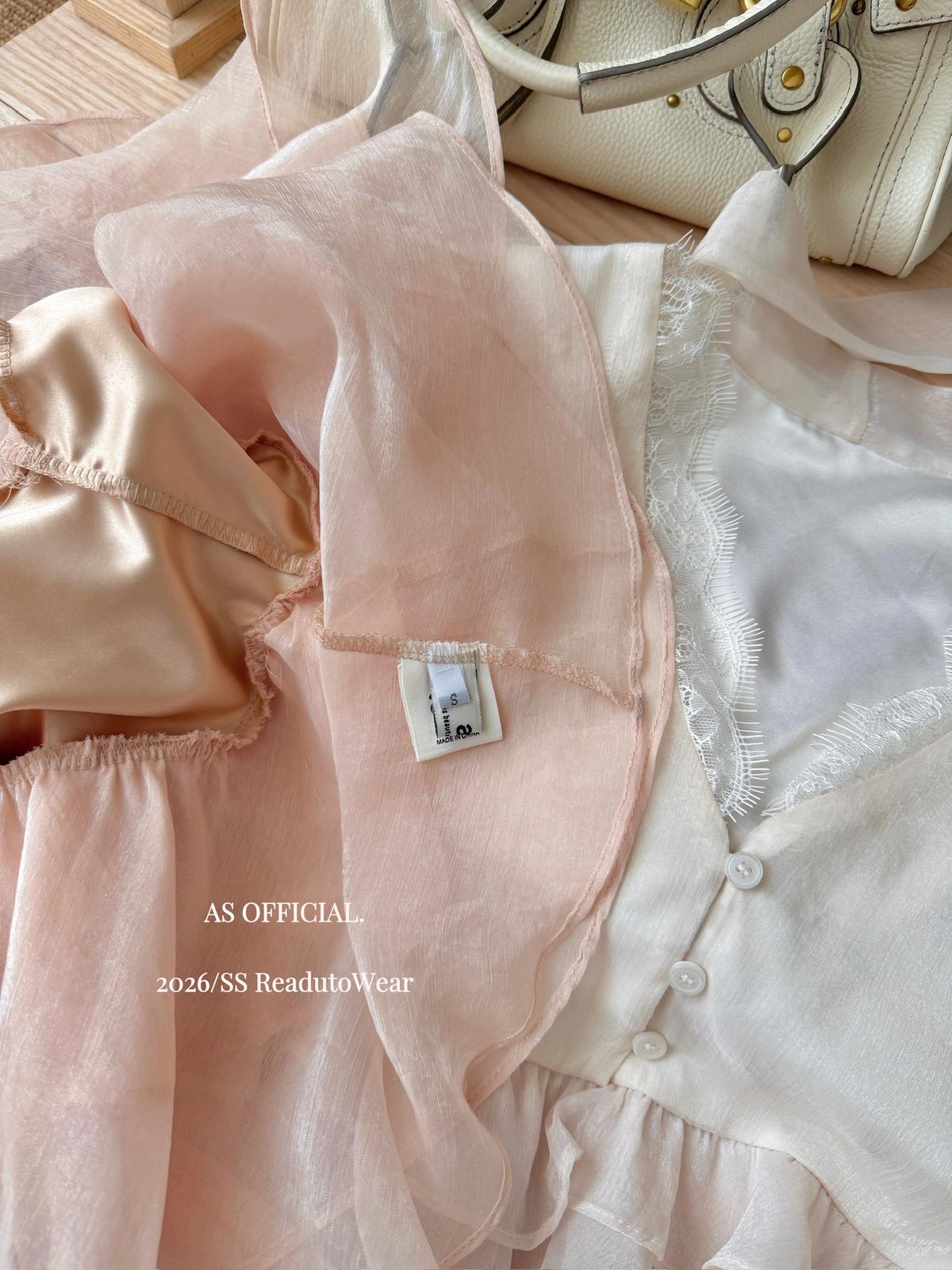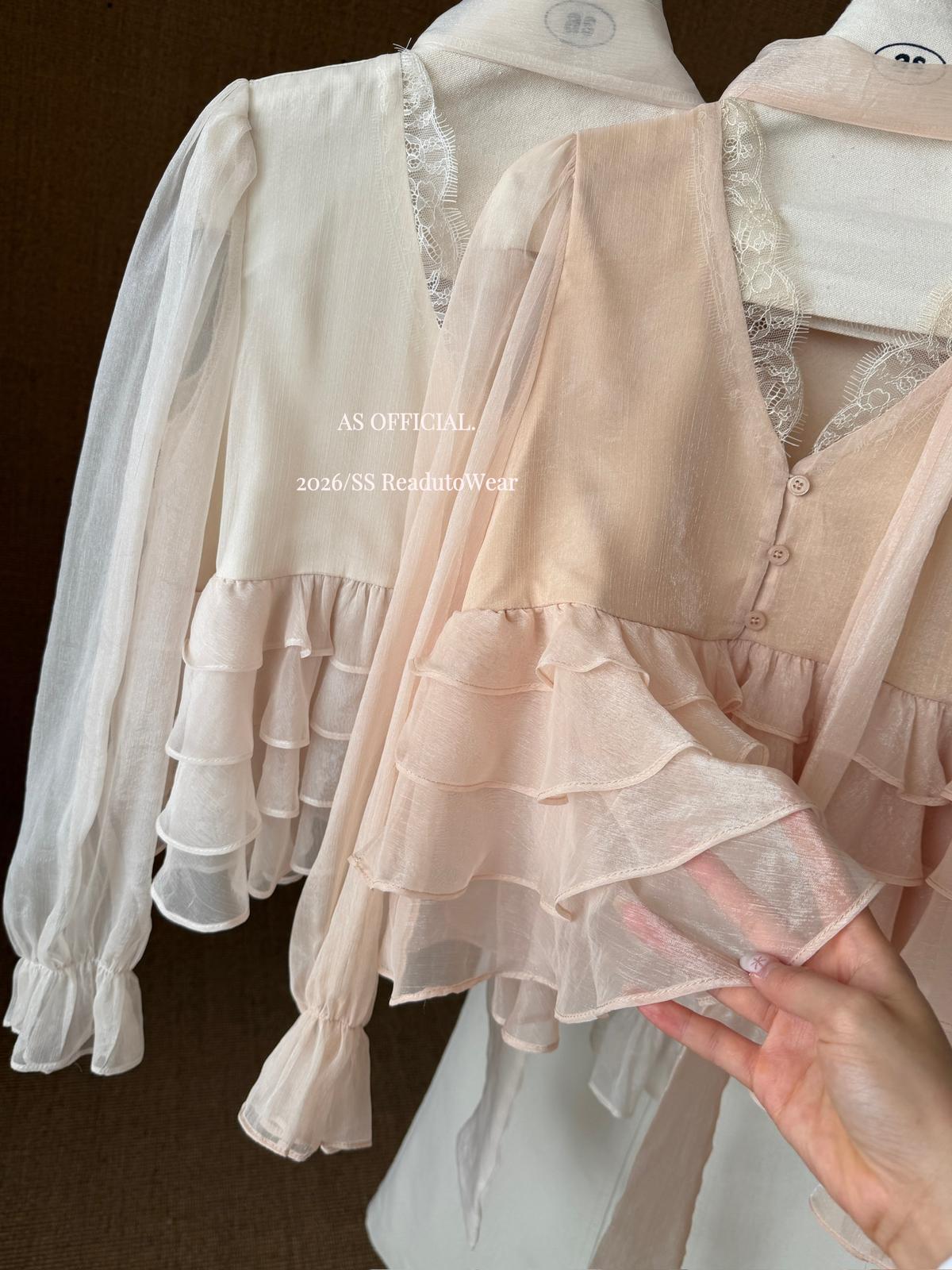 【C8794】高顏品!墜入雲絮的溫柔·爆好賣·重工法蕾荷葉花邊拼接雪紡小衫(配飄帶)(26年早春!)