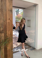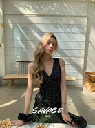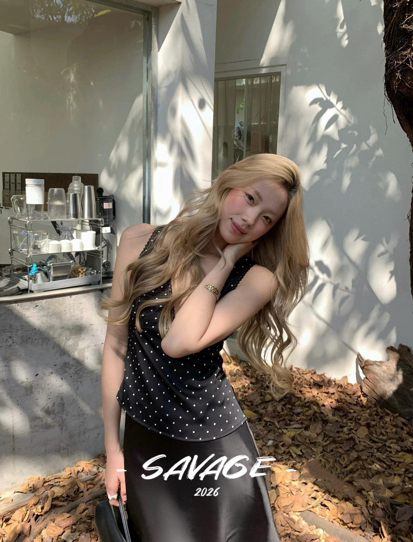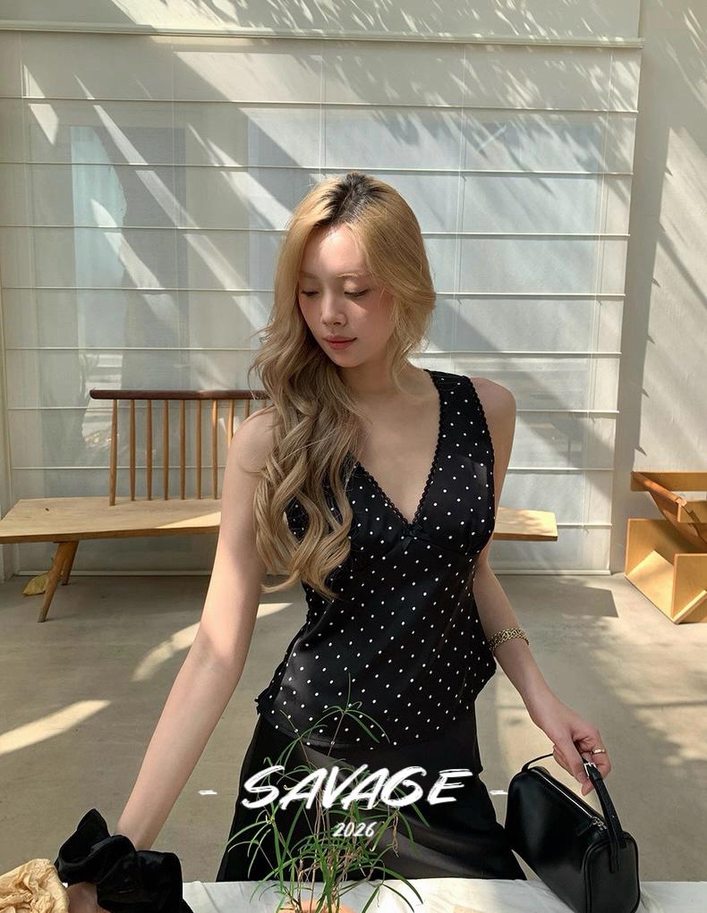 【C8829】純欲氣質小女人V領撞色波點印花蕾絲花邊拼接繫帶收腰背心