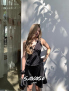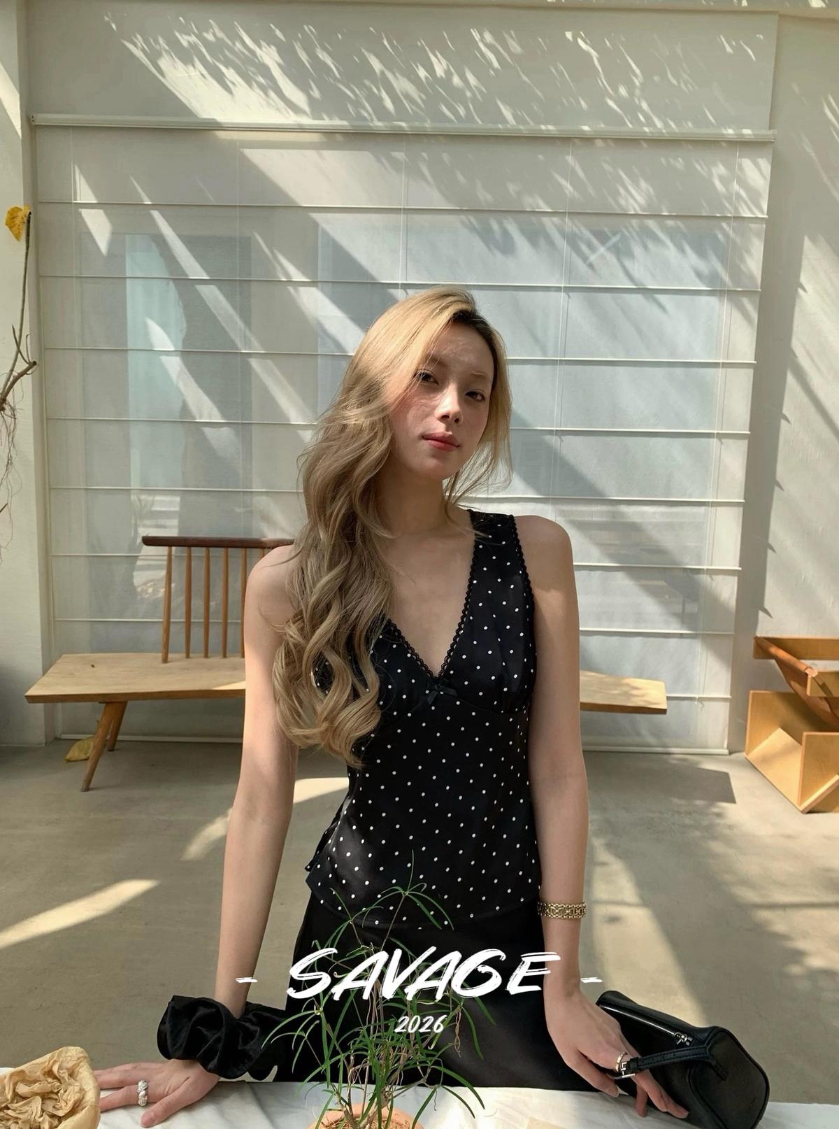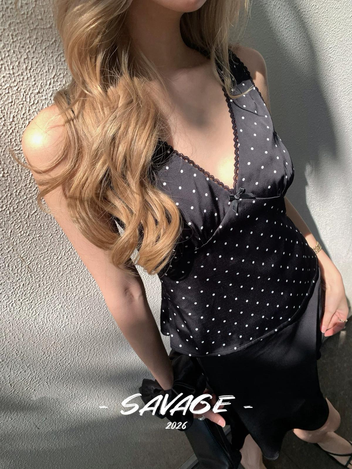 3. 【C8829】純欲氣質小女人V領撞色波點印花蕾絲花邊拼接繫帶收腰背心