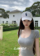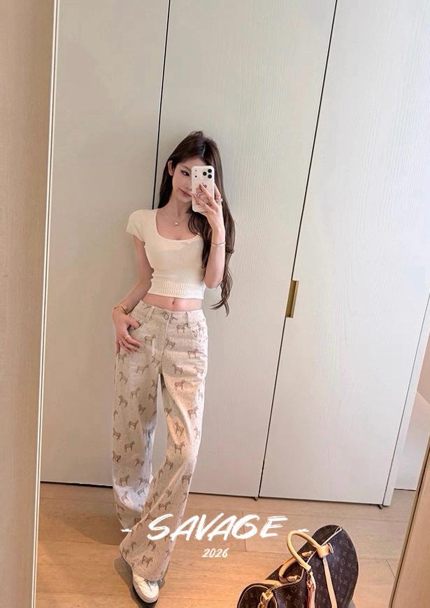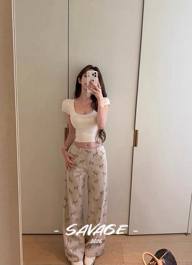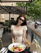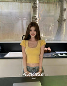 【C8830】洋氣百搭純色U領提花收腰修身顯瘦短袖針織衫