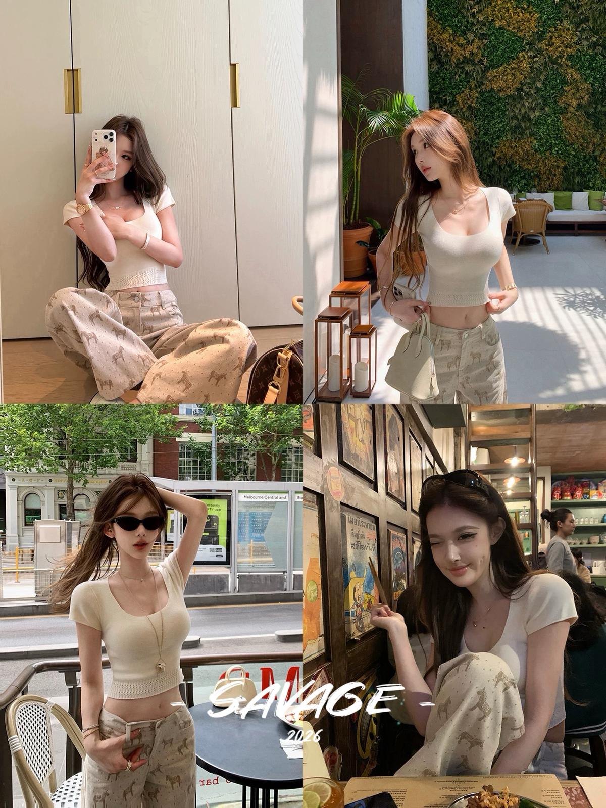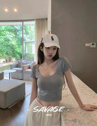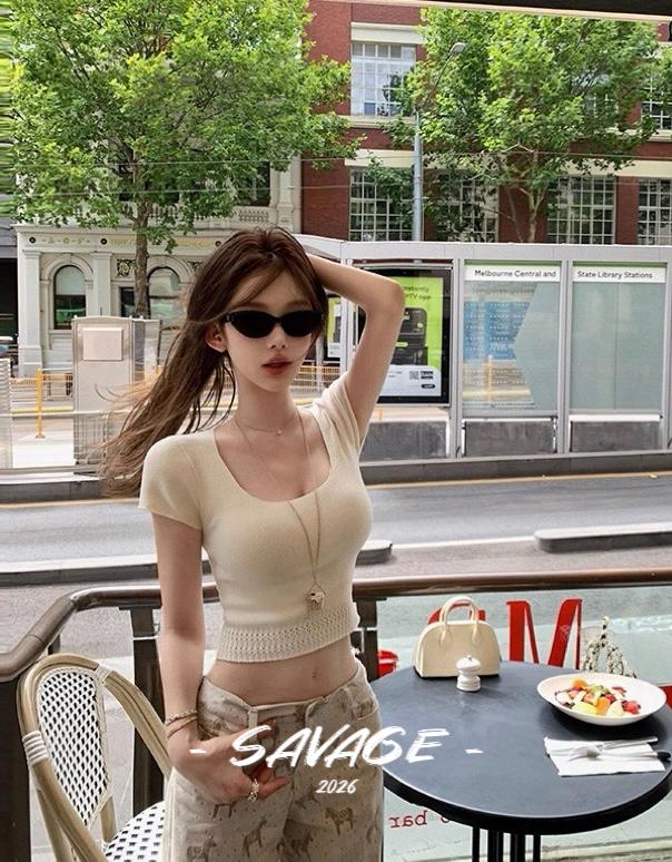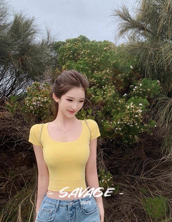 3. 【C8830】洋氣百搭純色U領提花收腰修身顯瘦短袖針織衫