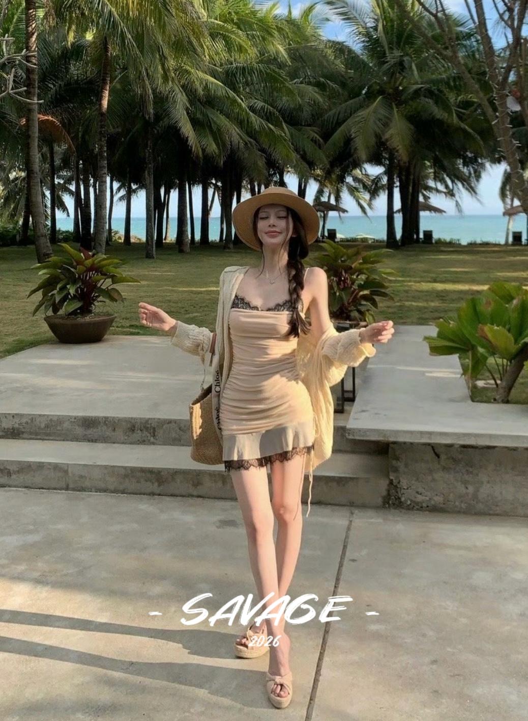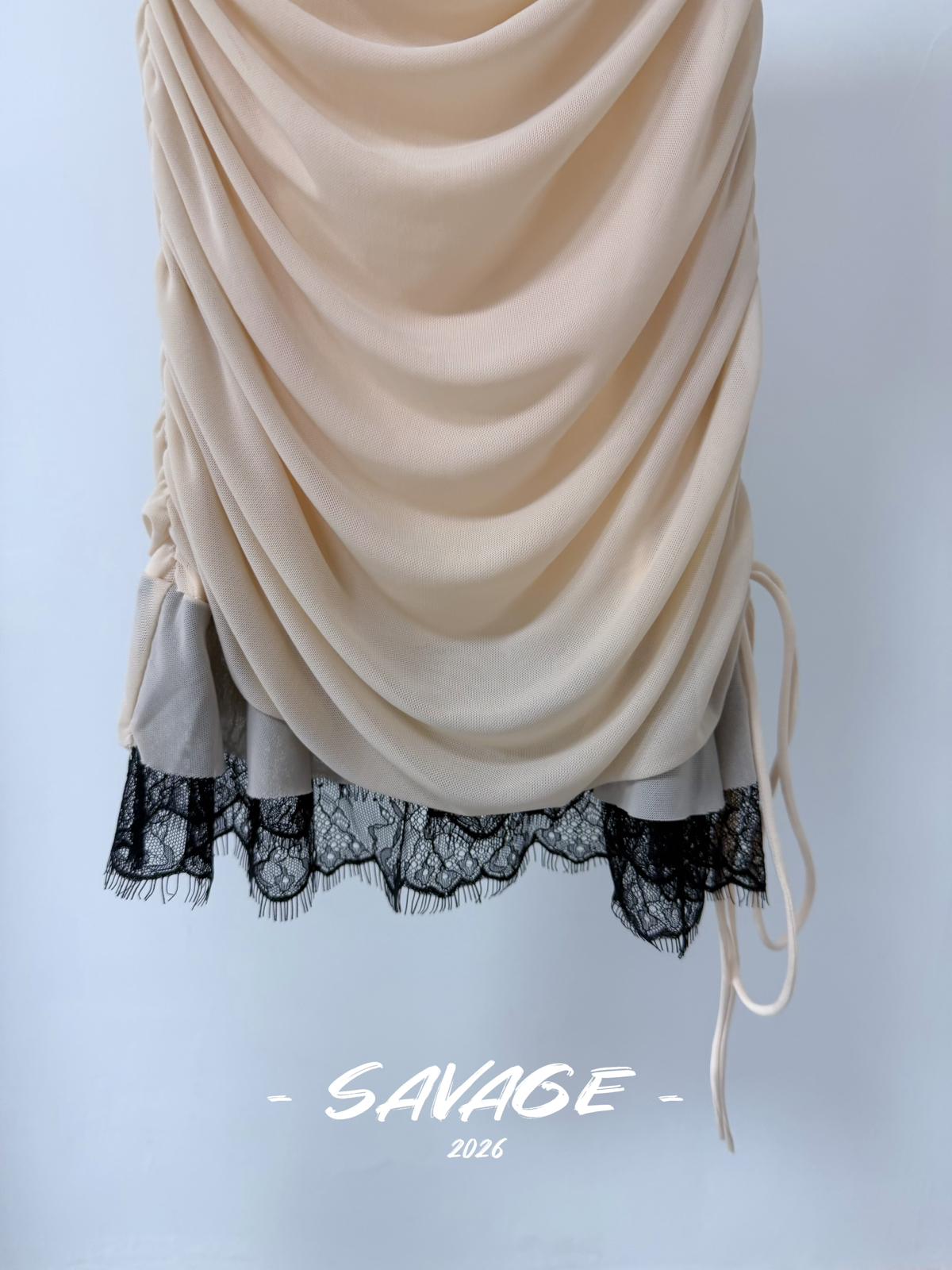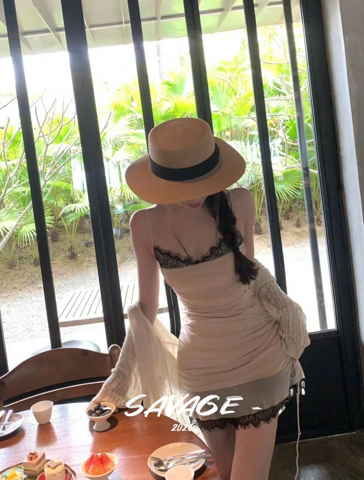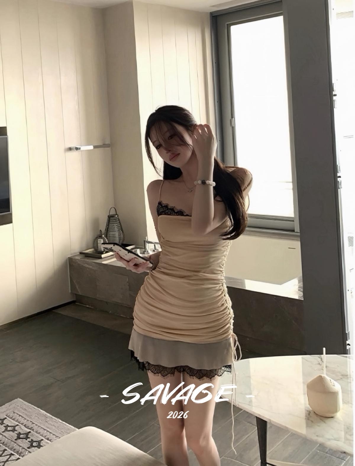 【C8831】法式純欲小女人蕾絲拼接撞色抽褶抽繩吊帶連衣裙