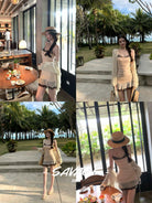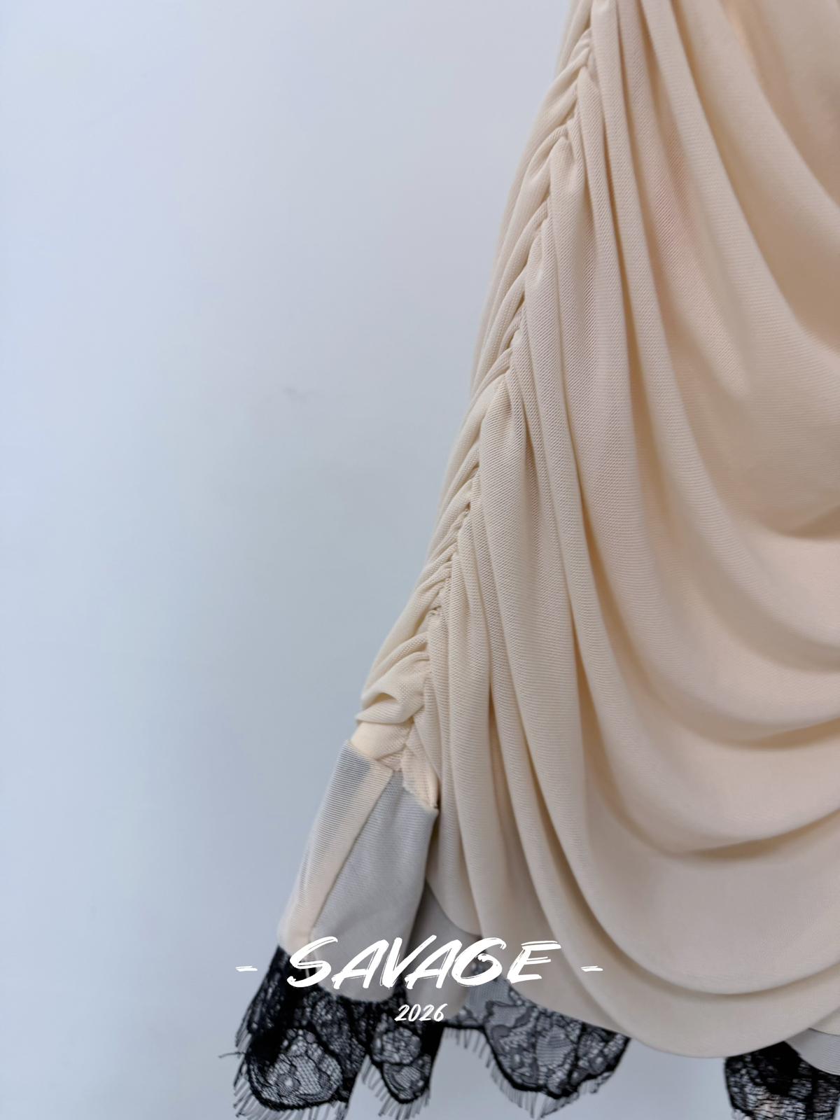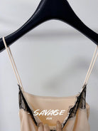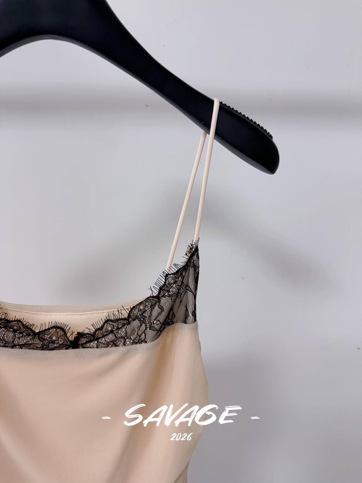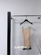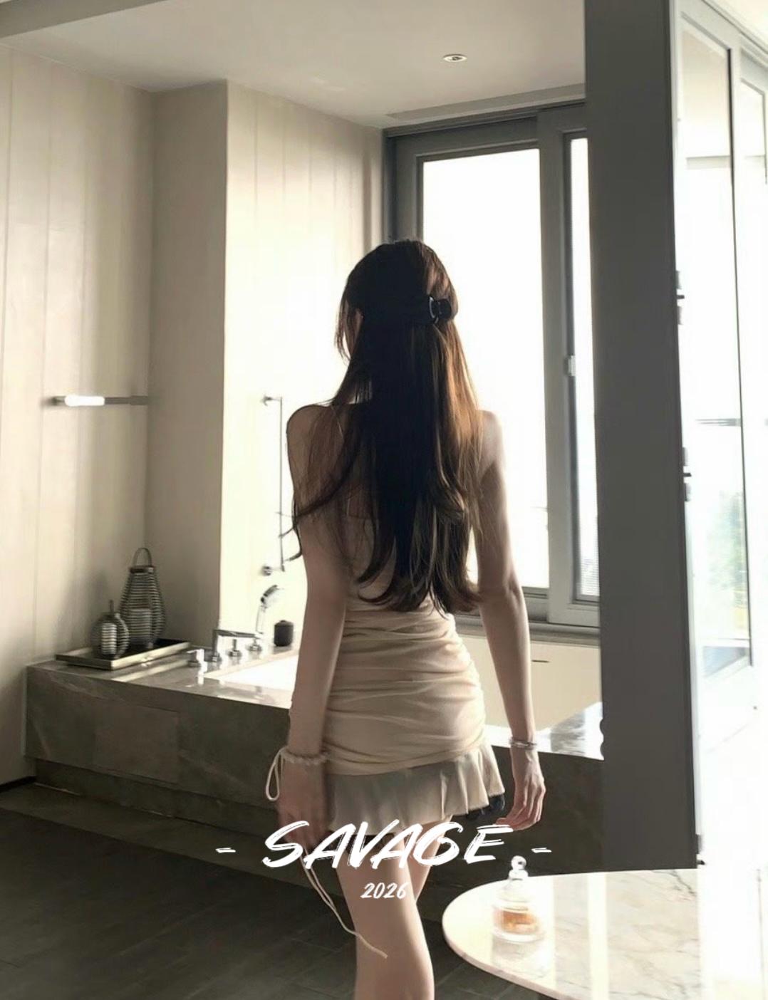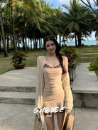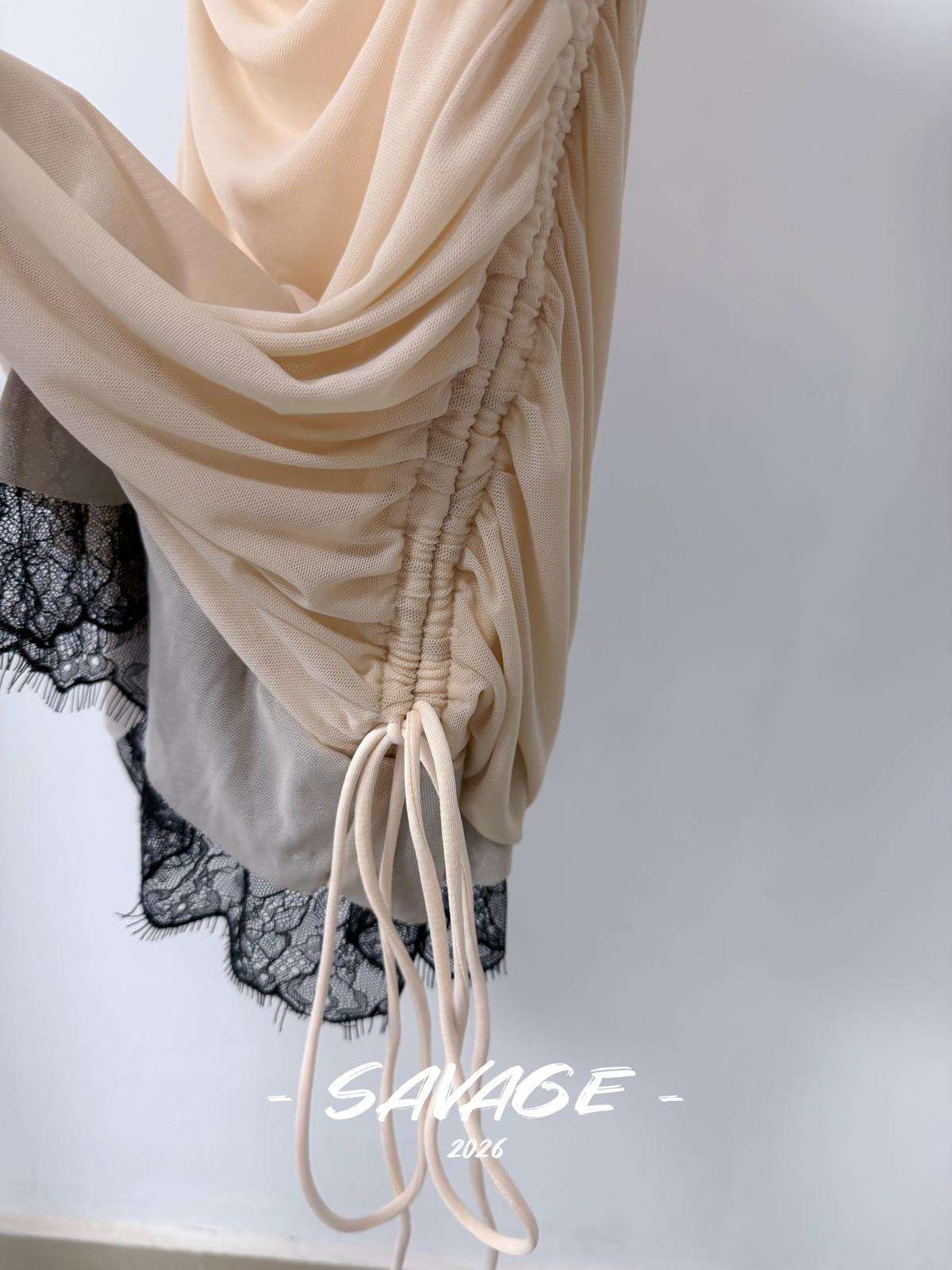 【C8831】法式純欲小女人蕾絲拼接撞色抽褶抽繩吊帶連衣裙