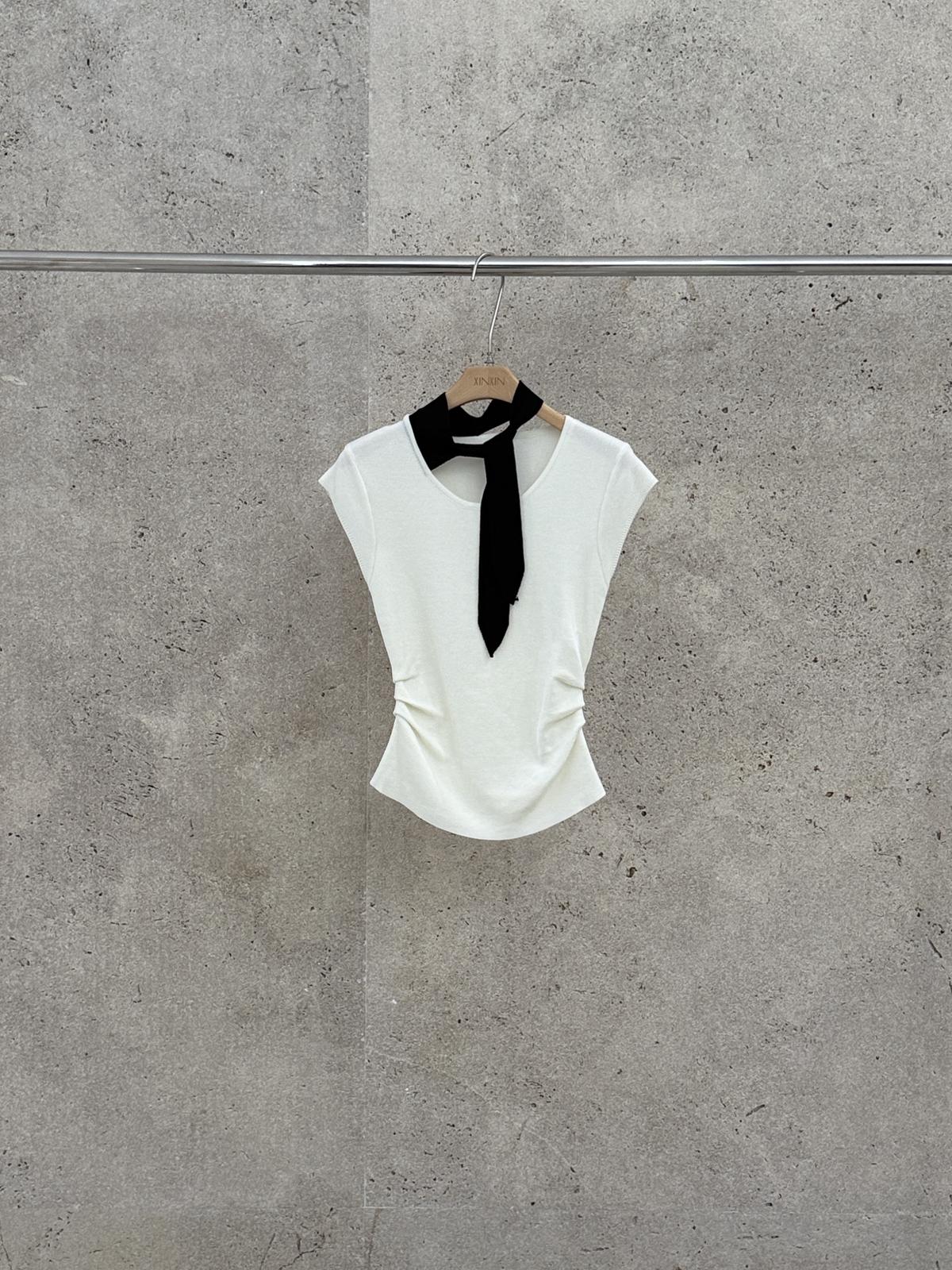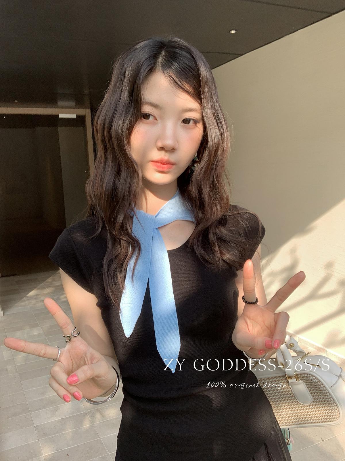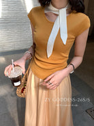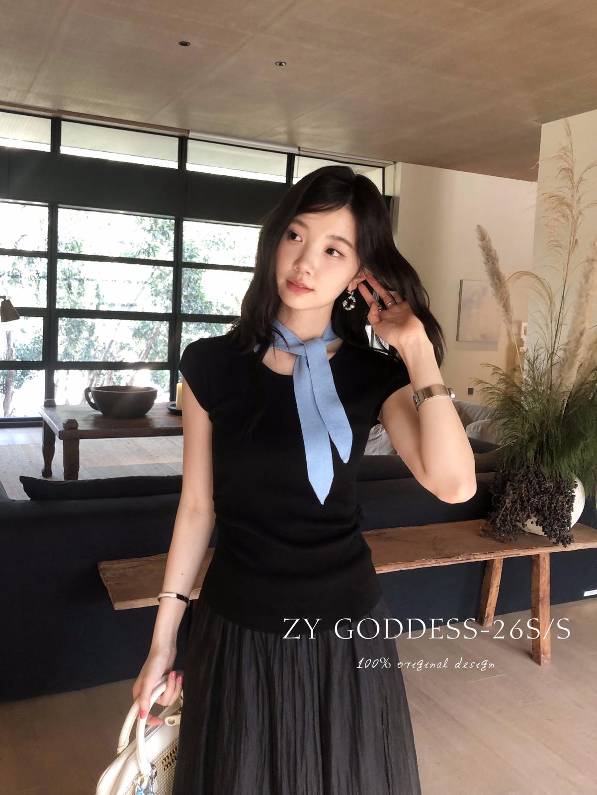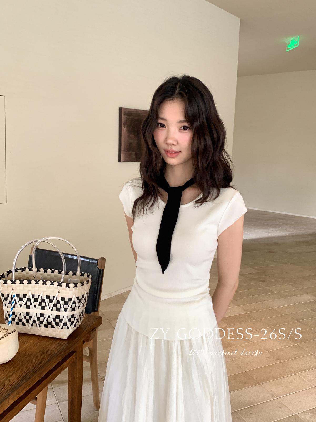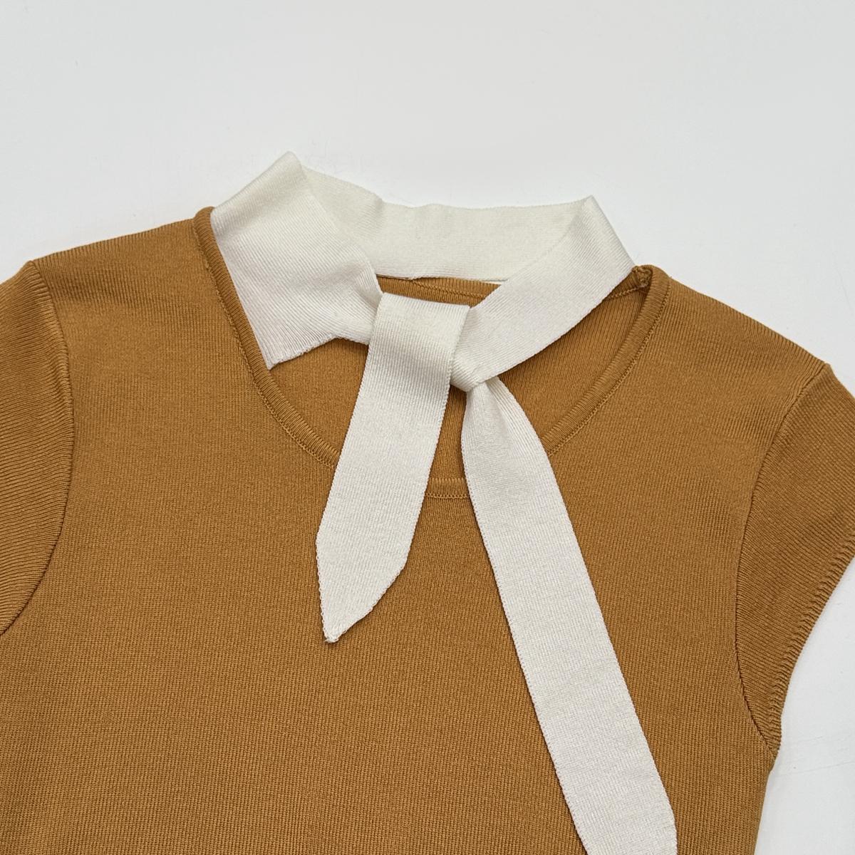 【C8833】韓系文藝範拼接撞色飄帶褶皺收腰顯瘦短袖針織衫(領帶不可拆)