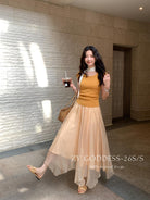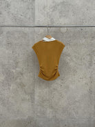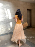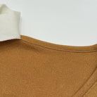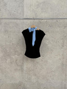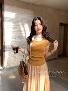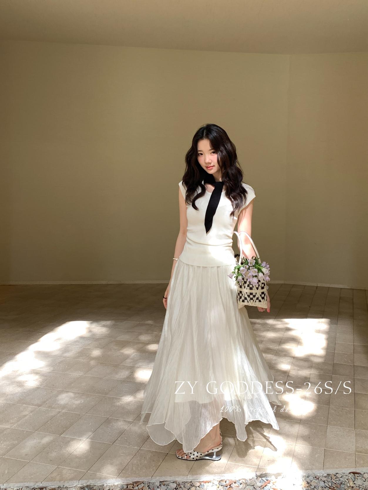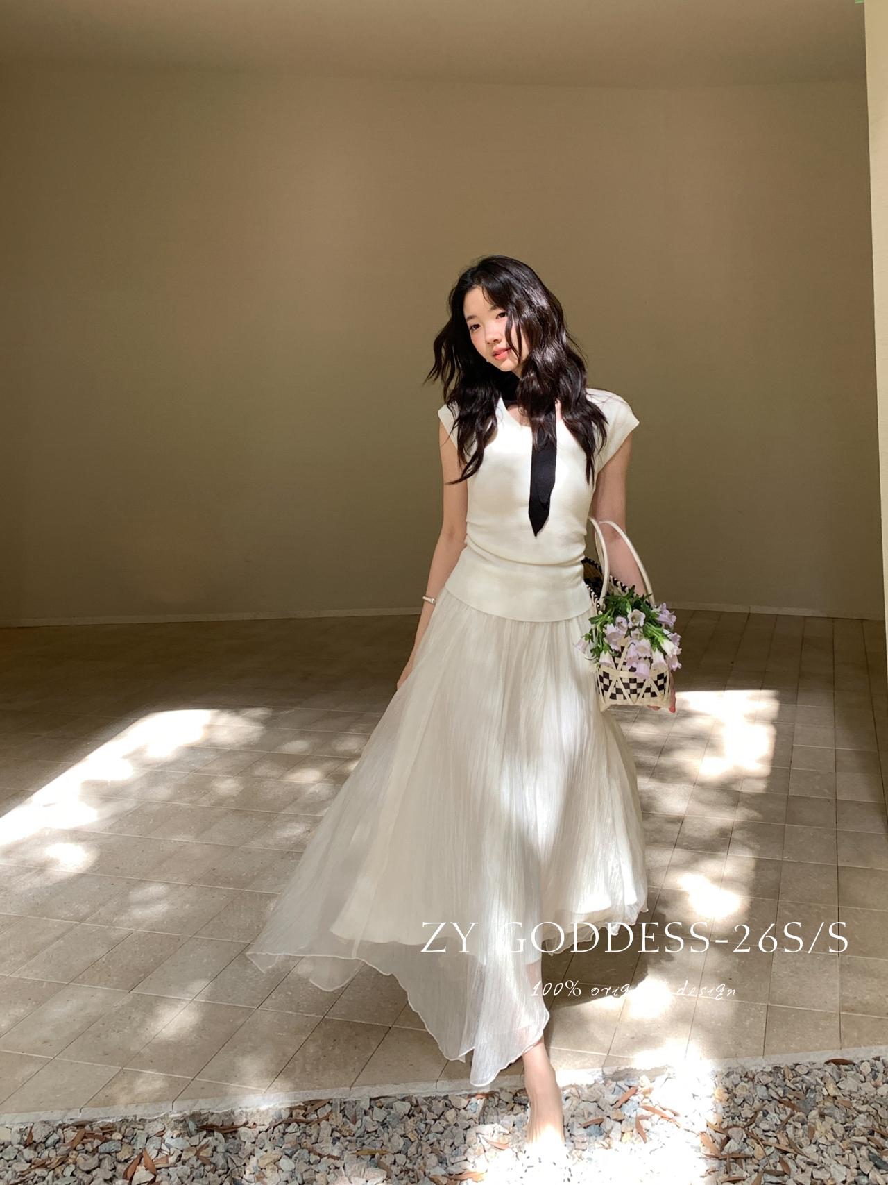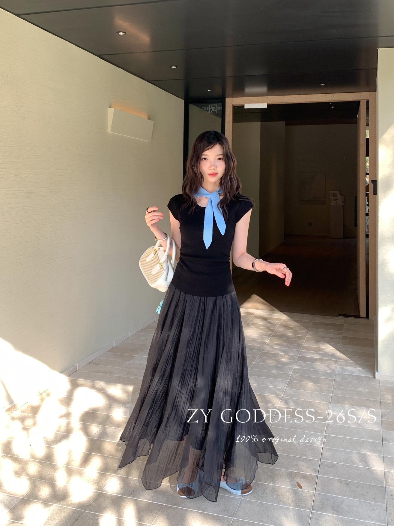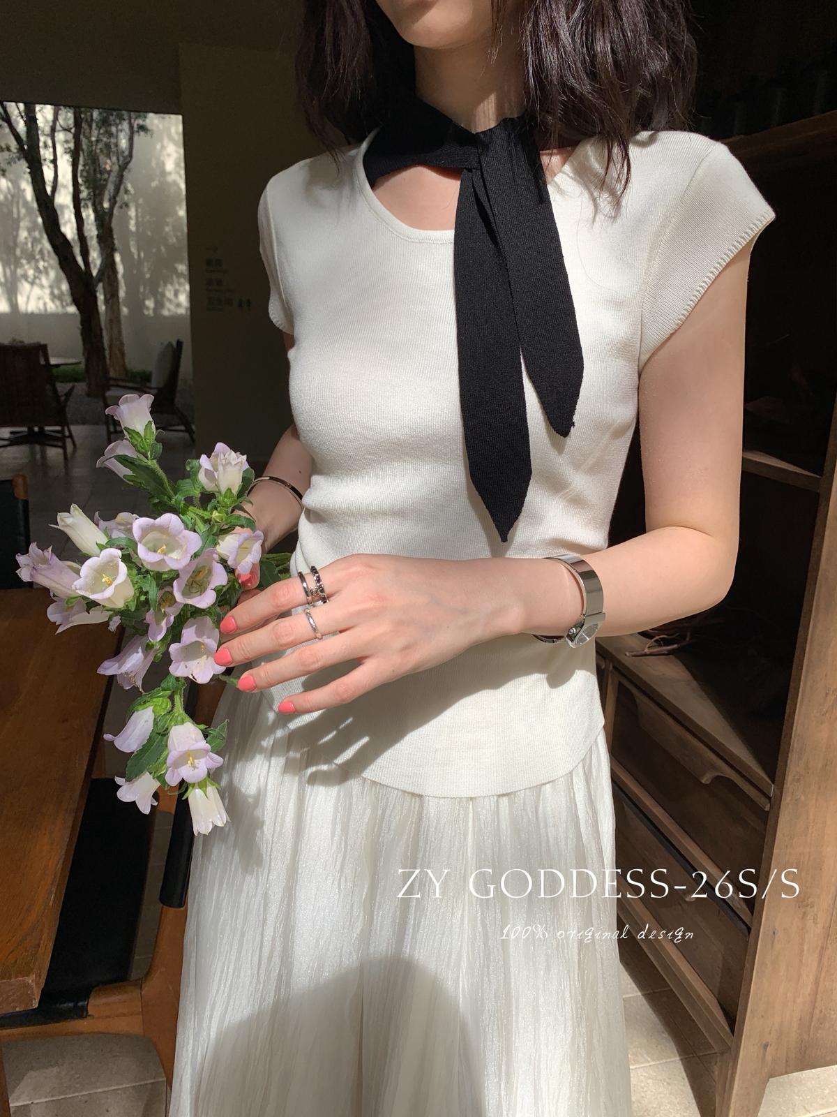 【C8833】韓系文藝範拼接撞色飄帶褶皺收腰顯瘦短袖針織衫(領帶不可拆)