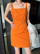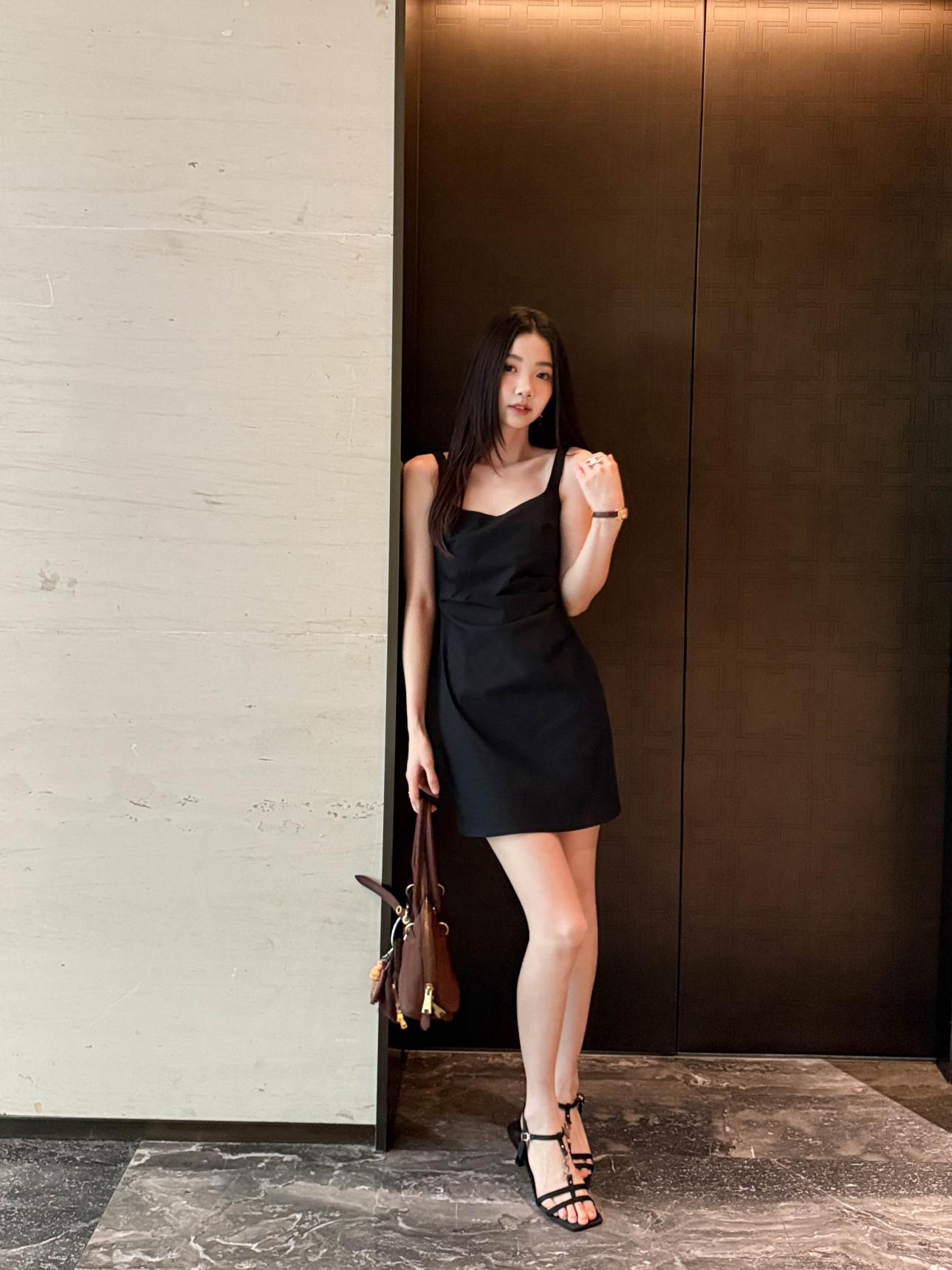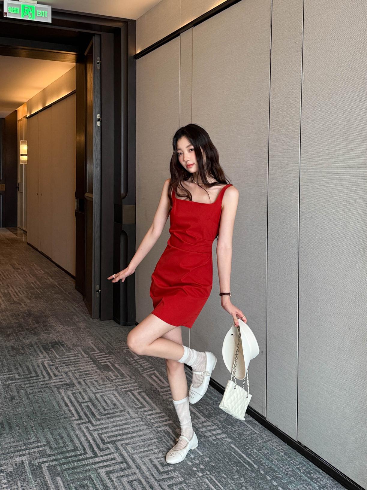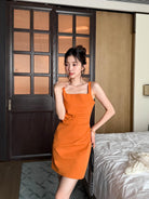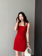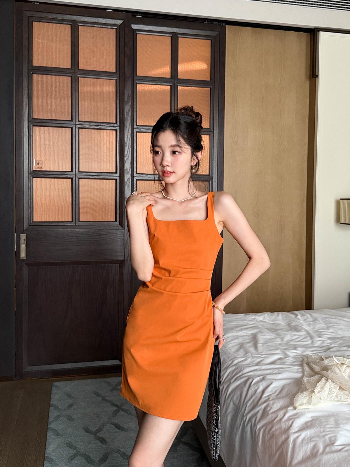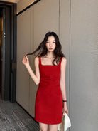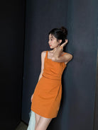 【C8834】韓版氣質網紅方領修身褶皺顯瘦基礎吊帶連衣裙