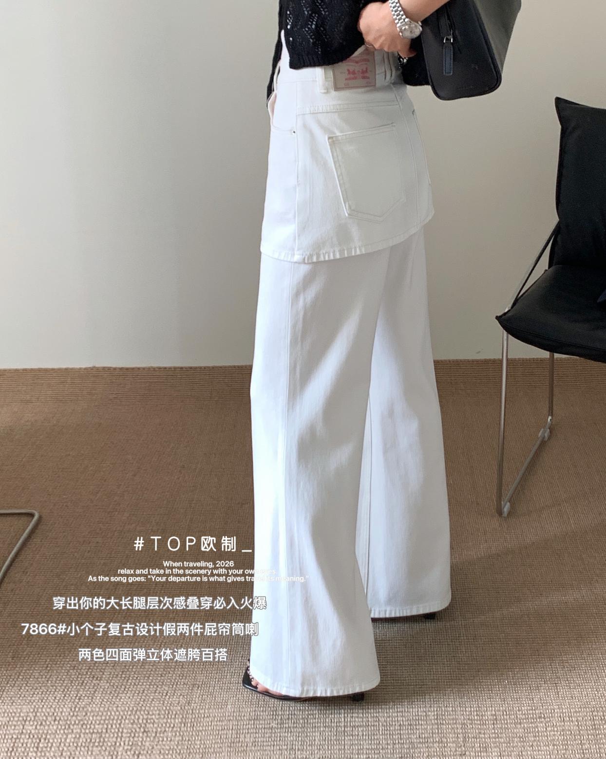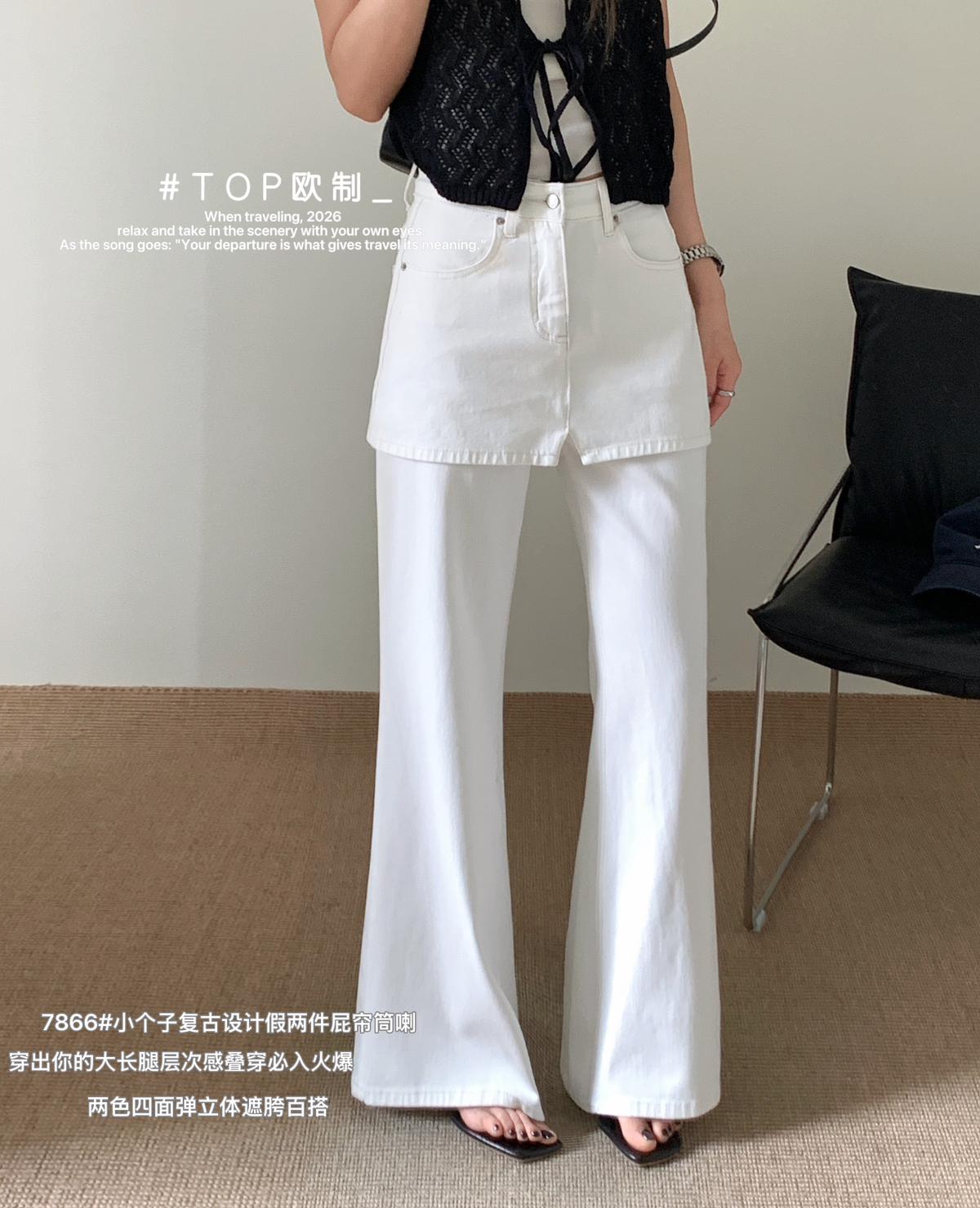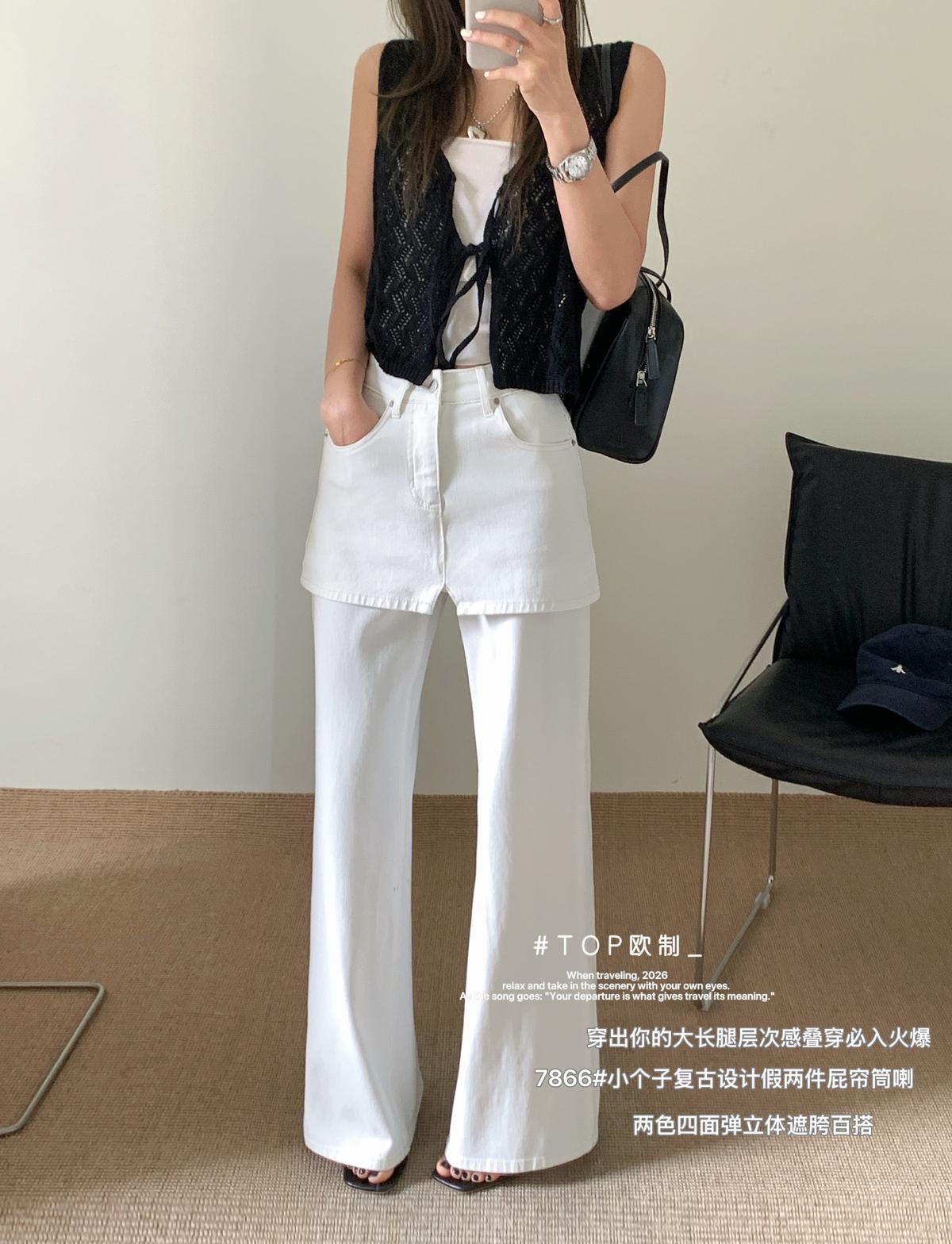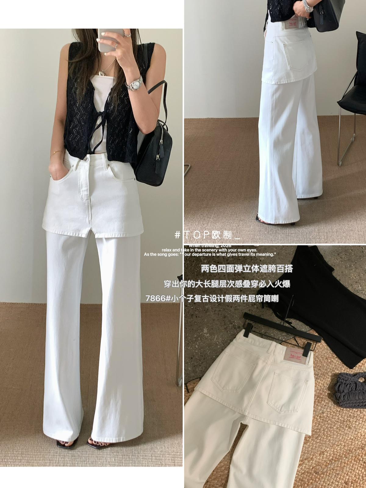 【C8899】韓版百搭層次感疊穿小個子復古假兩件屁簾四面彈筒喇牛仔褲