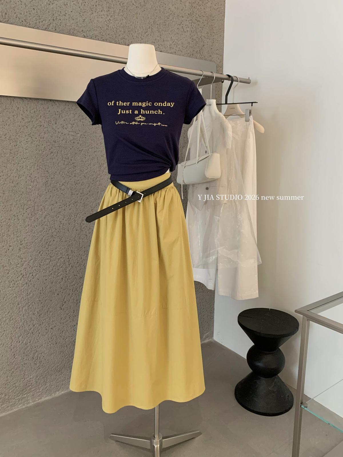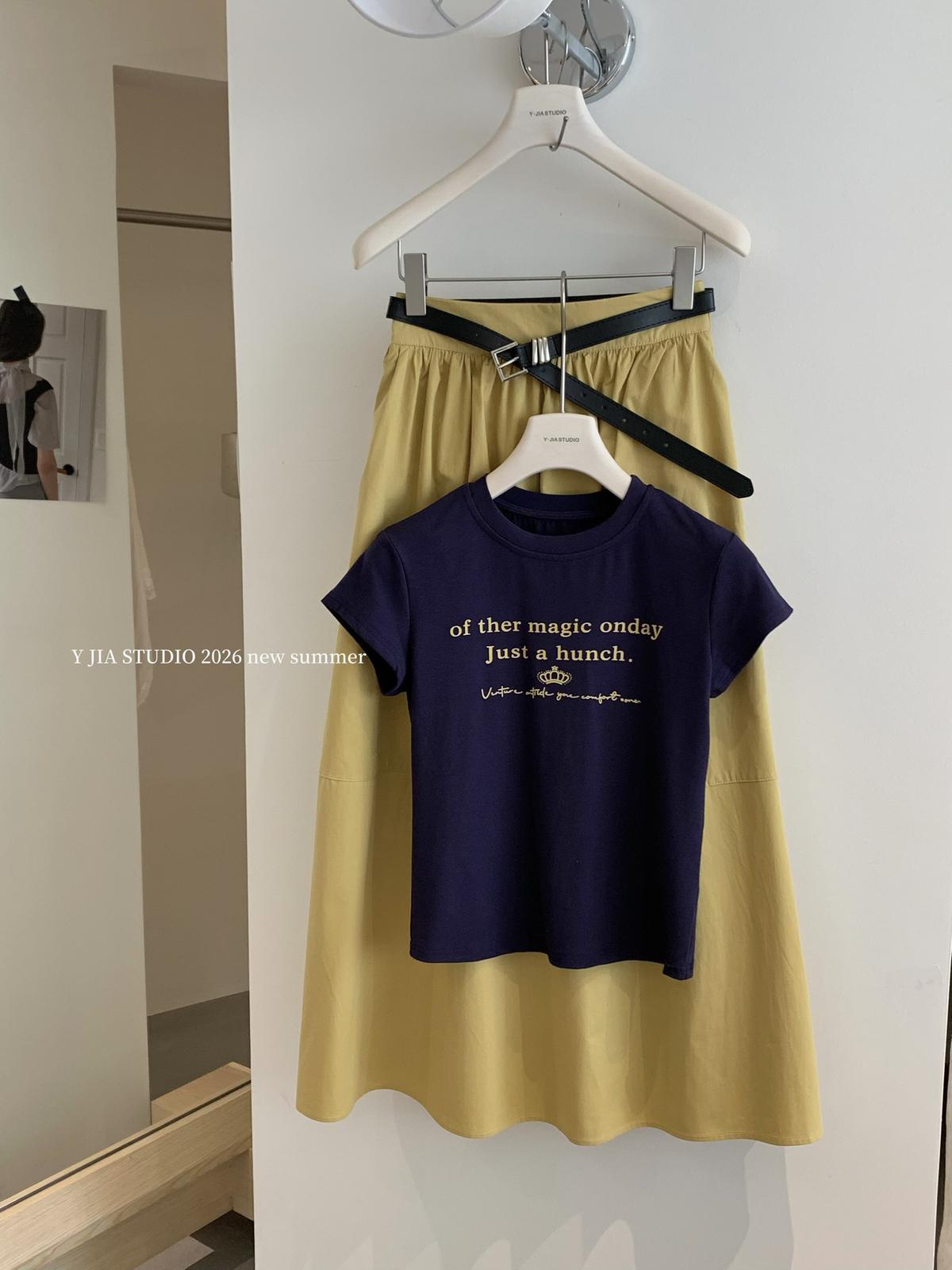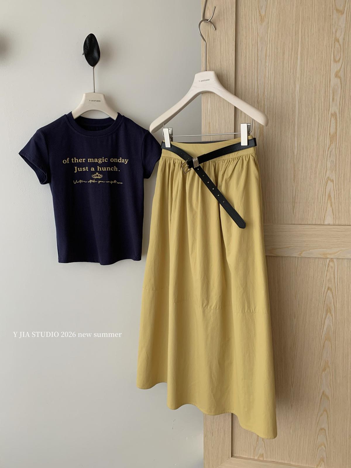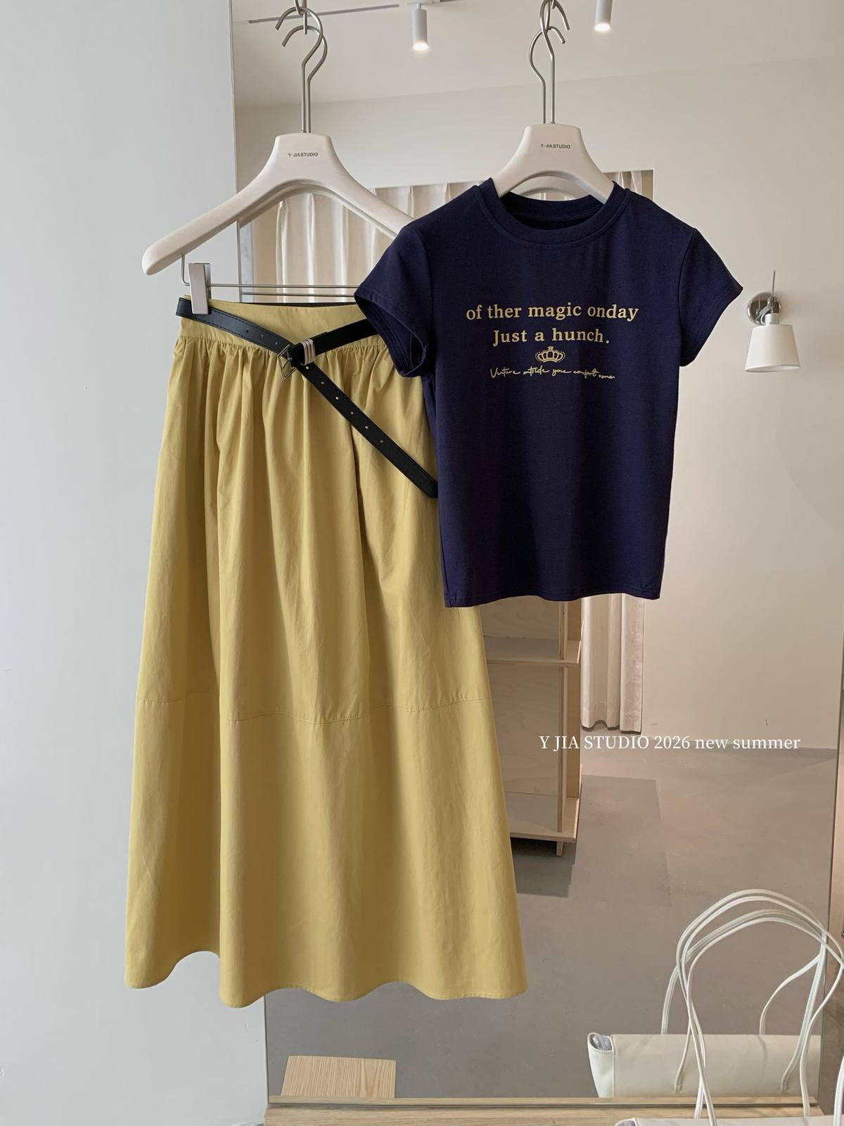 3. 【C8910】仲夏清涼美式復古撞色印花修身短袖T恤+高腰壓褶a字半裙兩件套套裝(配腰帶)