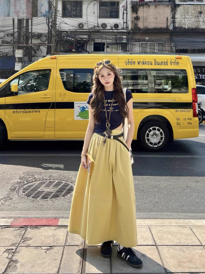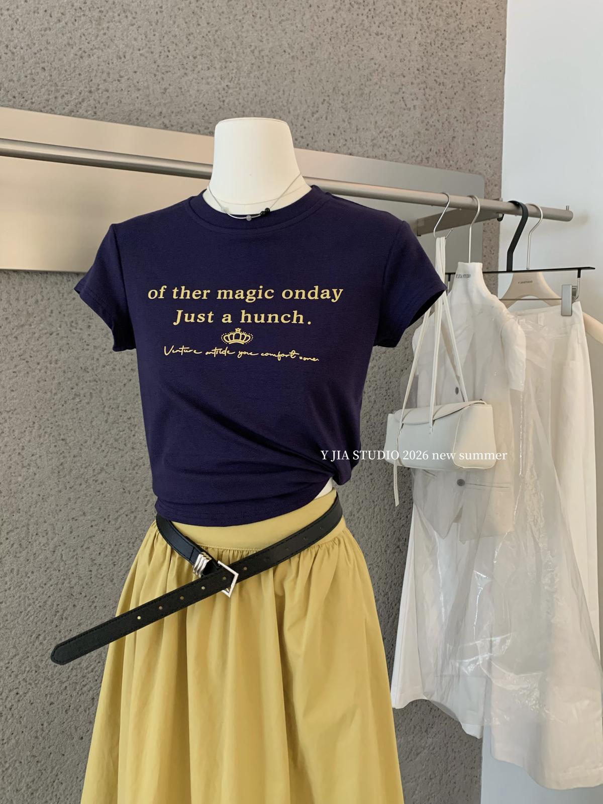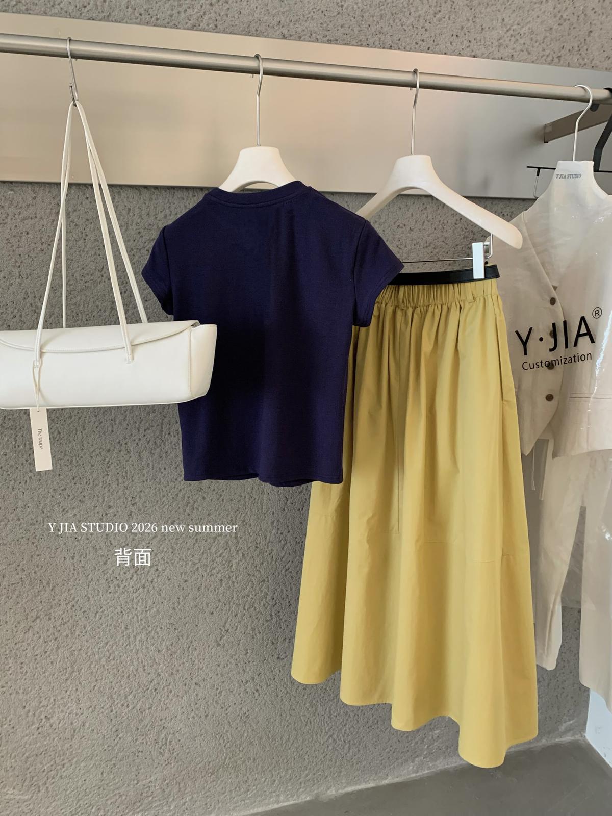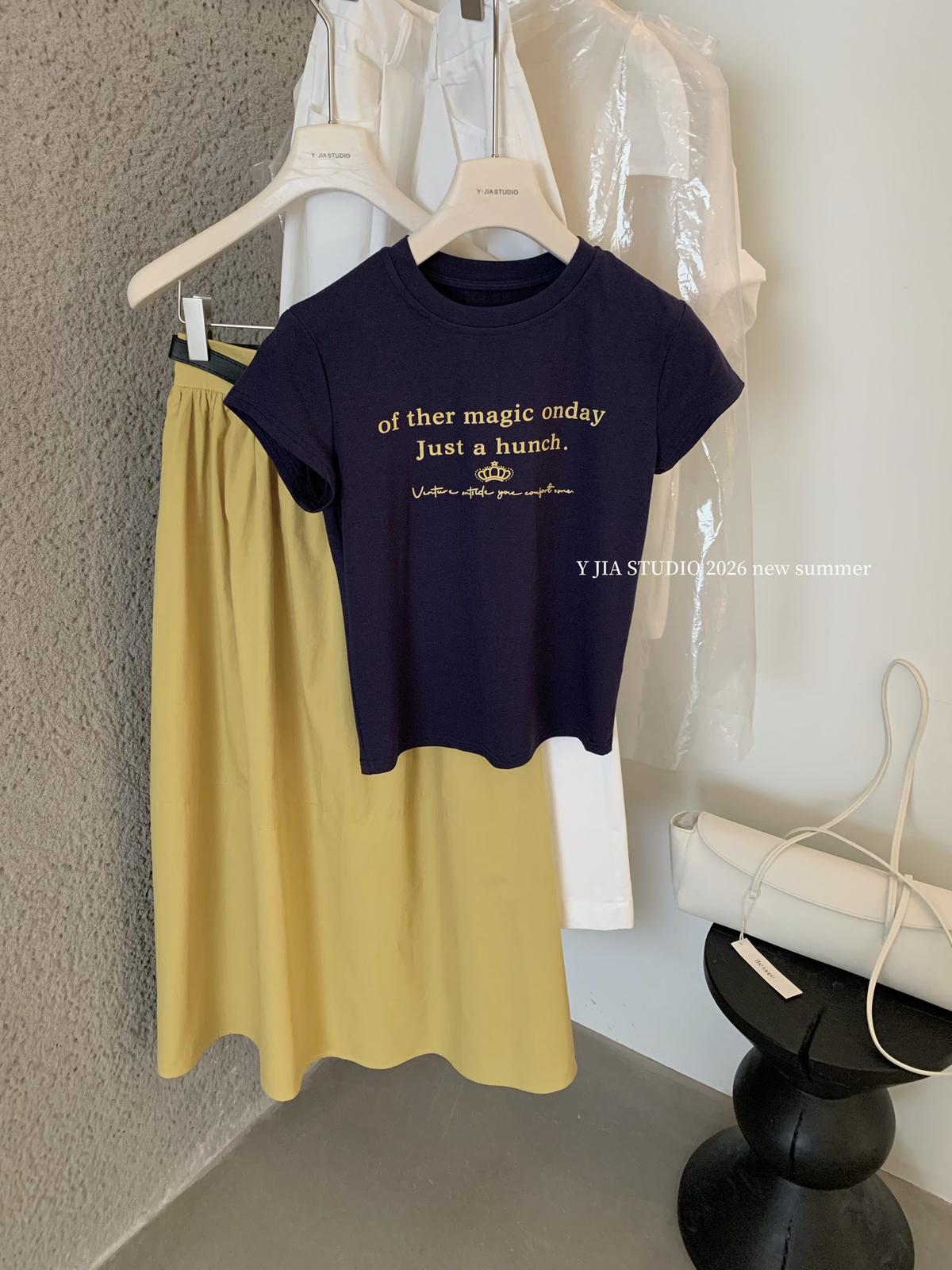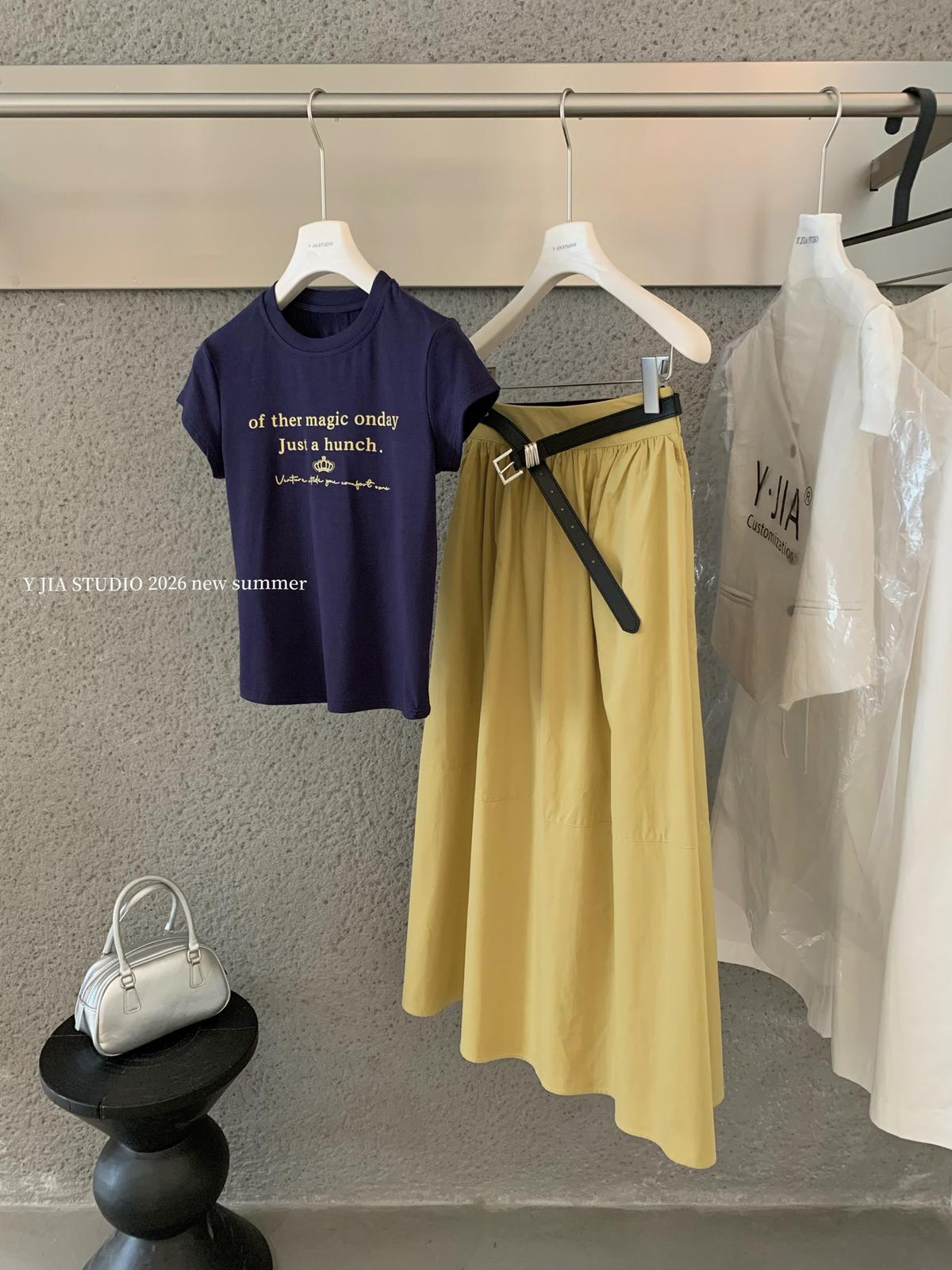 3. 【C8910】仲夏清涼美式復古撞色印花修身短袖T恤+高腰壓褶a字半裙兩件套套裝(配腰帶)