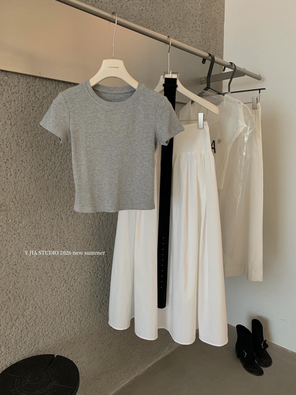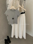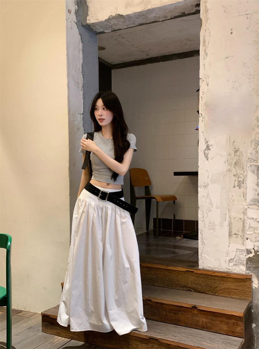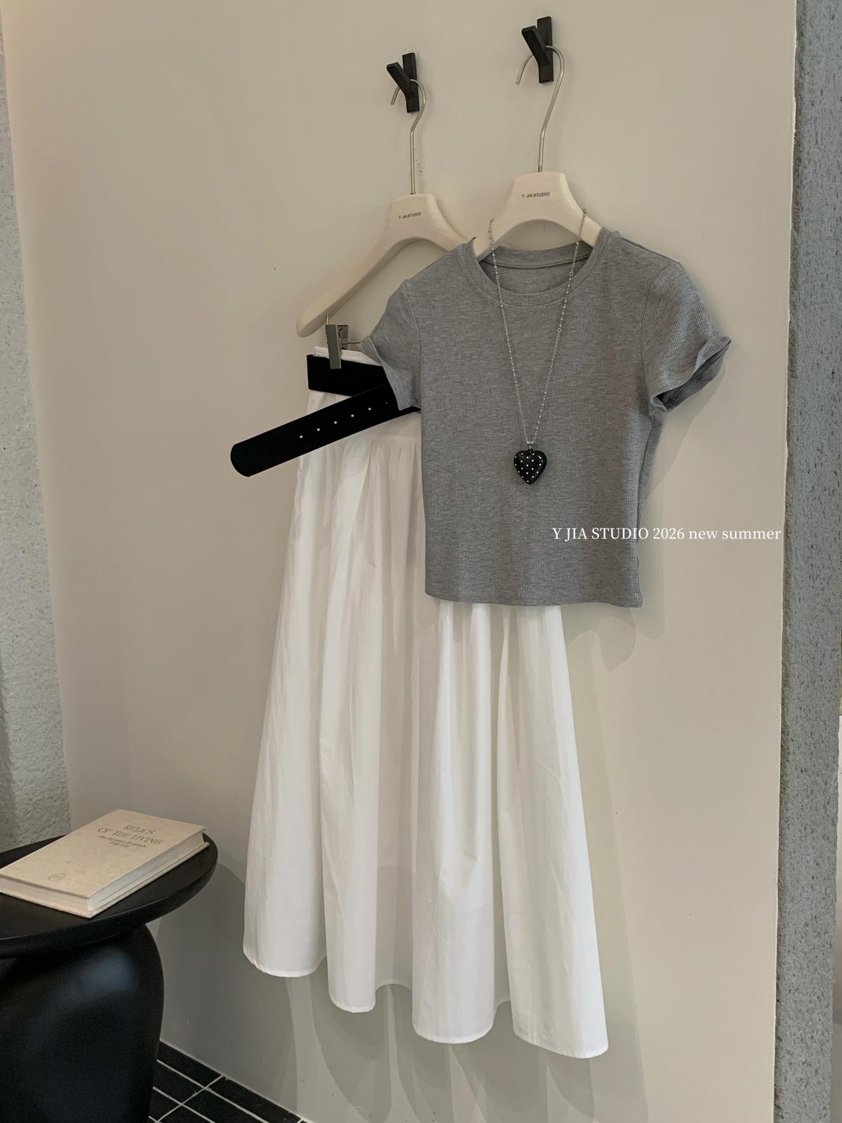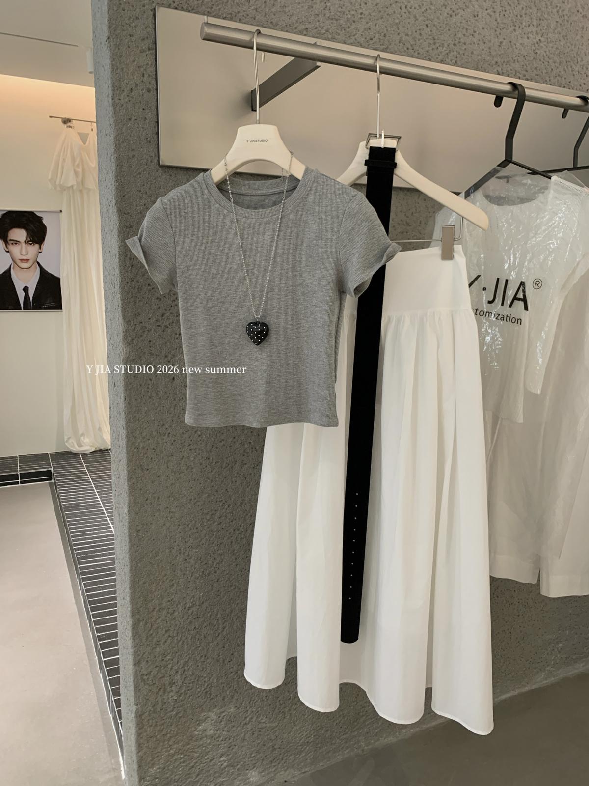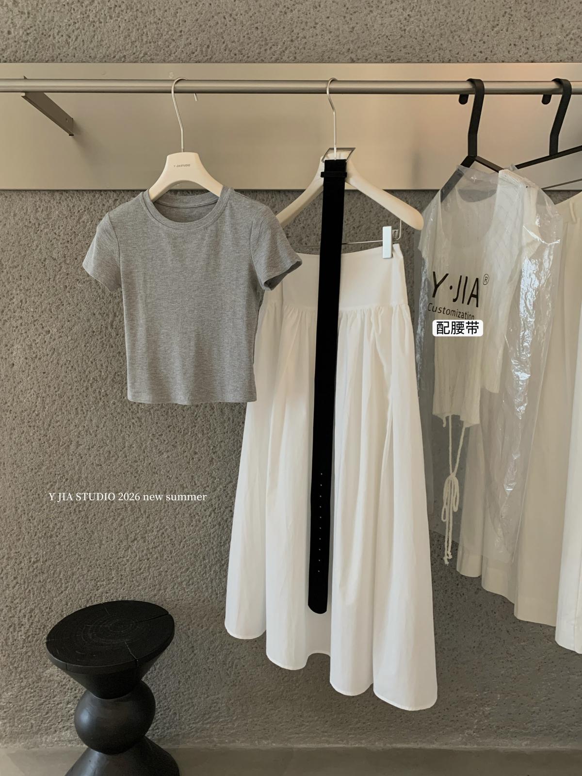 【C9190】灰色圓領顯瘦短袖正肩T恤+高腰垂感半身裙兩件套套裝(配腰帶)