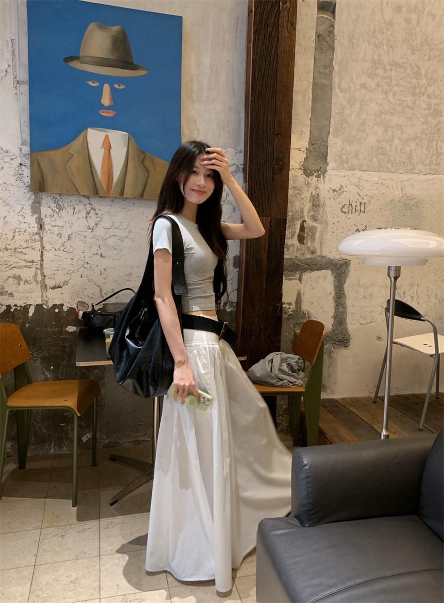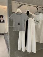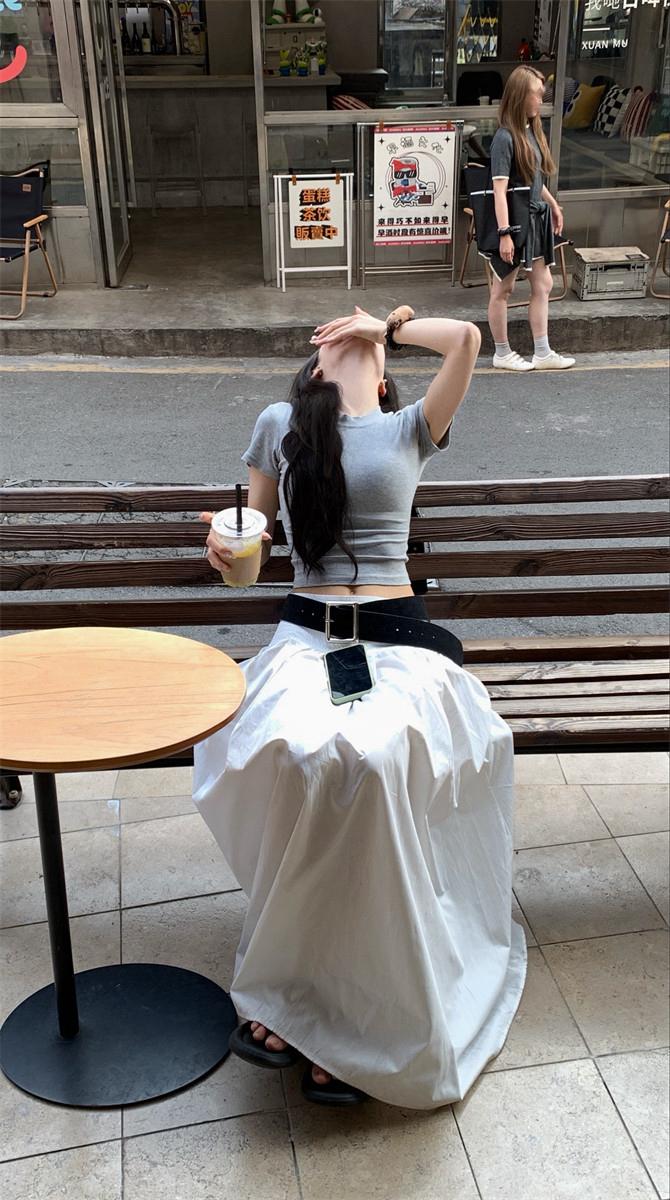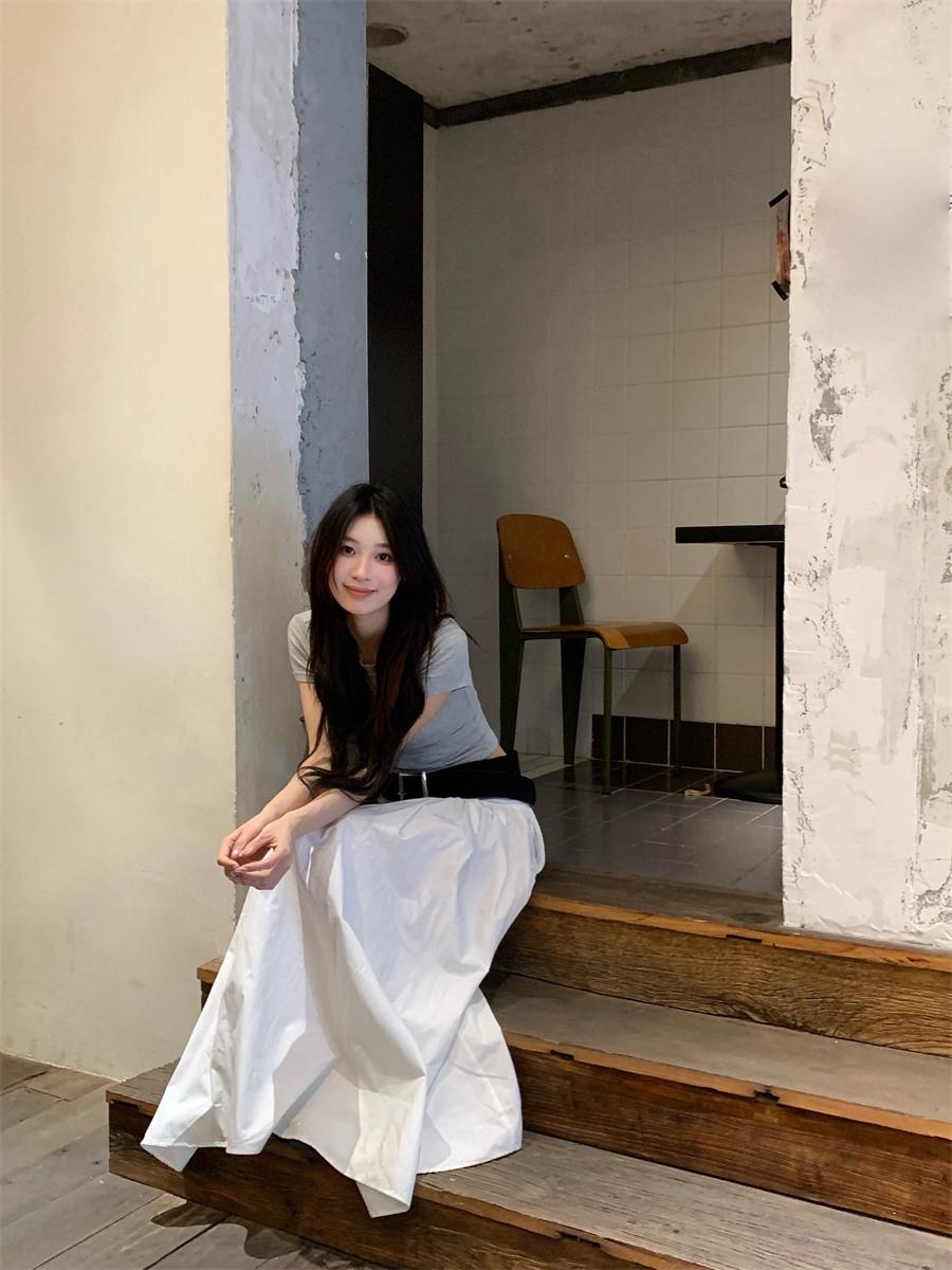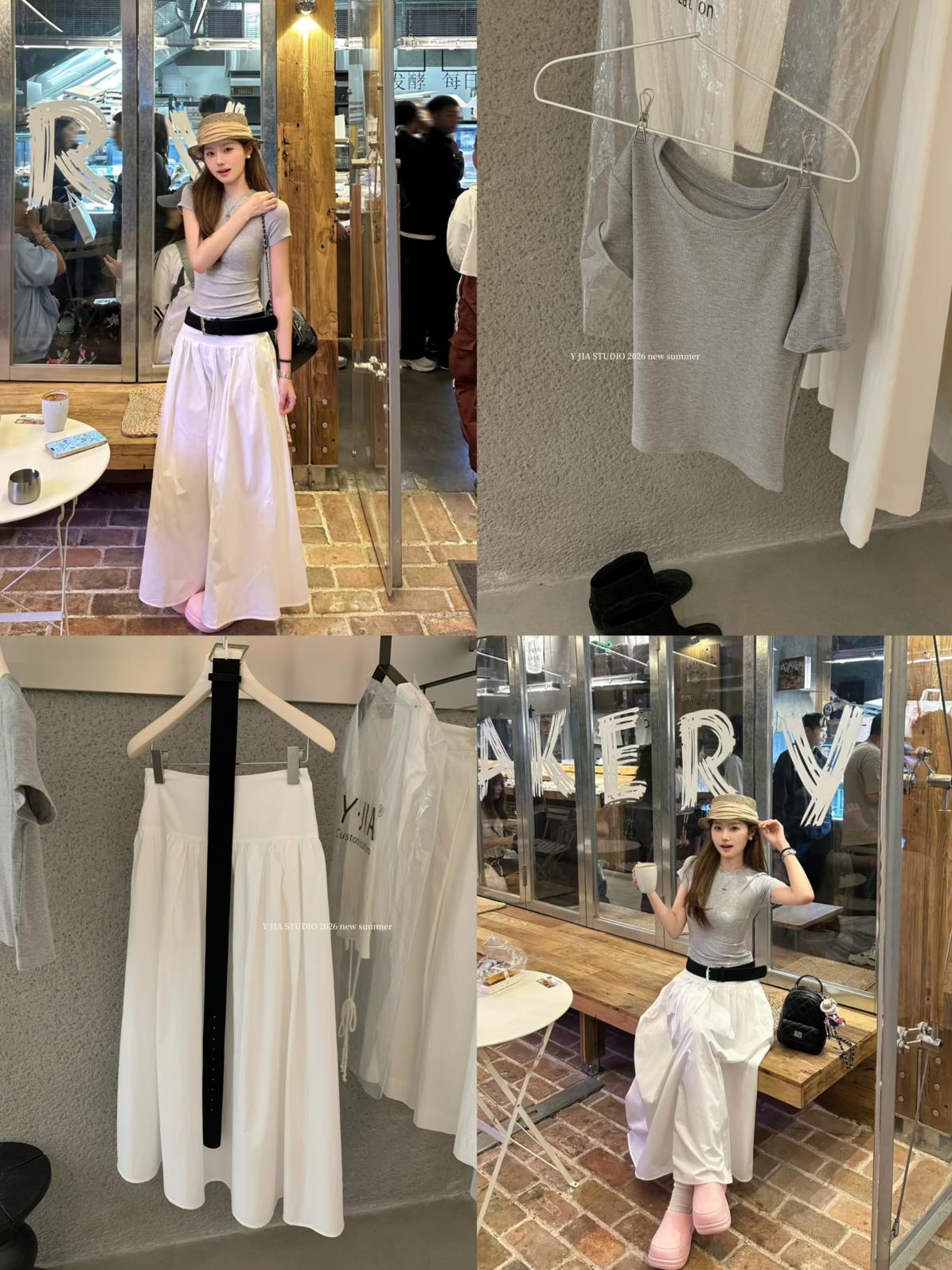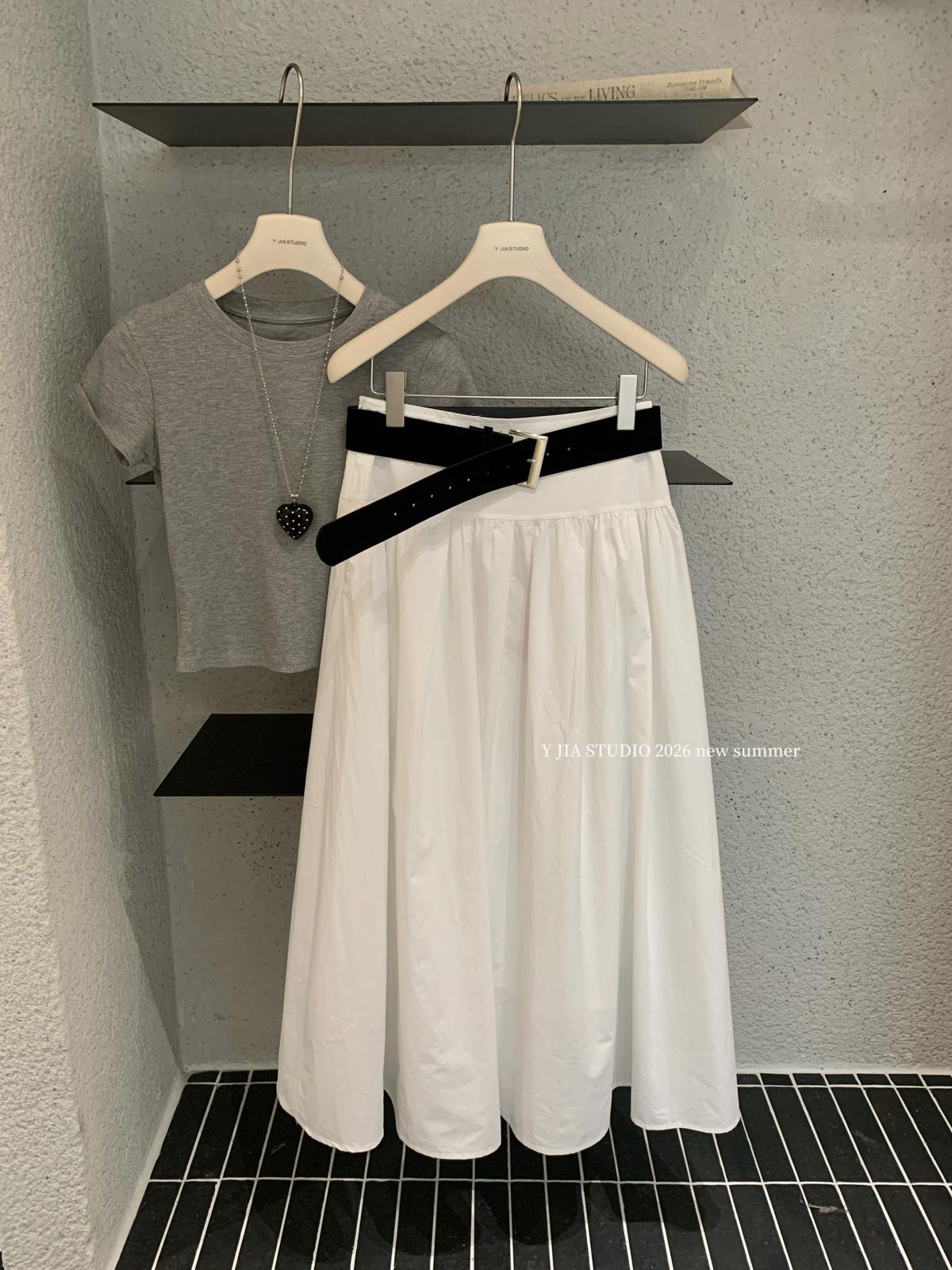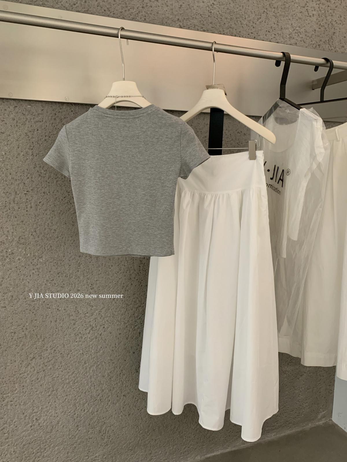 【C9190】灰色圓領顯瘦短袖正肩T恤+高腰垂感半身裙兩件套套裝(配腰帶)