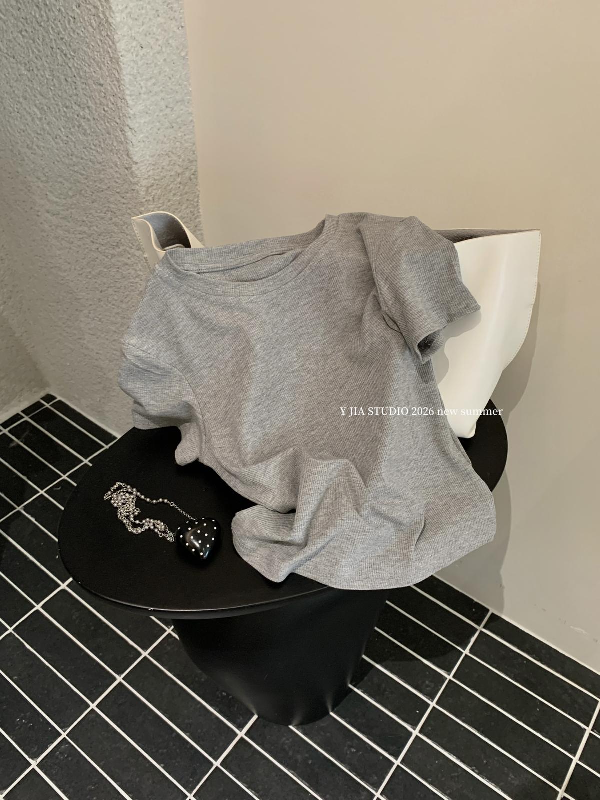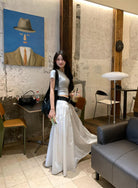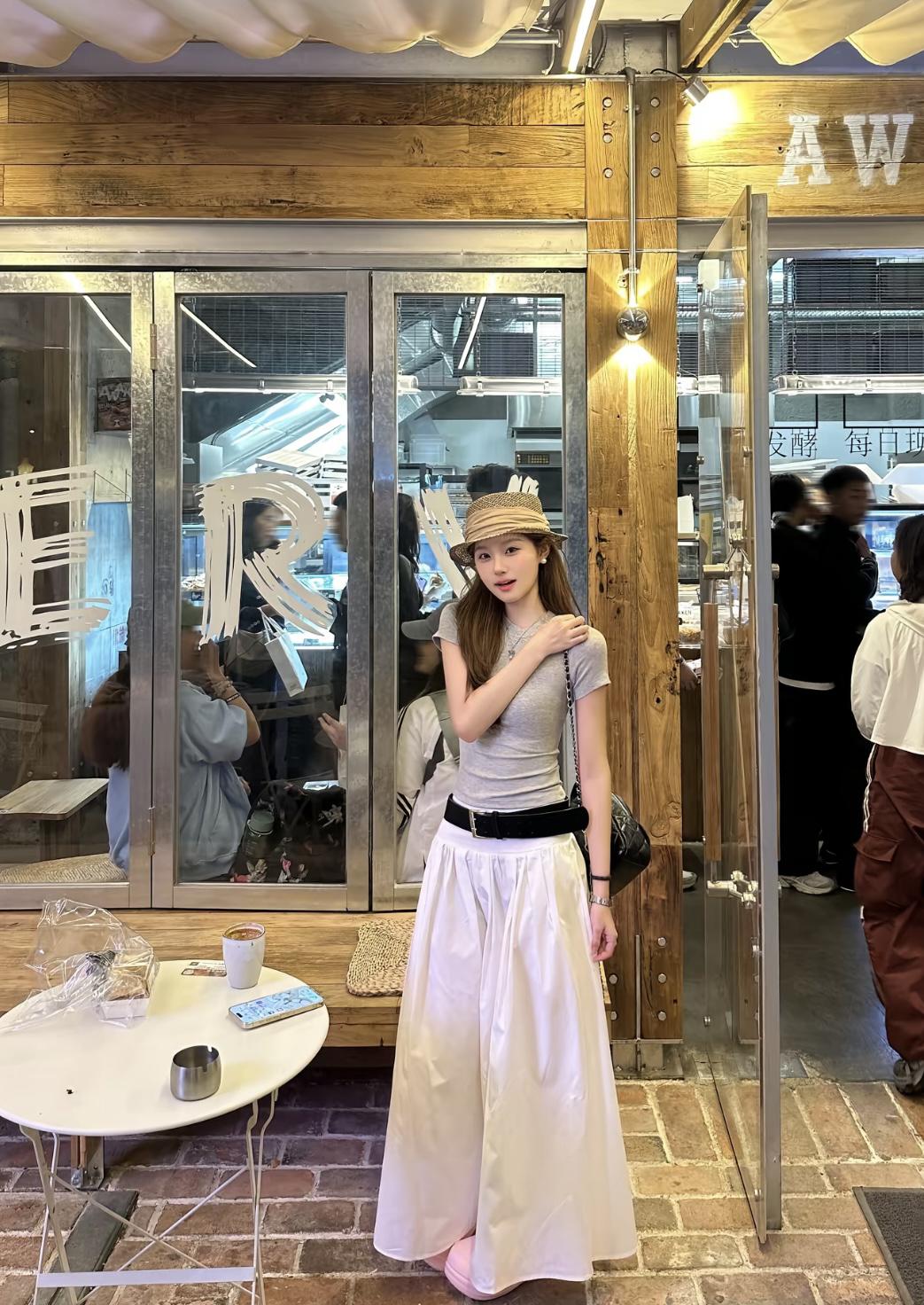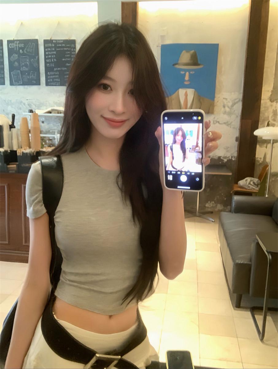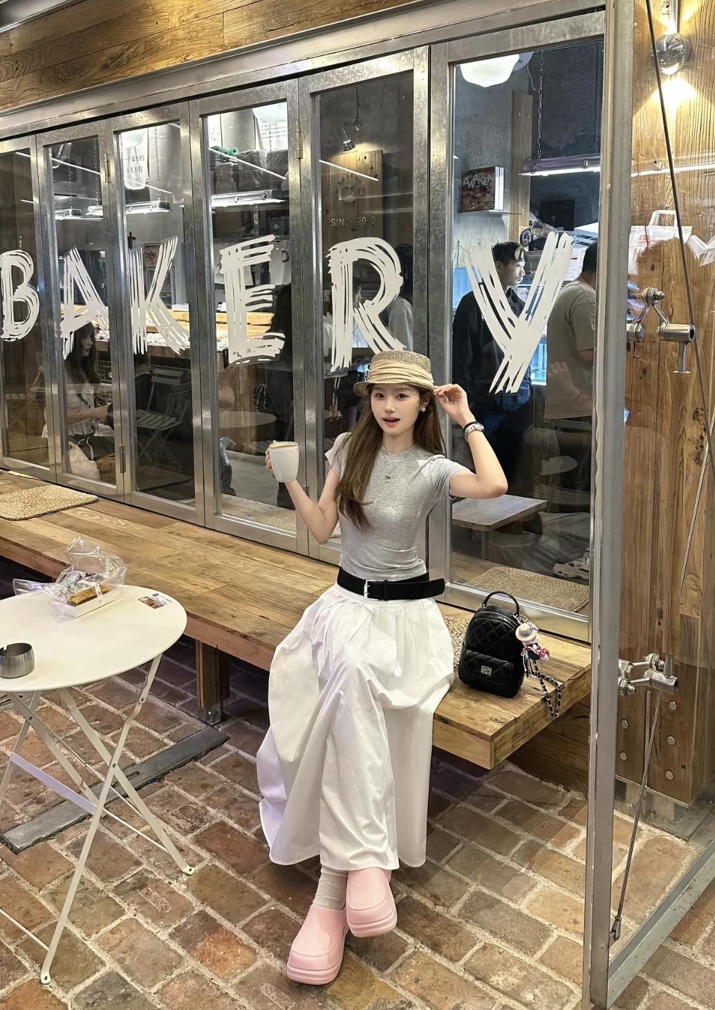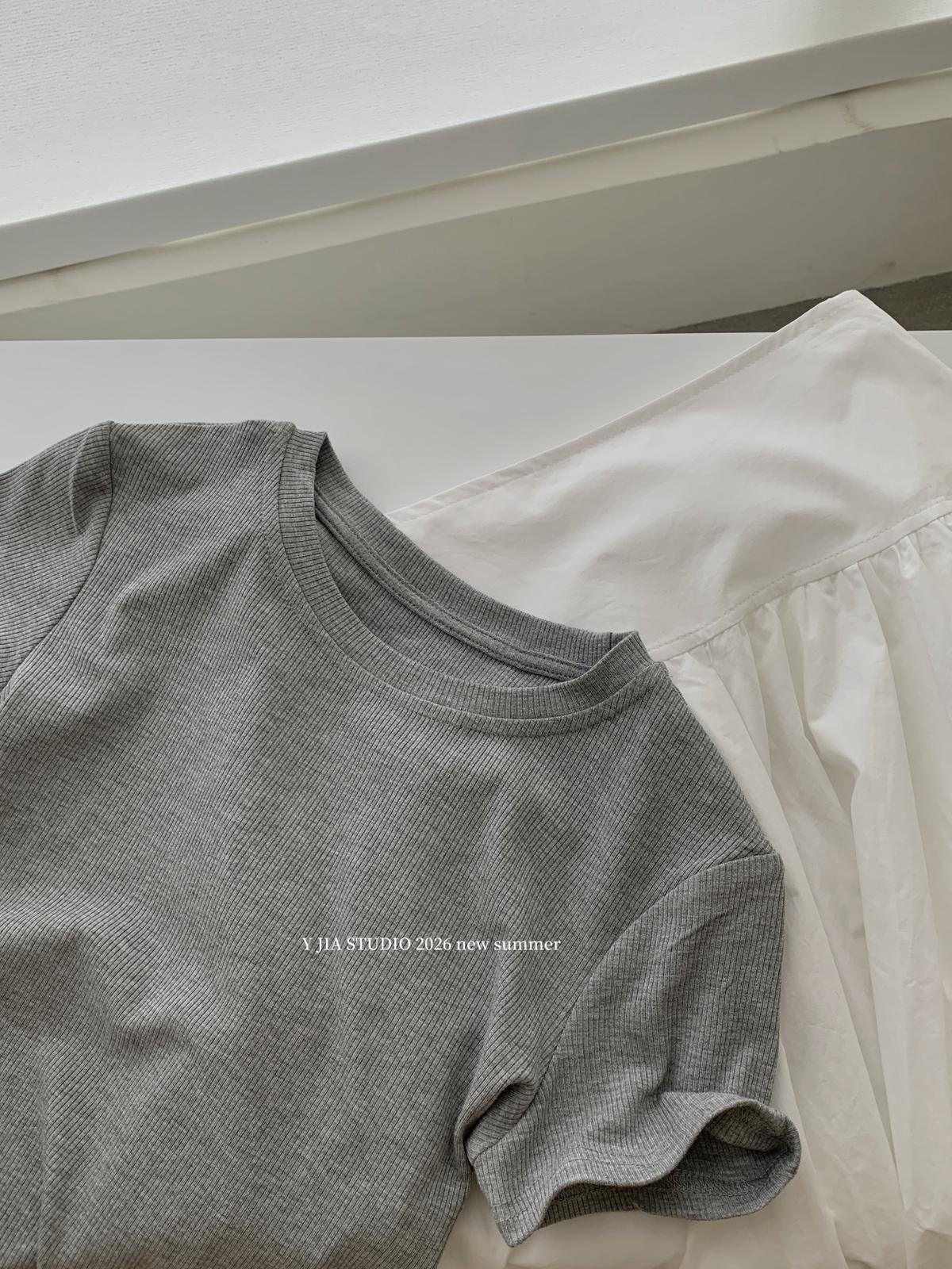 【C9190】灰色圓領顯瘦短袖正肩T恤+高腰垂感半身裙兩件套套裝(配腰帶)
