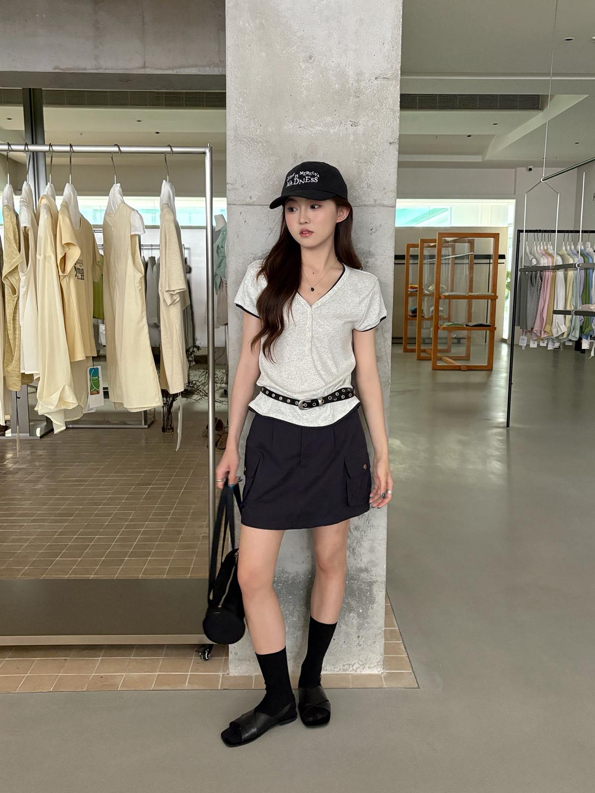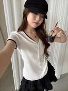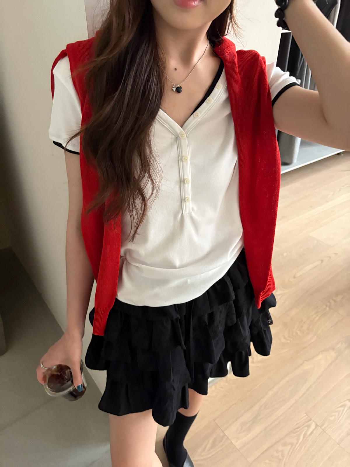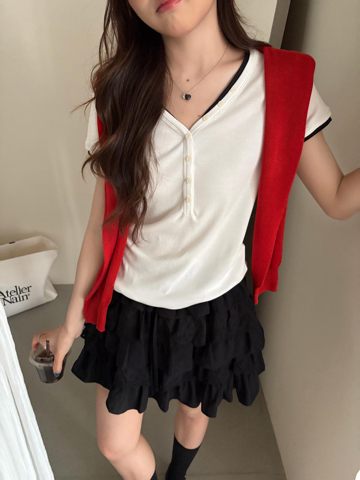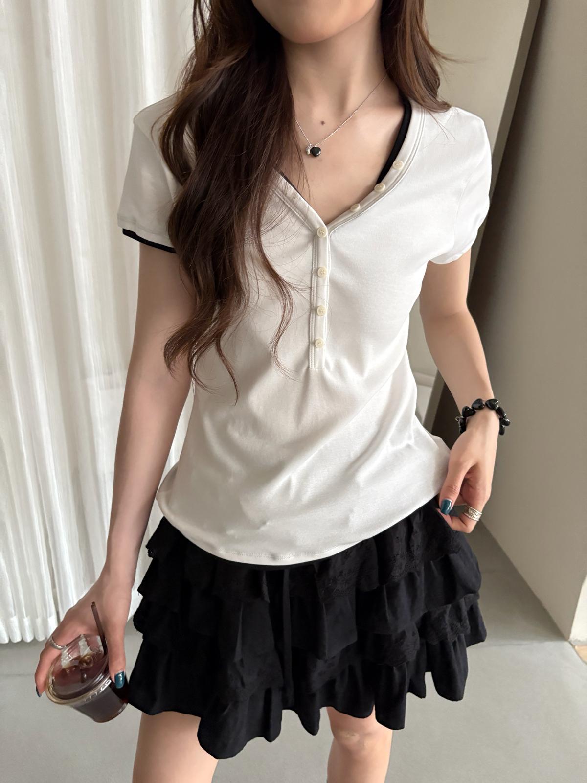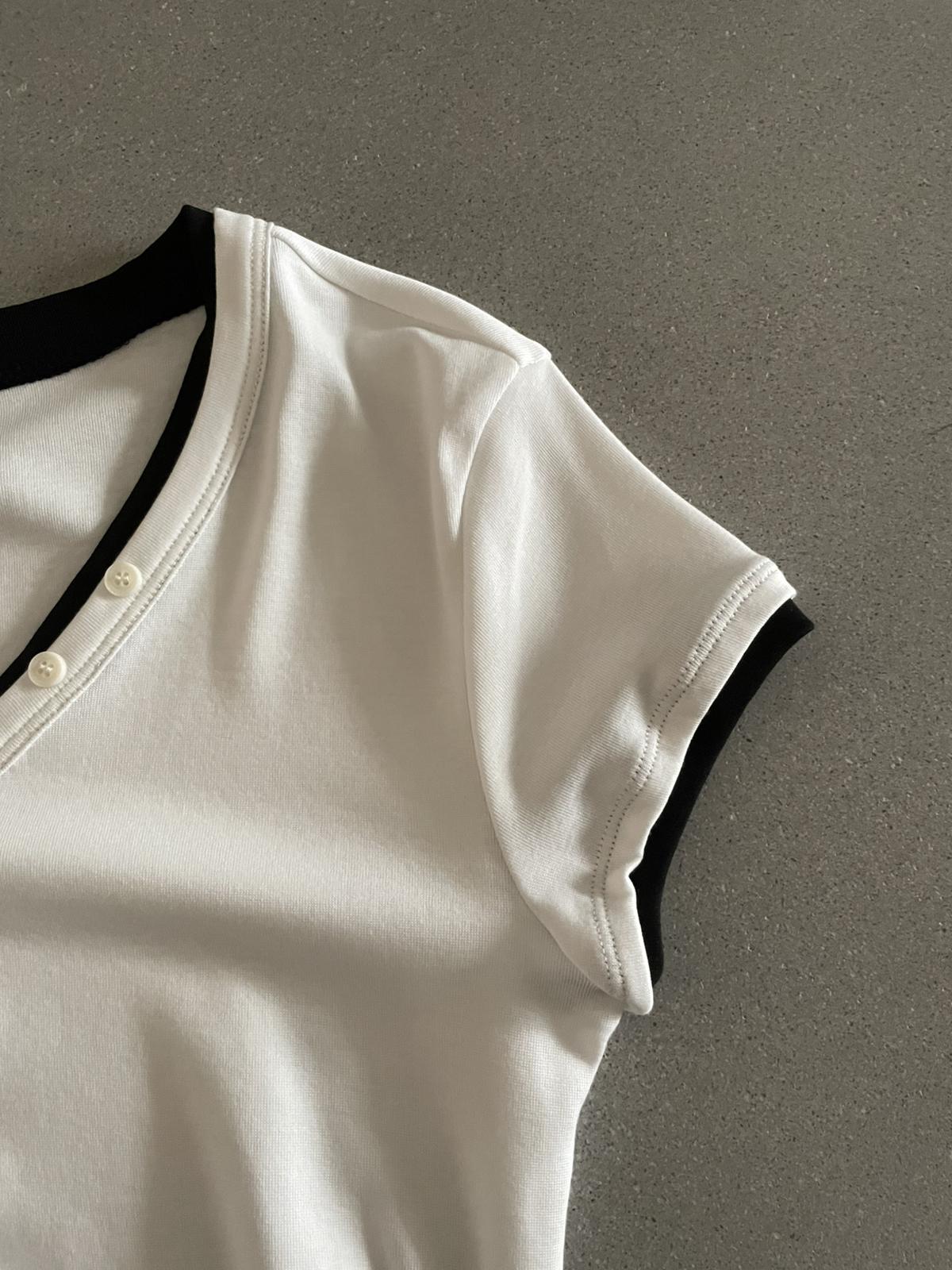 【C9215】韓系設計感撞色V領短袖T恤(單賣短袖T恤)