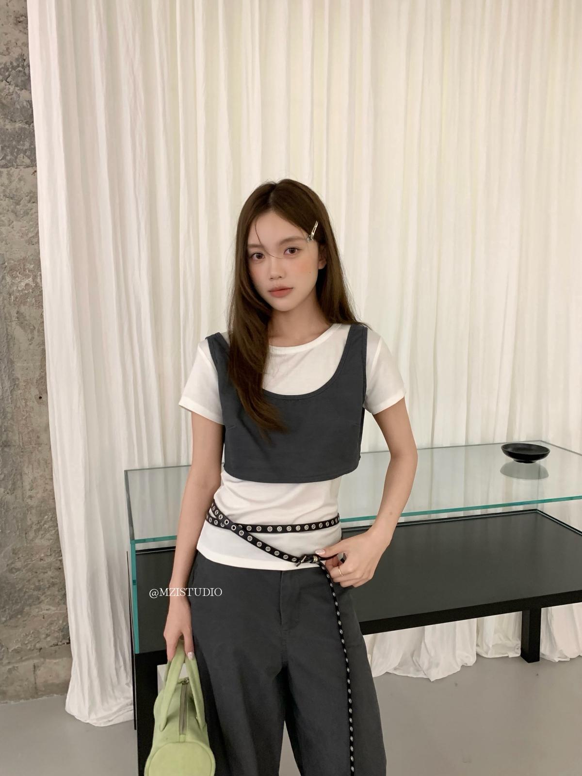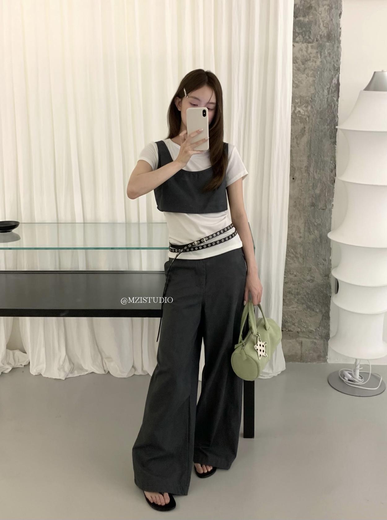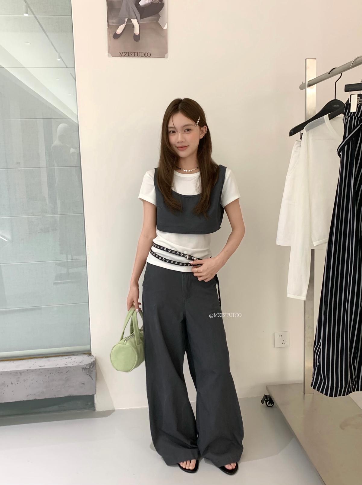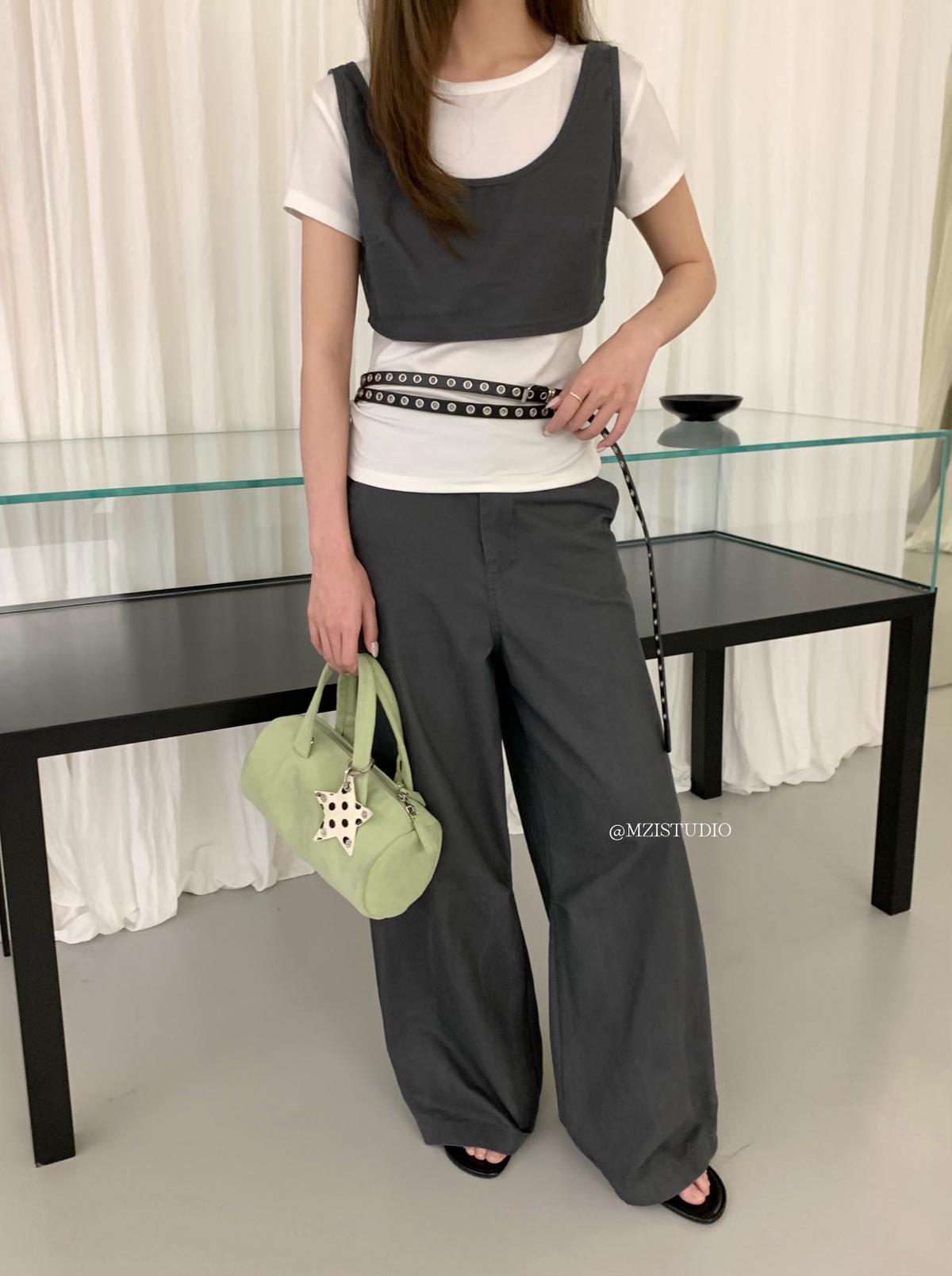 3. 【C9223】自由力量韓版時髦拉鍊短款疊穿背心+闊腿寬鬆百搭遮肉休閒褲套裝(兩件套)