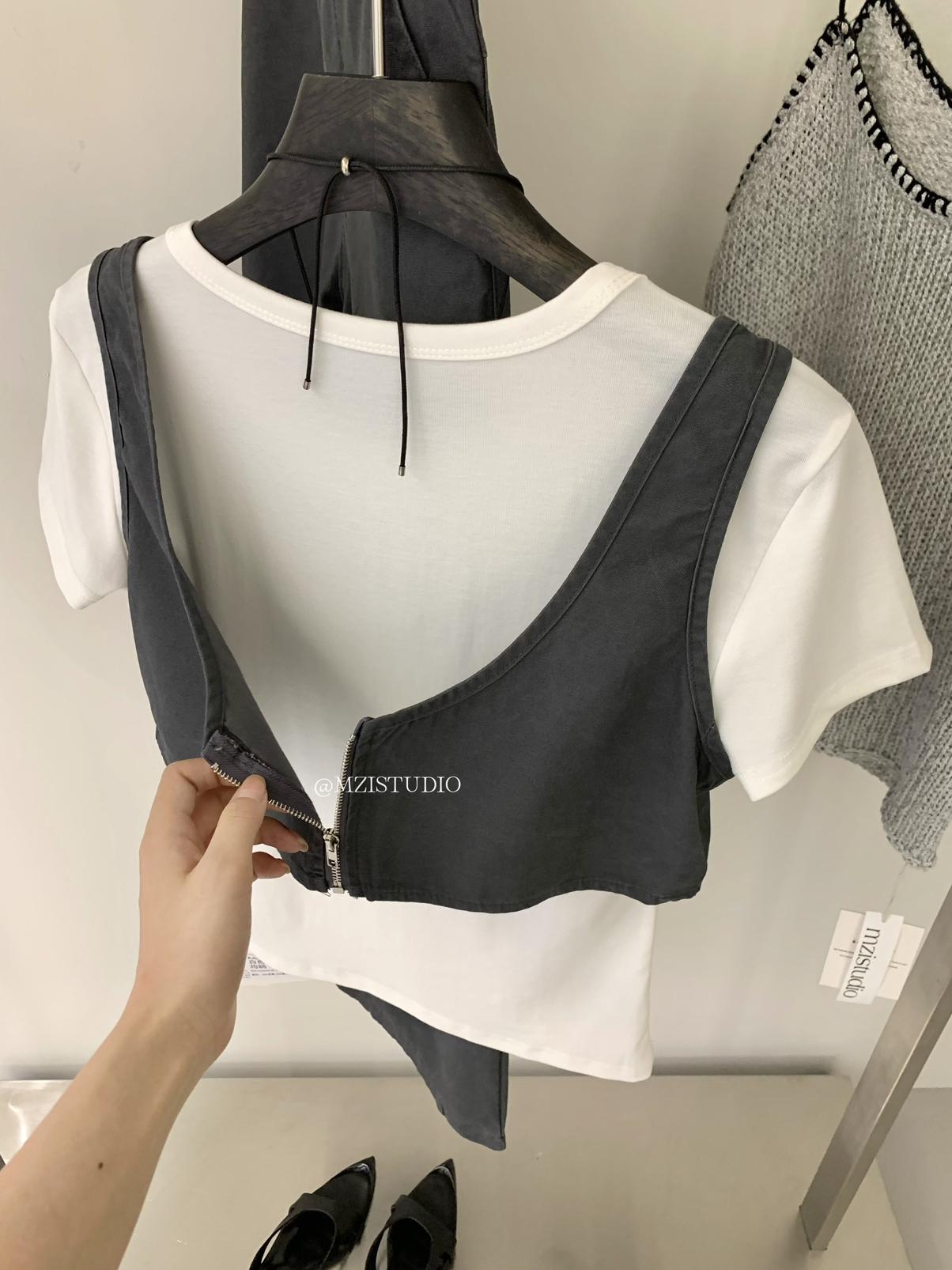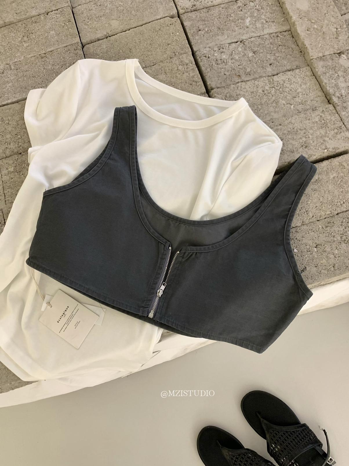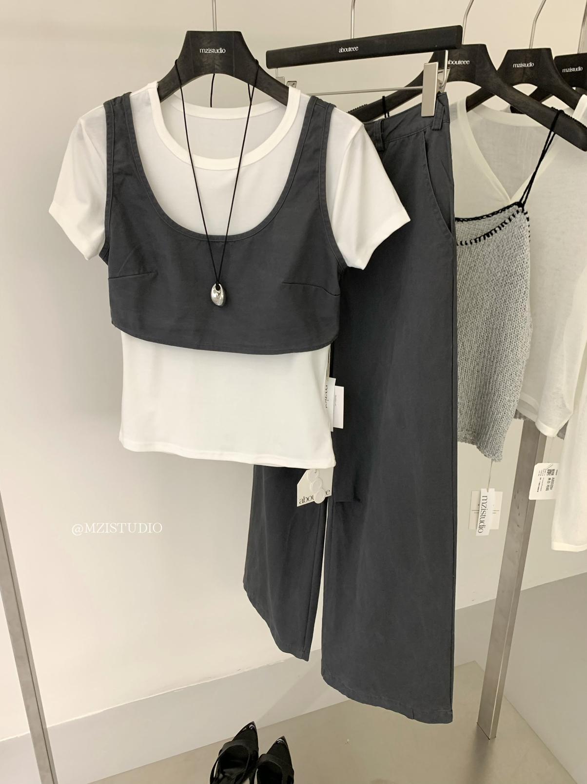【C9223】自由力量韓版時髦拉鍊短款疊穿背心+闊腿寬鬆百搭遮肉休閒褲套裝(兩件套)