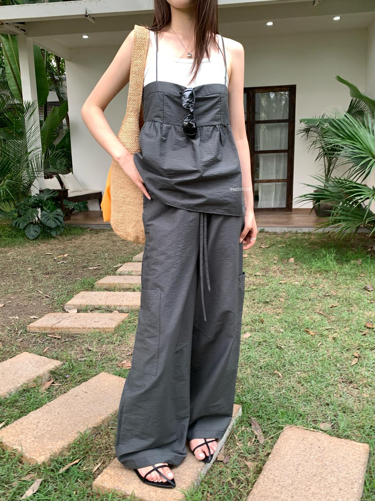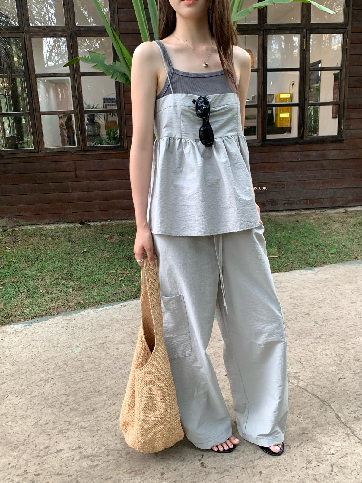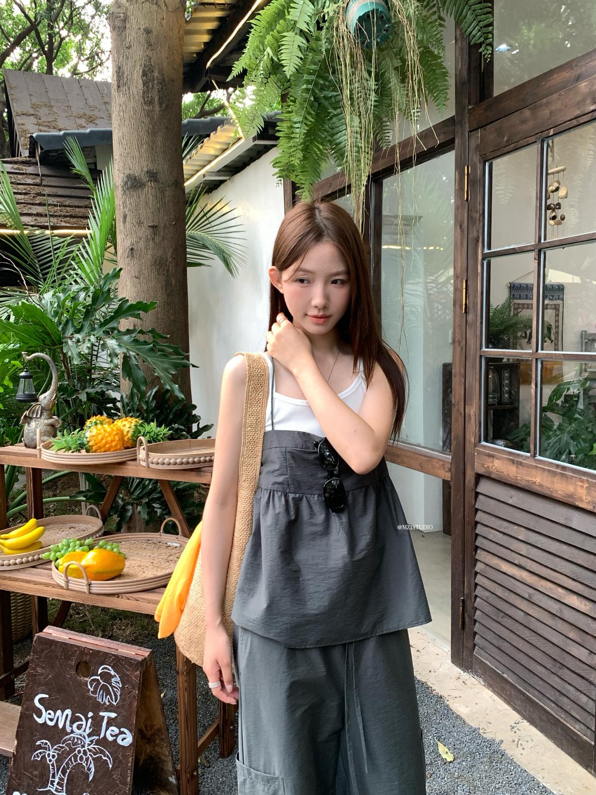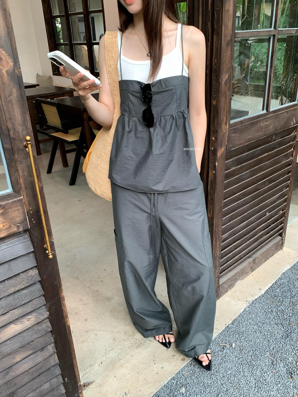 【C9225】隨心賦型韓系夏季荷葉邊繫帶吊帶+簡約寬鬆闊腿口袋休閒褲套裝(兩件套,不含背心)