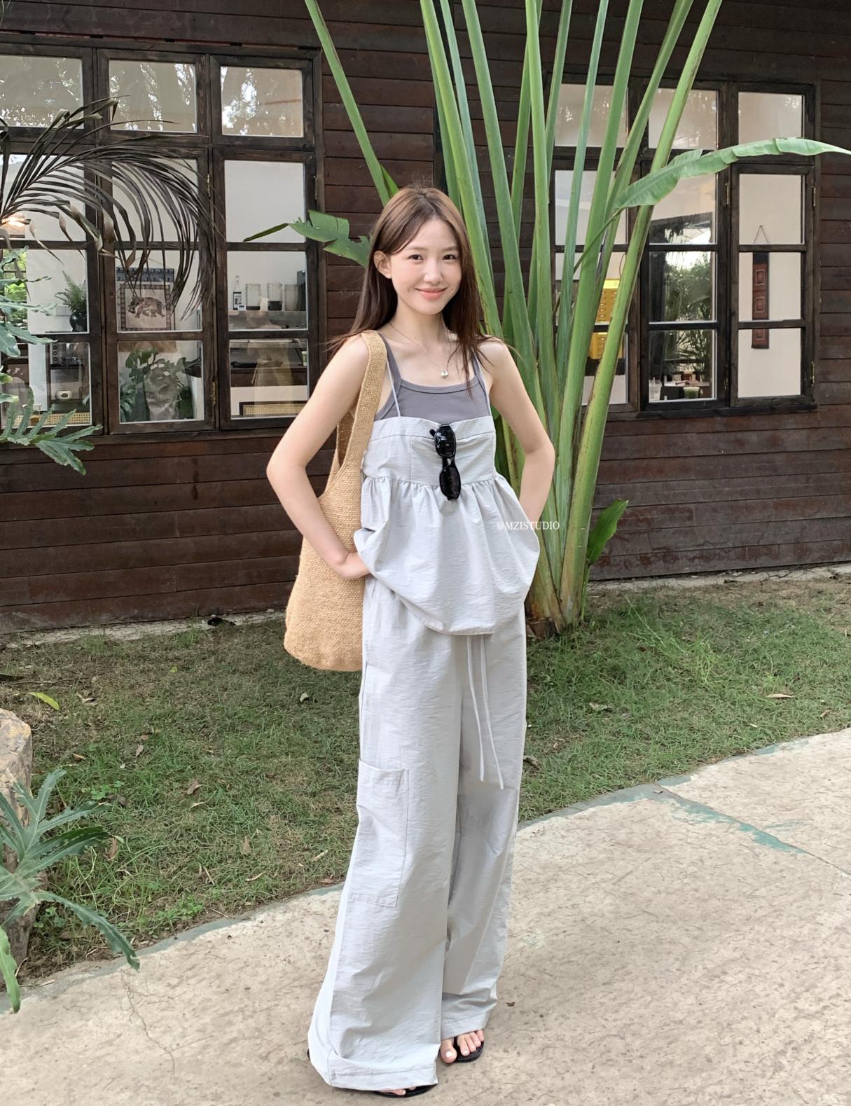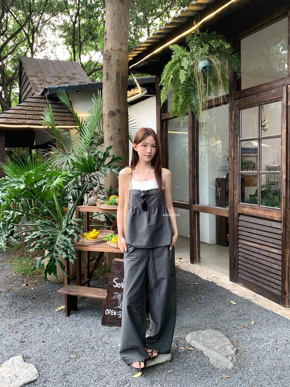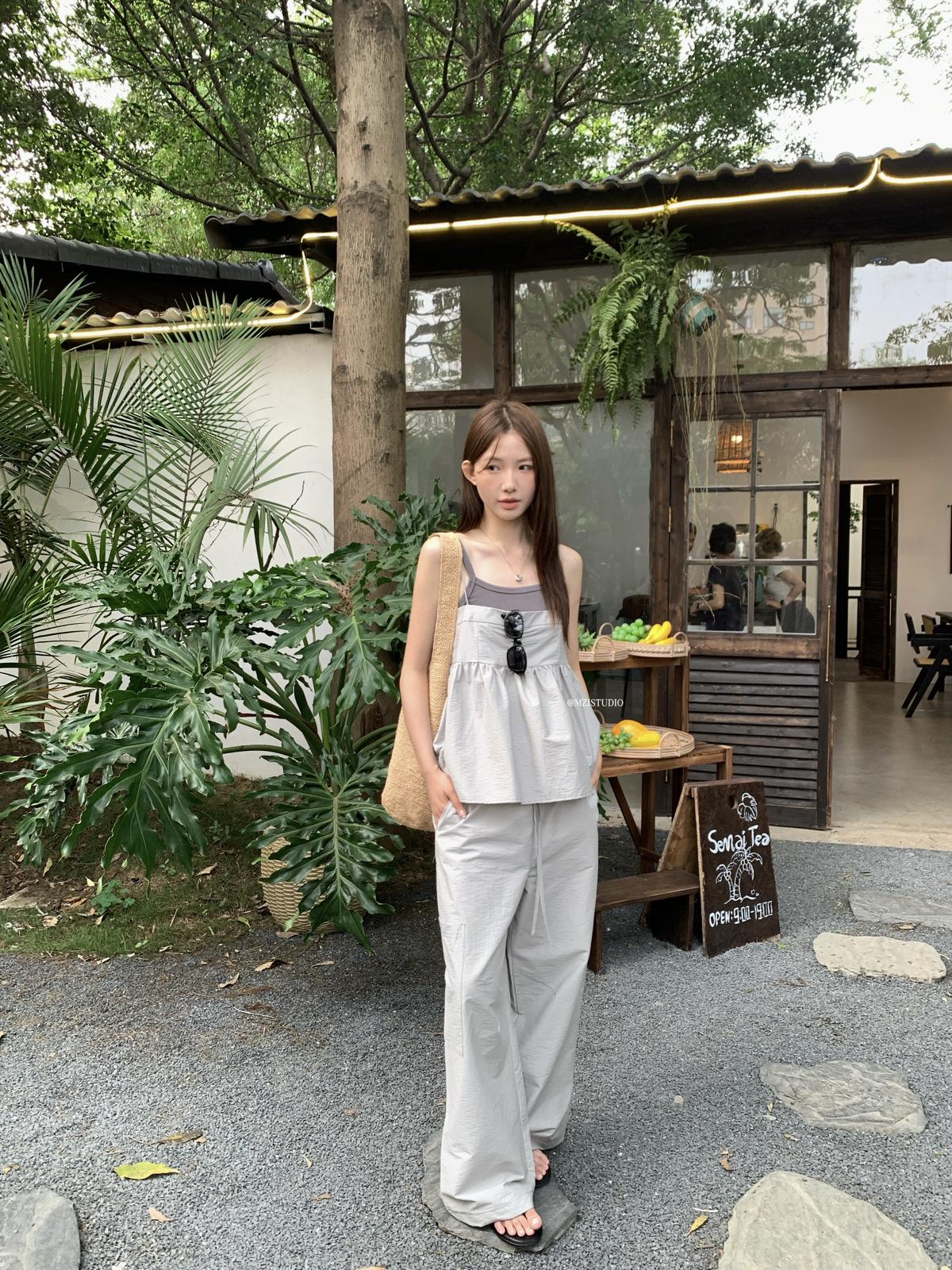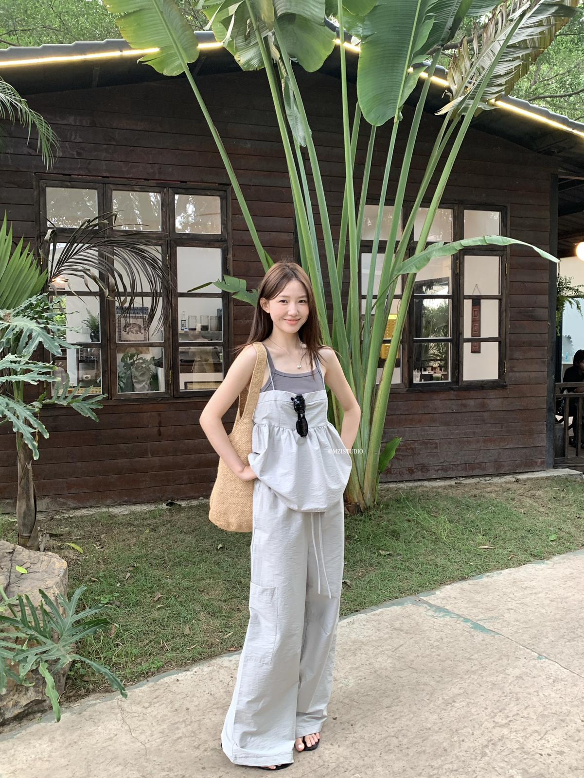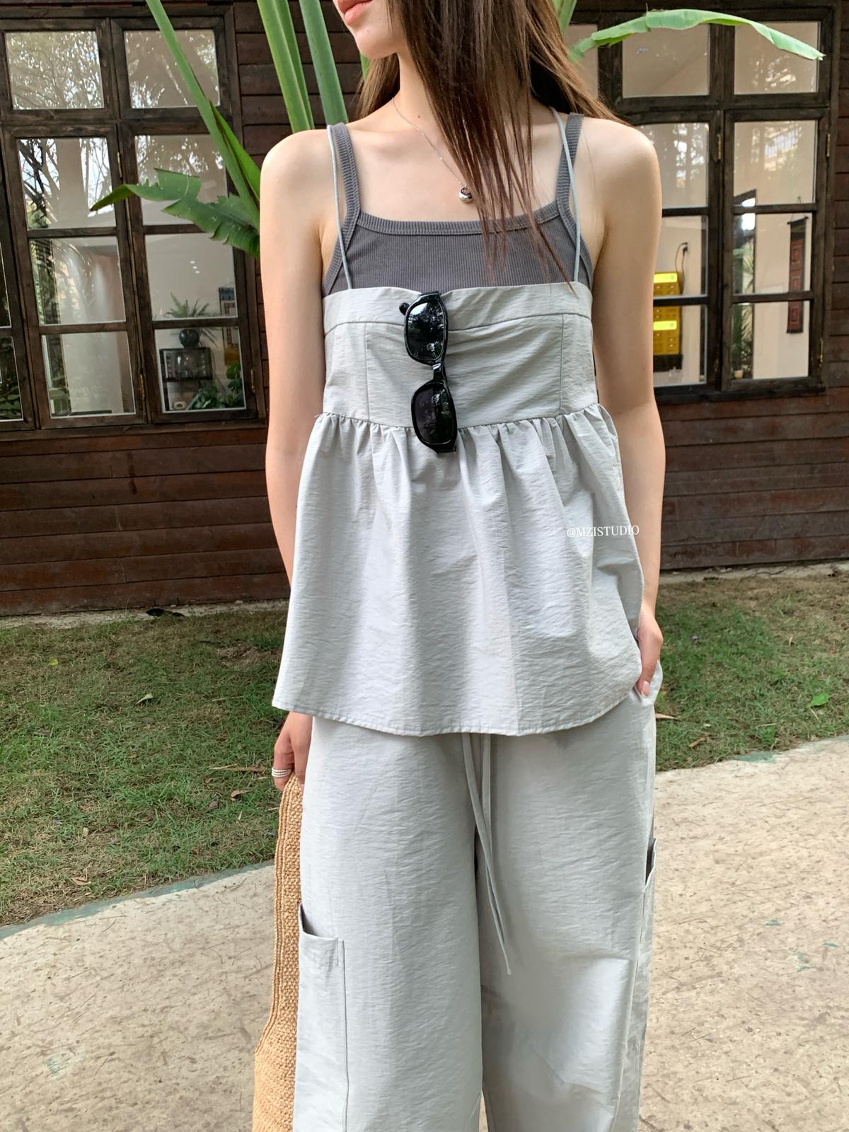 【C9225】隨心賦型韓系夏季荷葉邊繫帶吊帶+簡約寬鬆闊腿口袋休閒褲套裝(兩件套,不含背心)