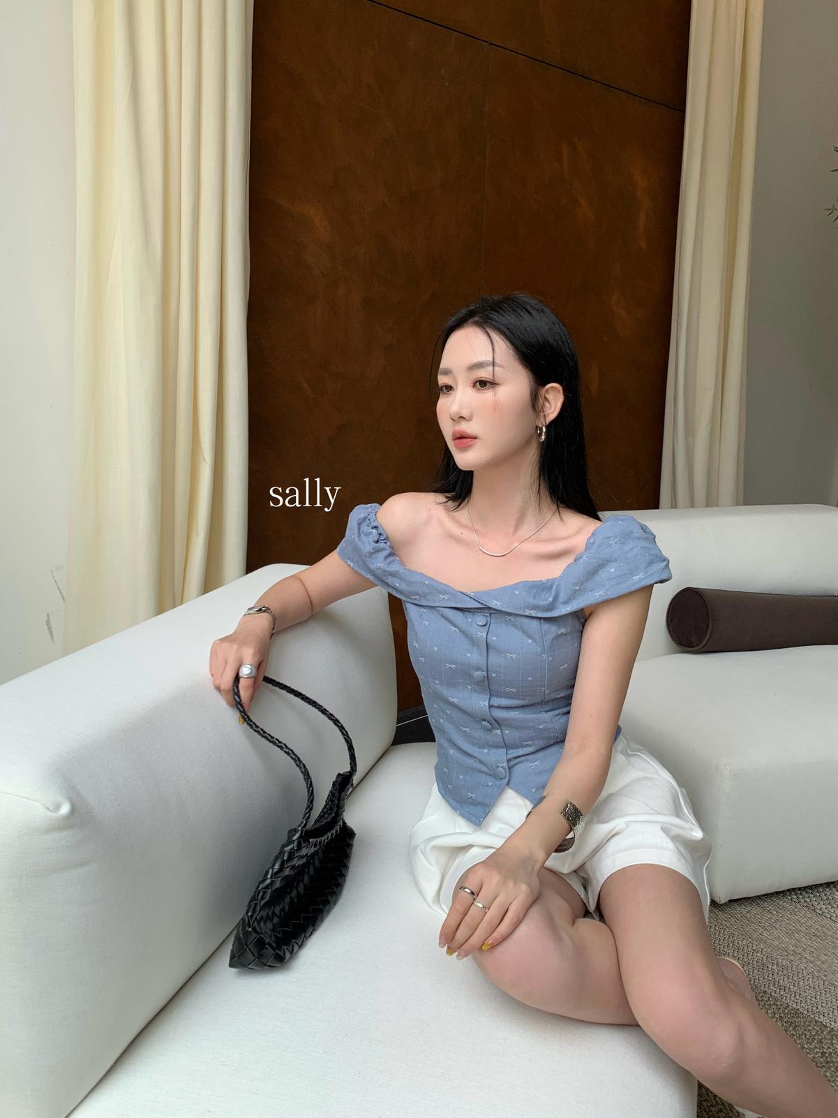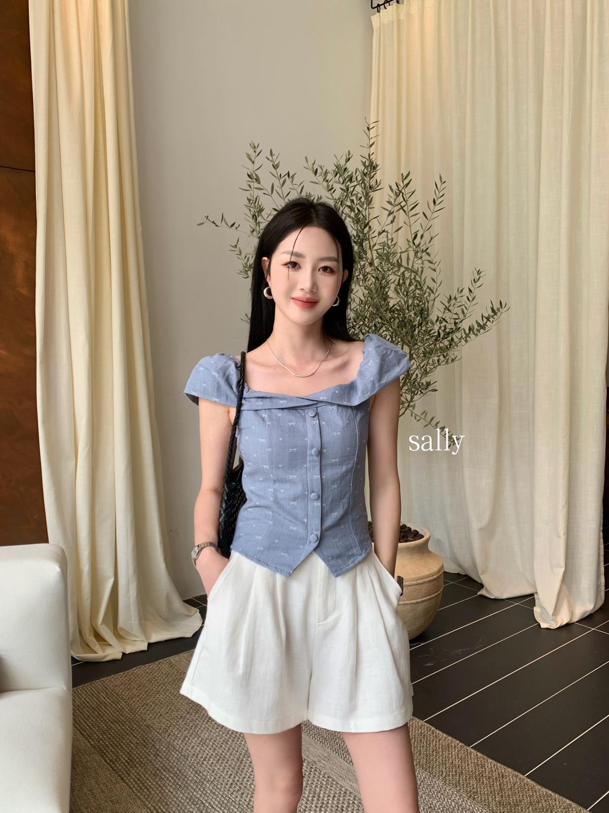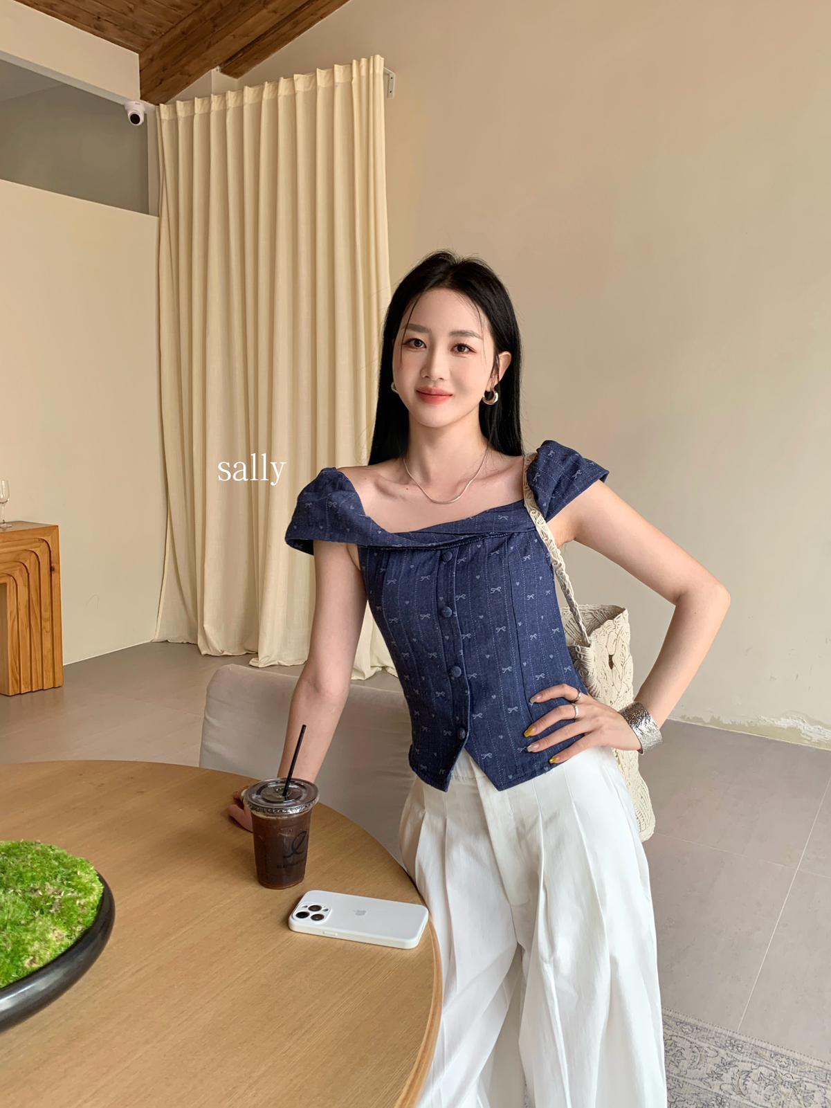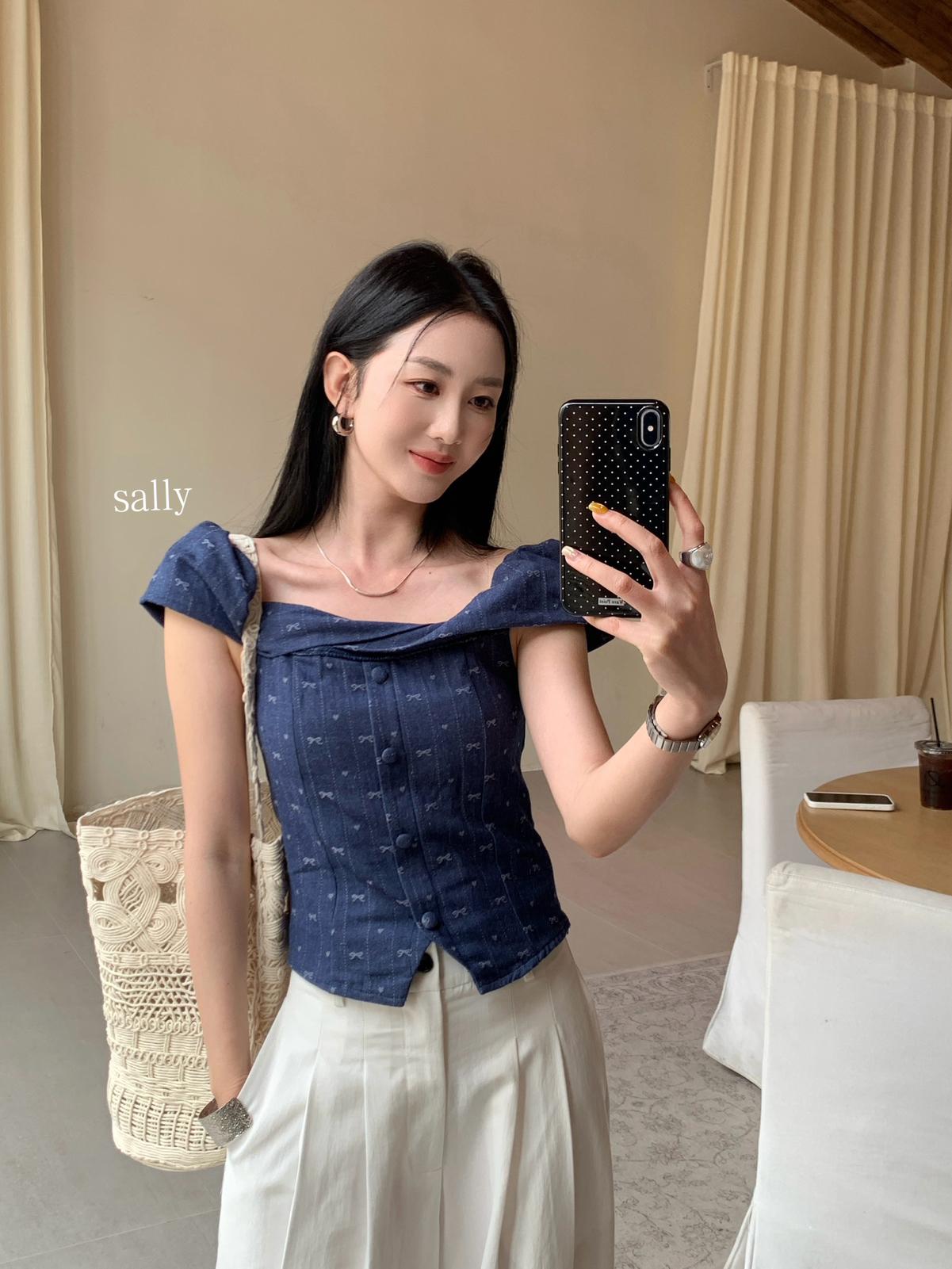 【C9255】法式甜美蝴蝶結印花牛仔小衫