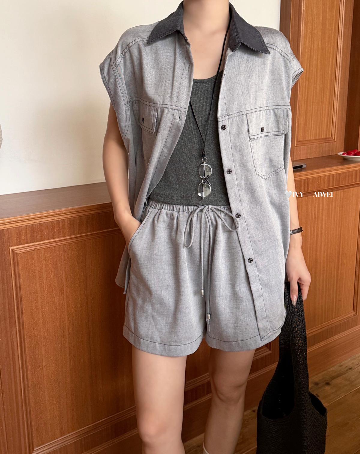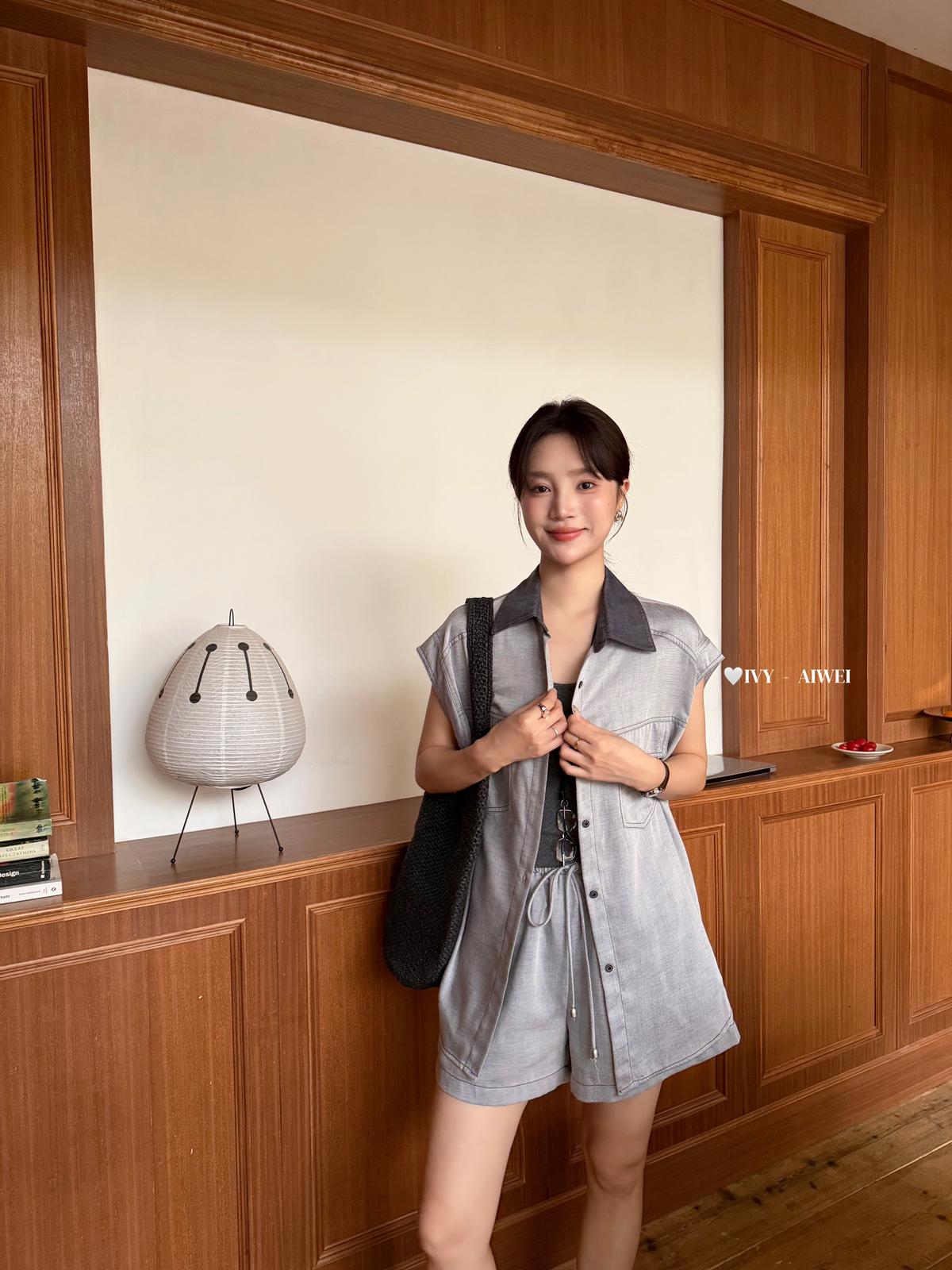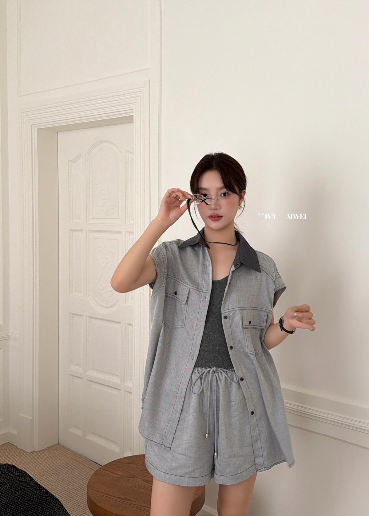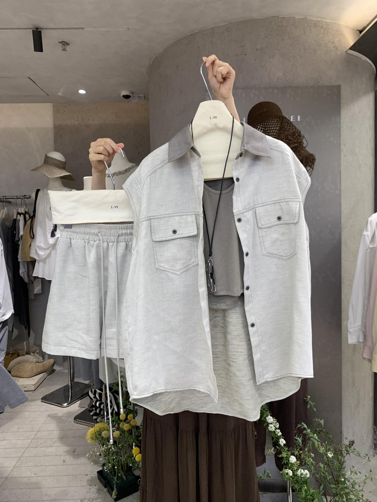 【C9262】韓系寬鬆撞色無袖襯衫+純色百搭顯瘦背心+鬆緊高腰闊腿休閒短褲套裝(配掛飾)(三件套)