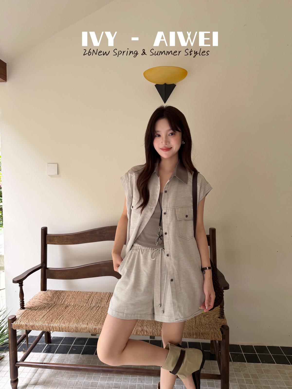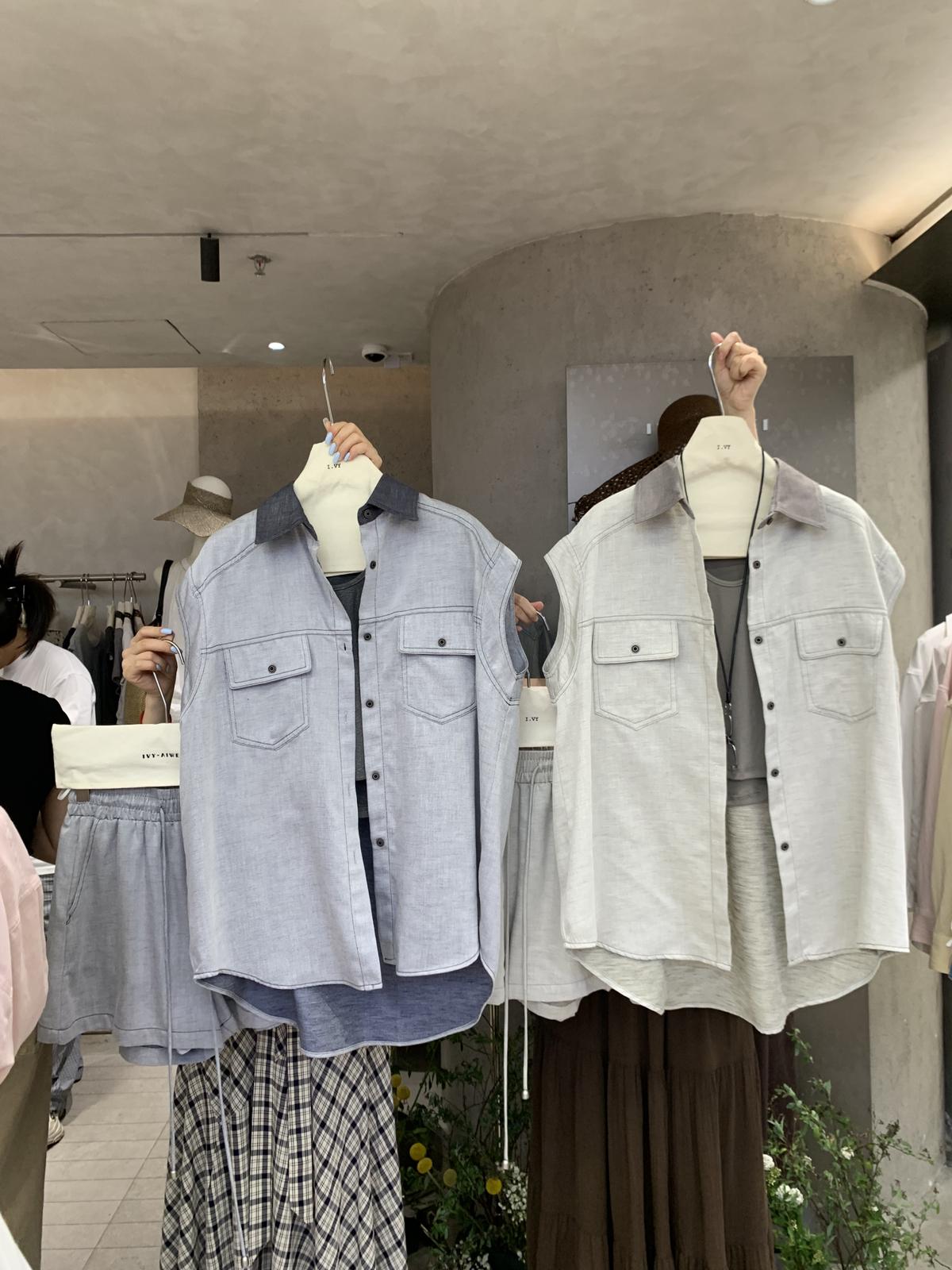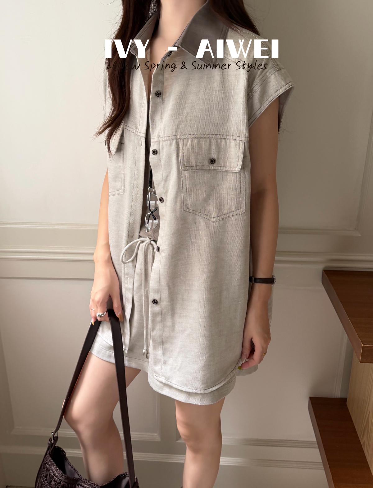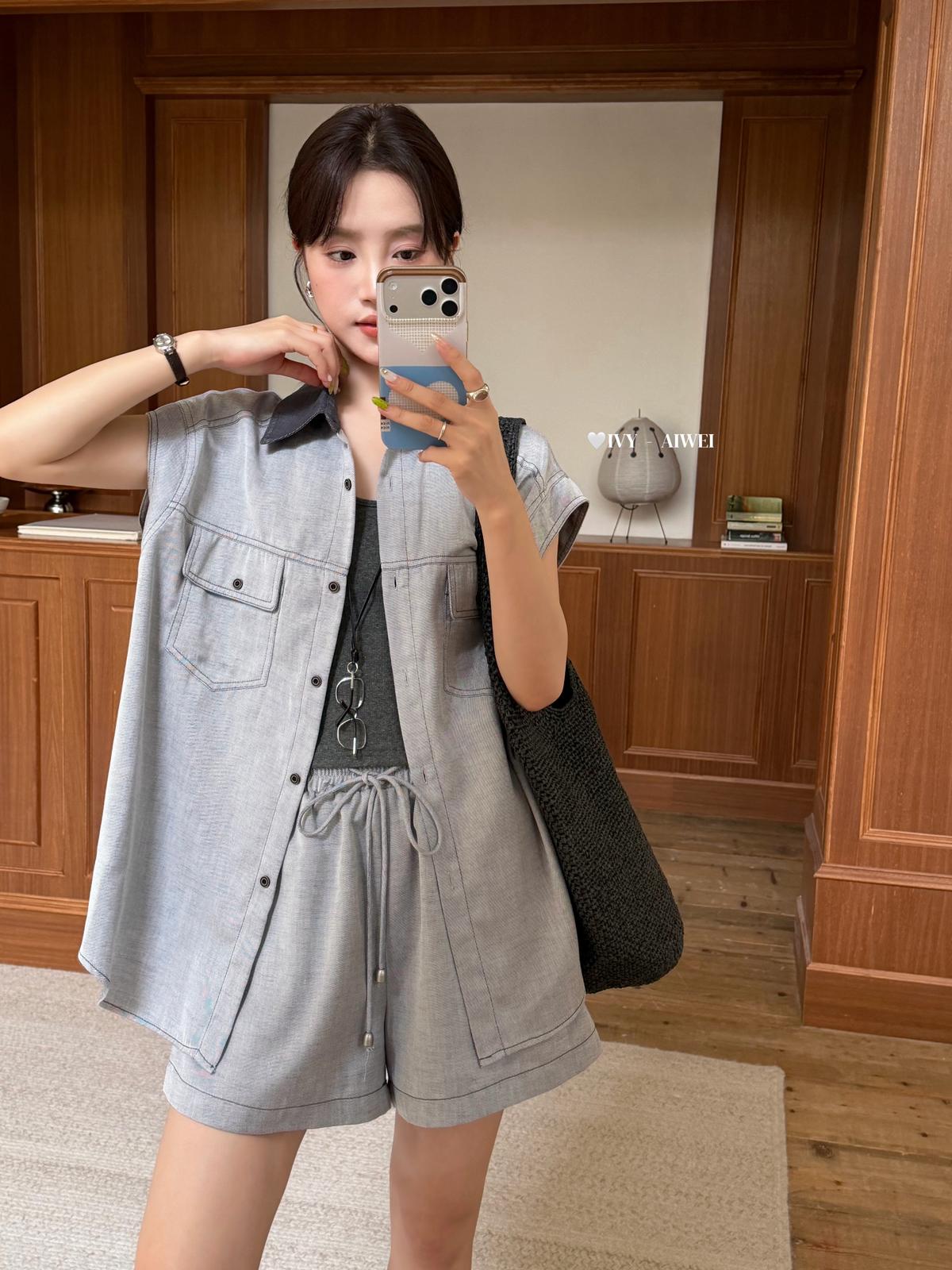 【C9262】韓系寬鬆撞色無袖襯衫+純色百搭顯瘦背心+鬆緊高腰闊腿休閒短褲套裝(配掛飾)(三件套)