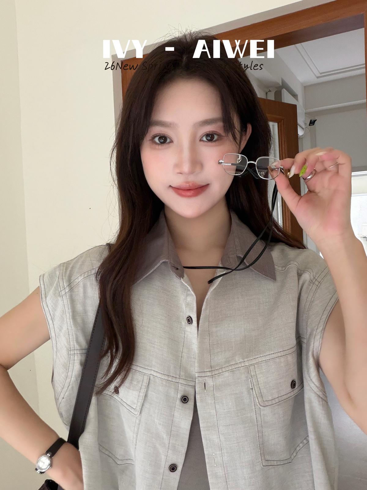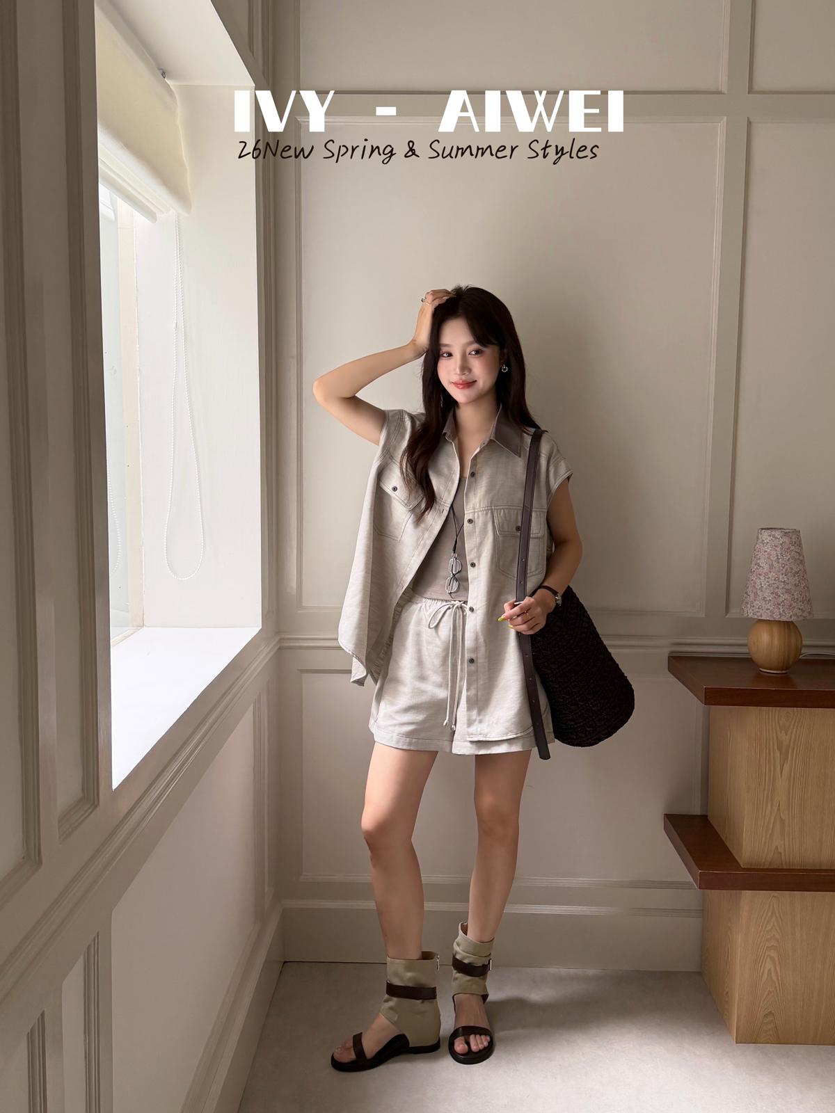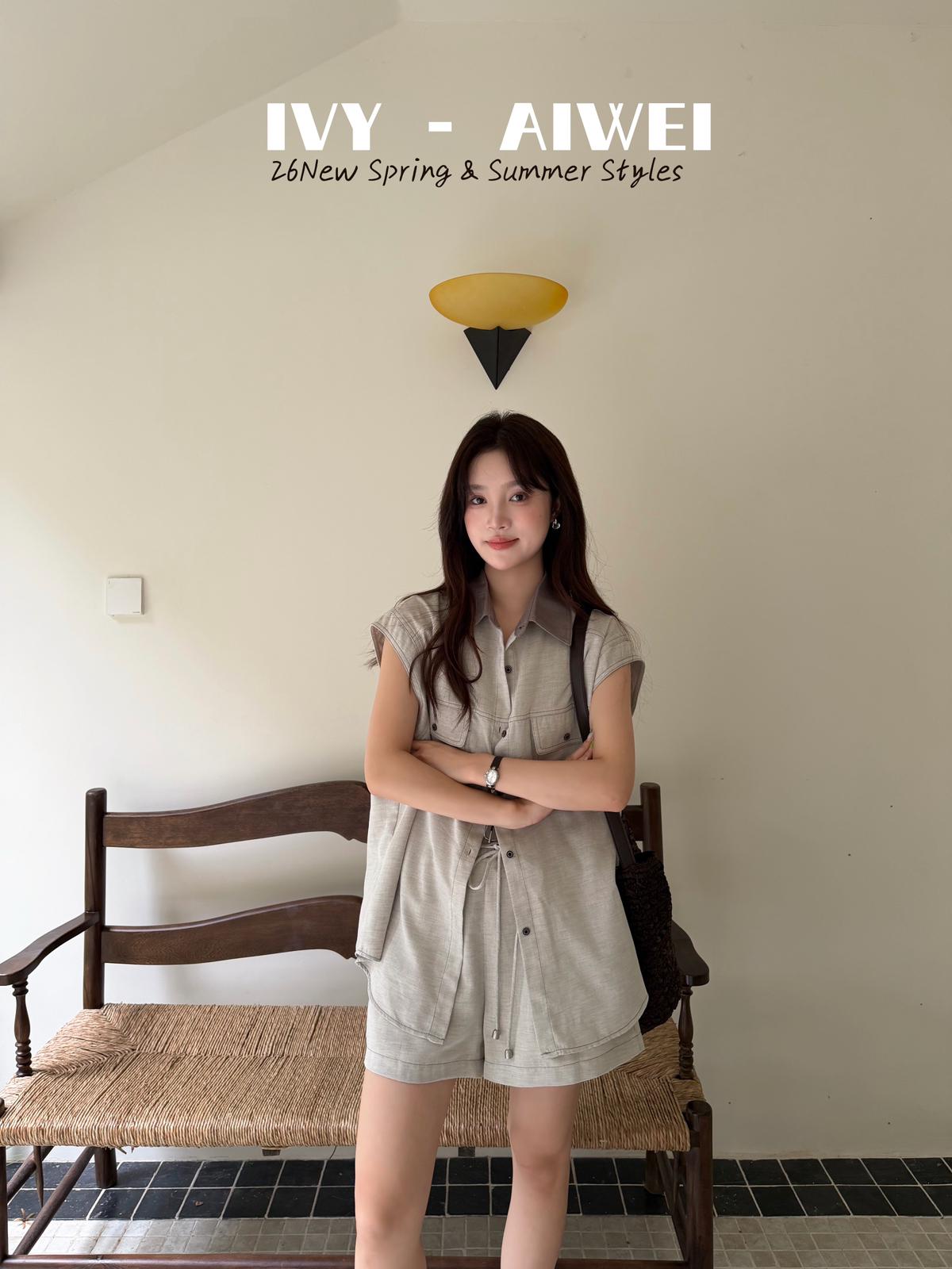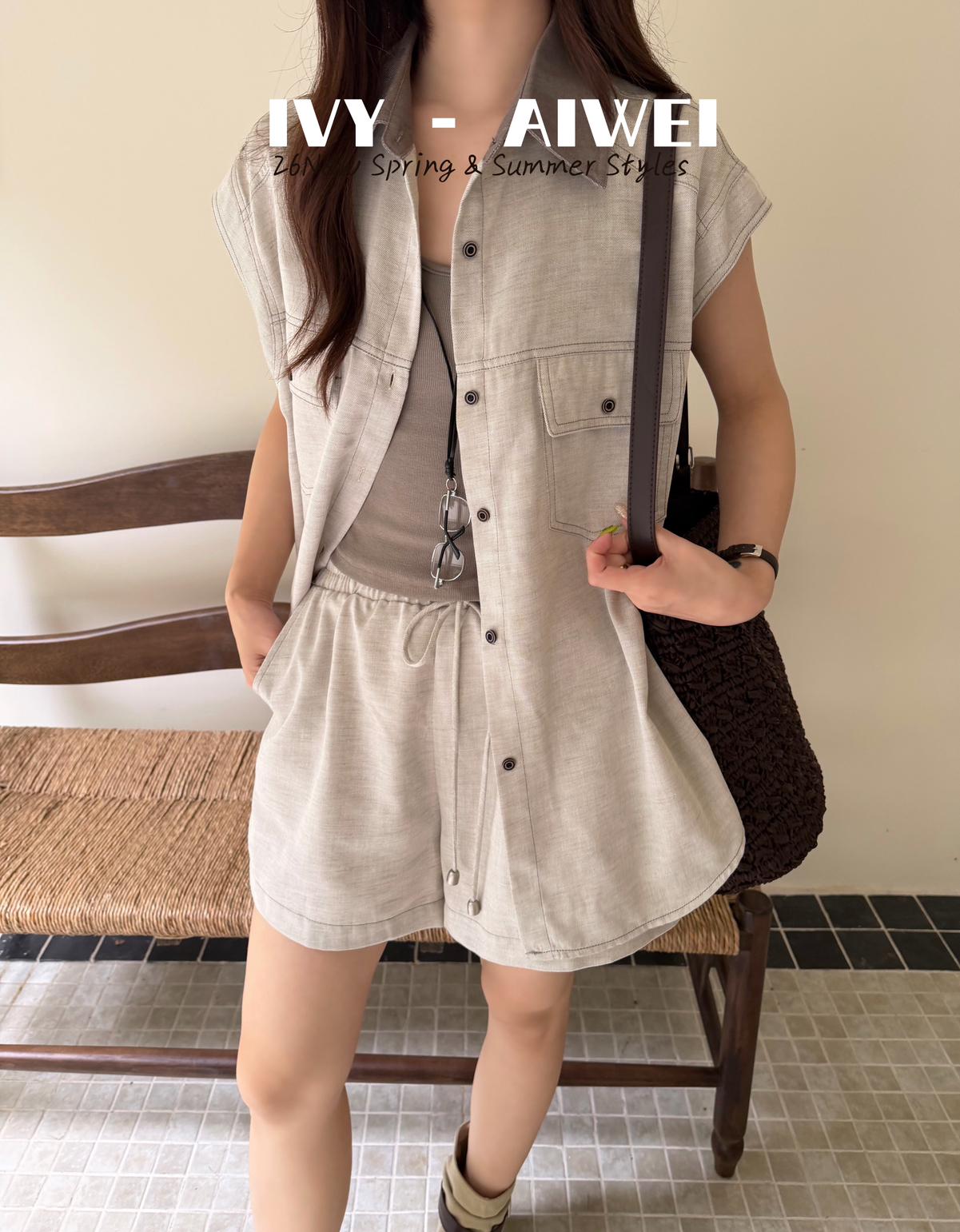 【C9262】韓系寬鬆撞色無袖襯衫+純色百搭顯瘦背心+鬆緊高腰闊腿休閒短褲套裝(配掛飾)(三件套)