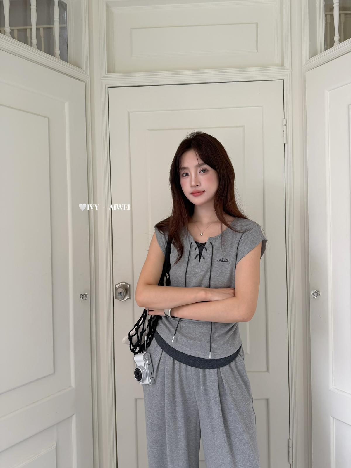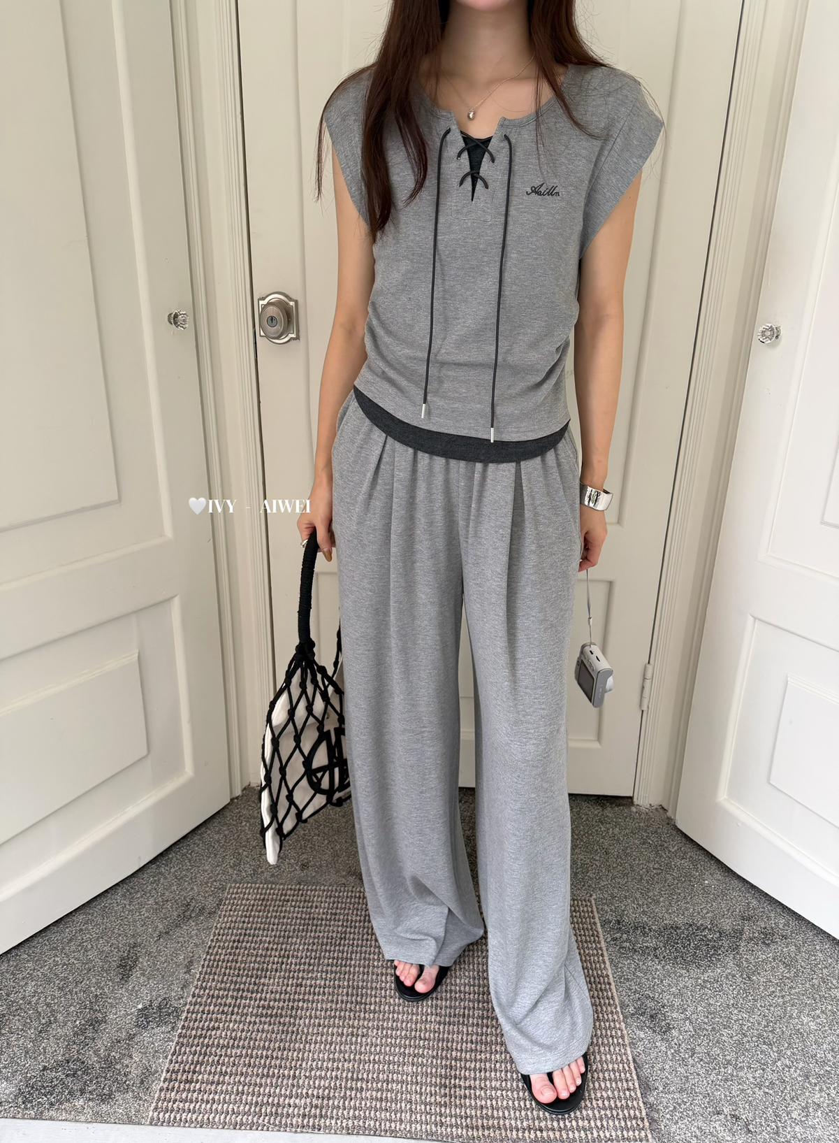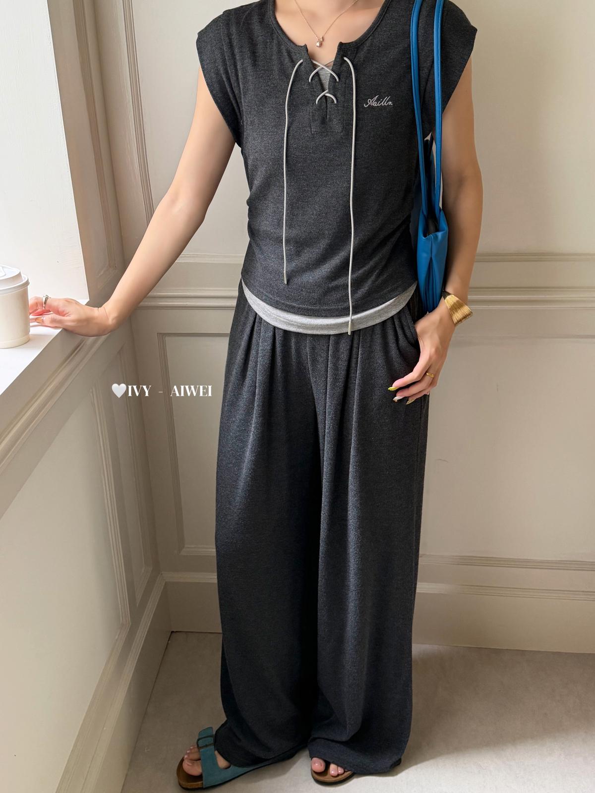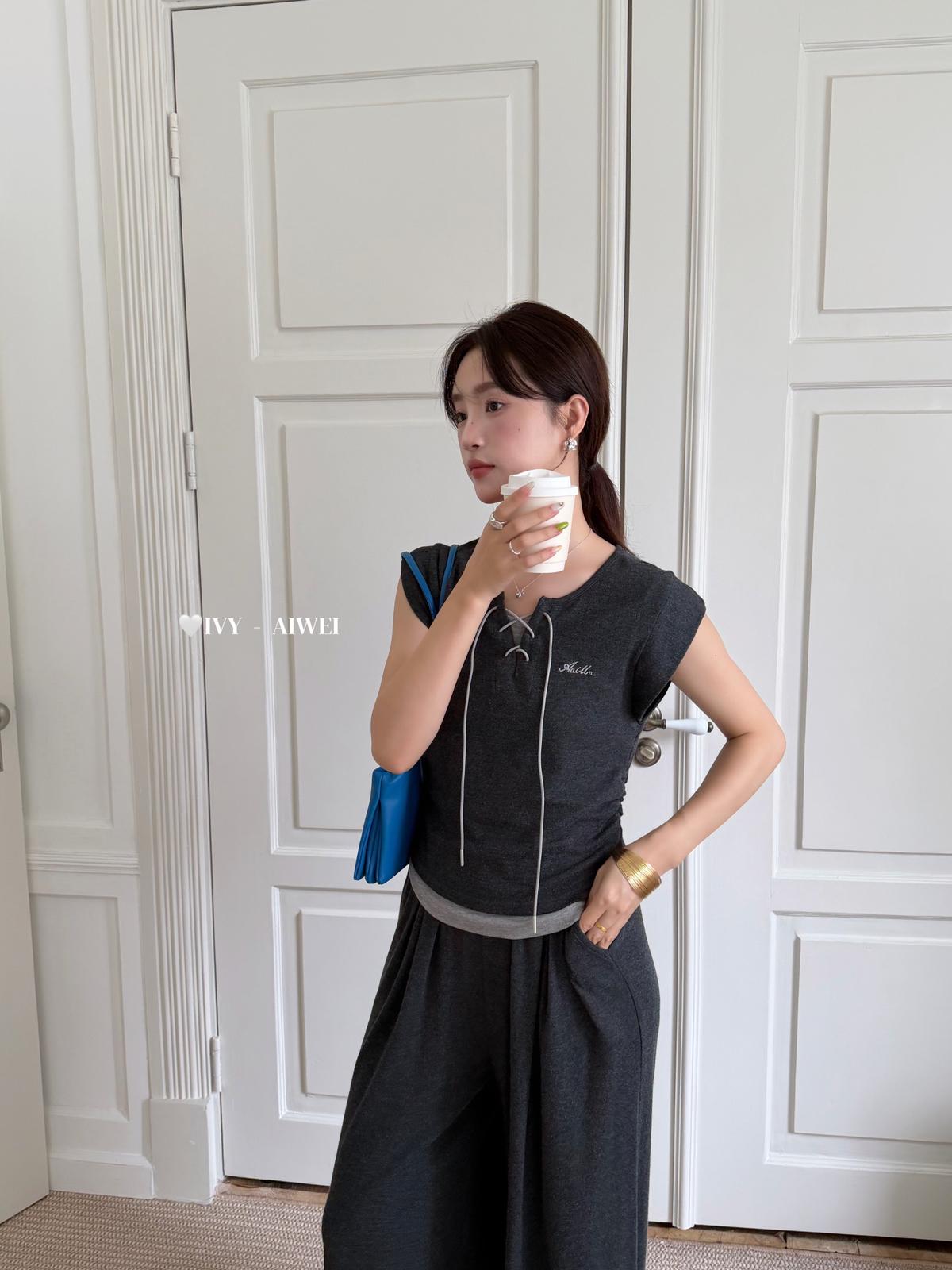 【C9263】韓系假兩件短袖T恤+高腰垂感休閒闊腿褲兩件套套裝