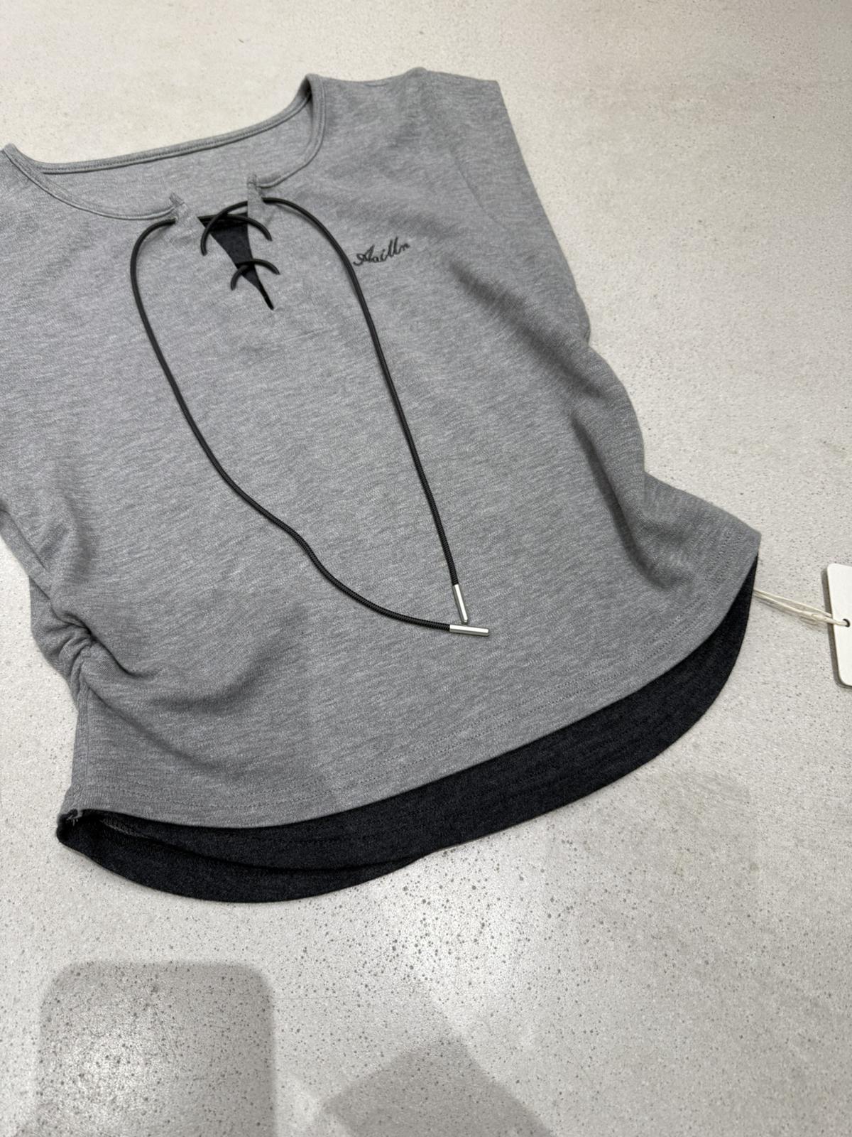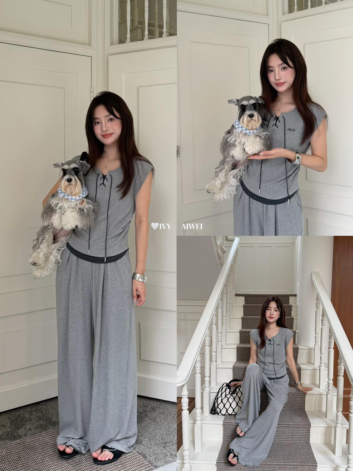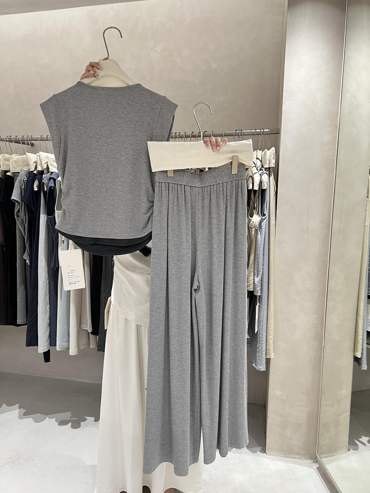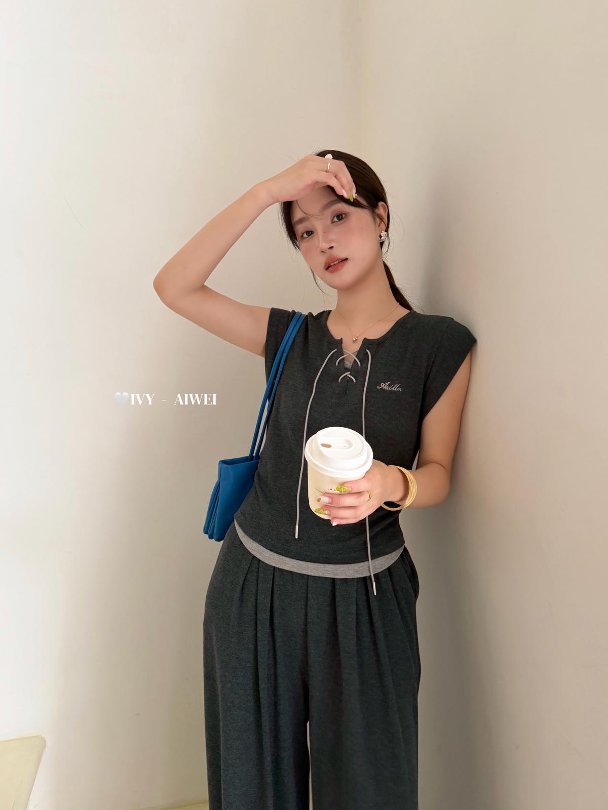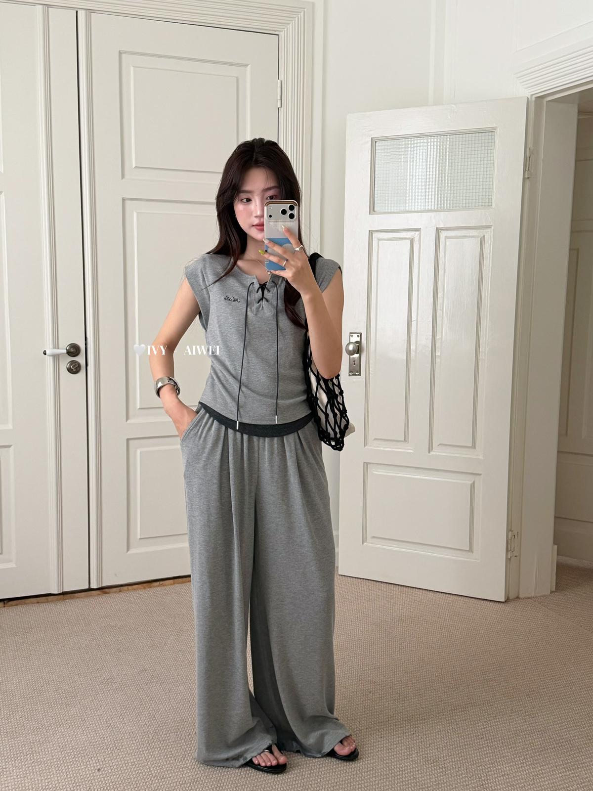 【C9263】韓系假兩件短袖T恤+高腰垂感休閒闊腿褲兩件套套裝