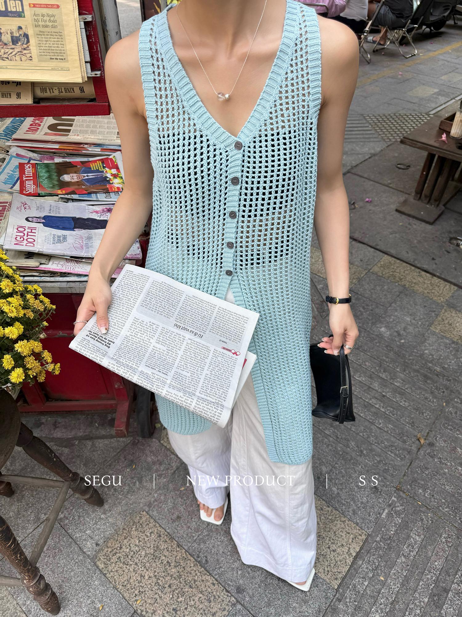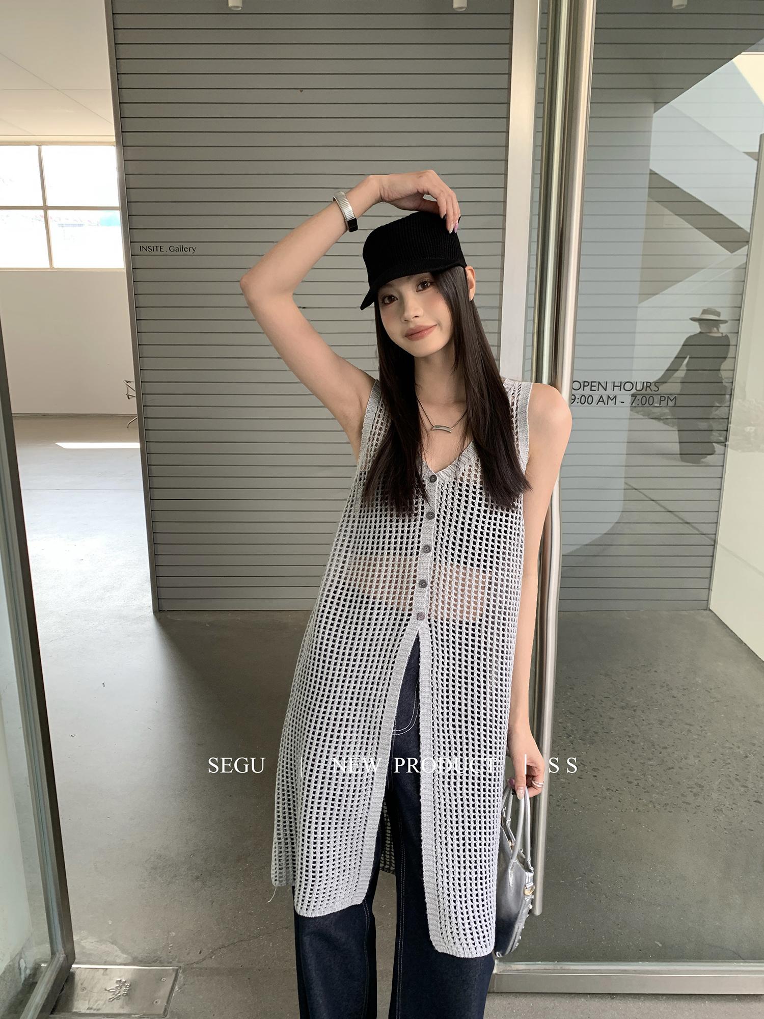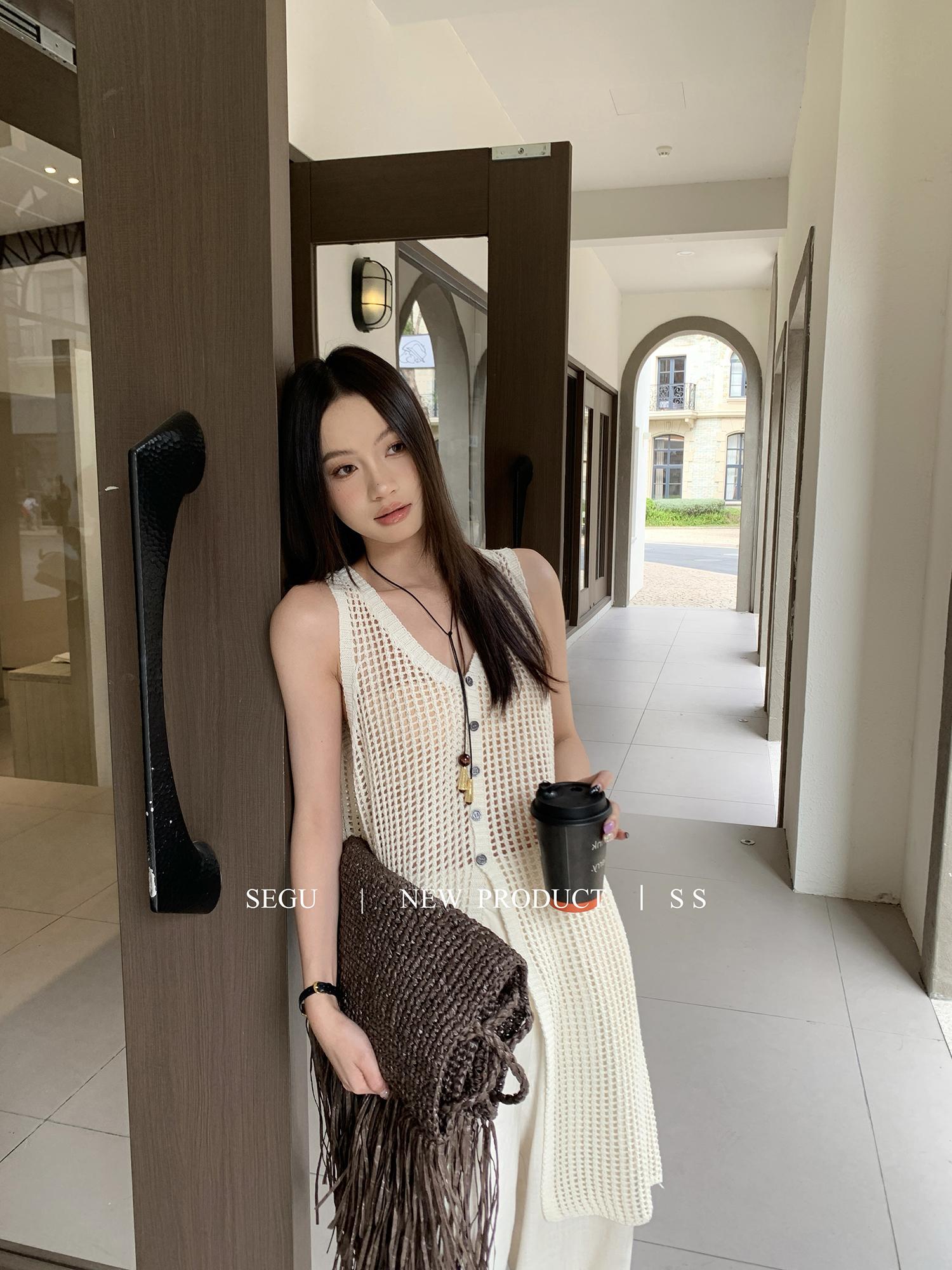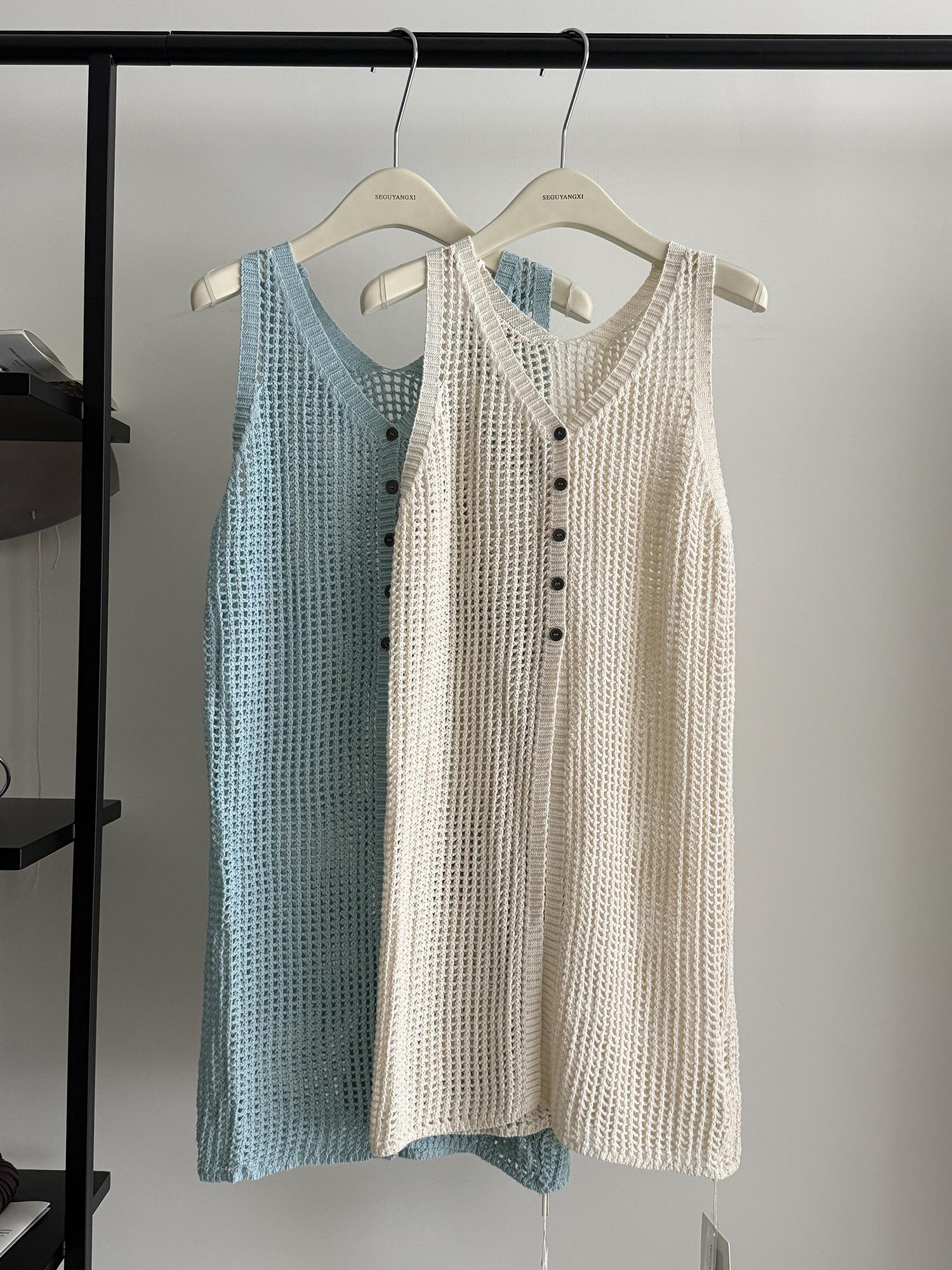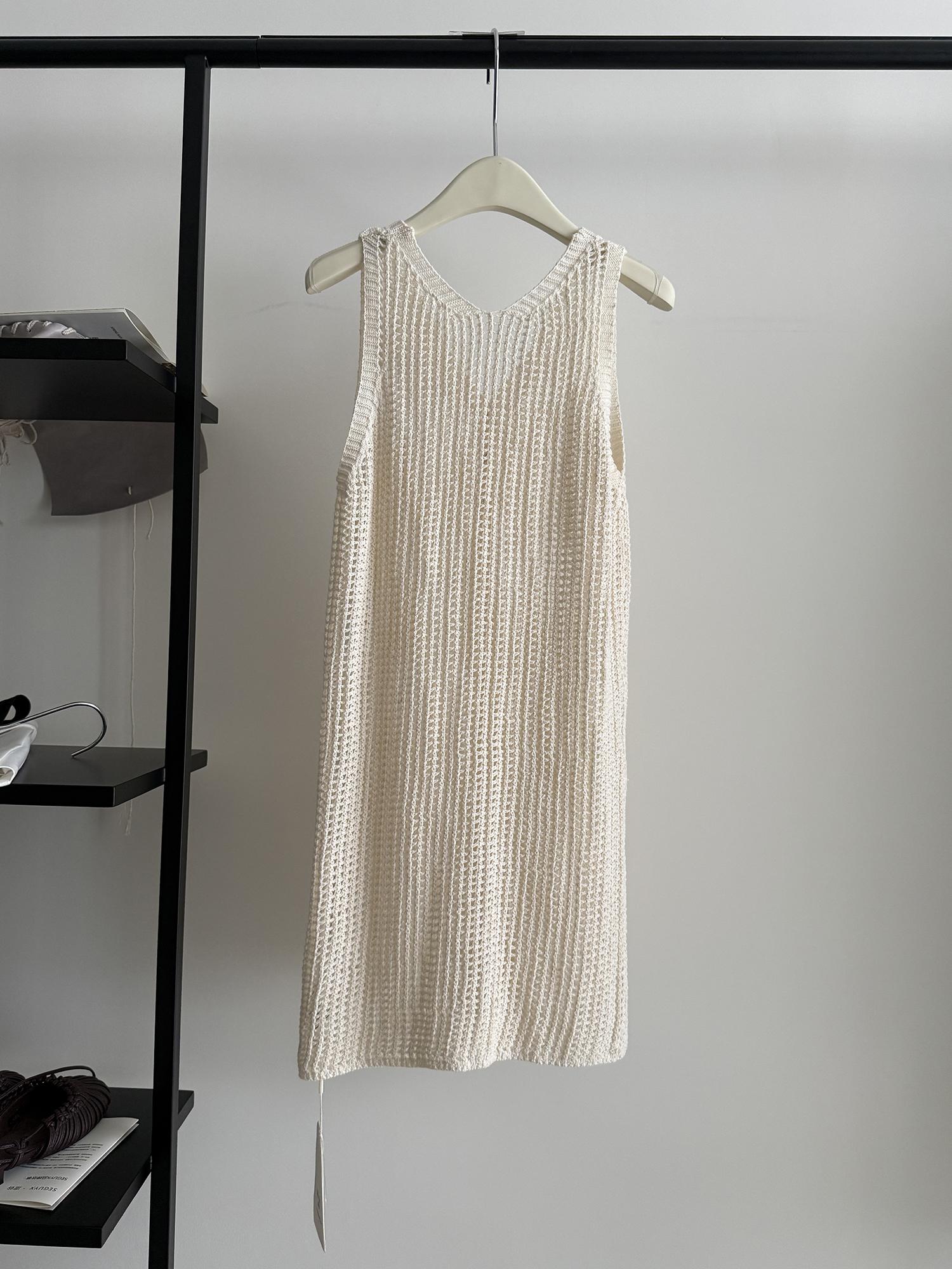 【C9267】韓系純欲風軟糯透氣薄款V領鏤空中長款針織連衣裙