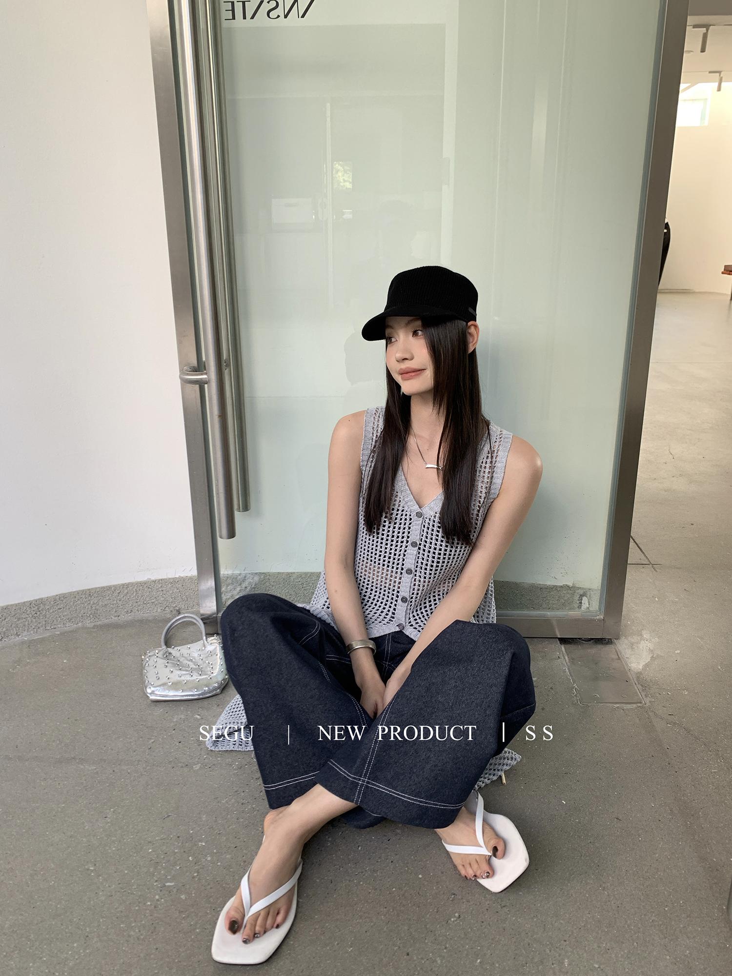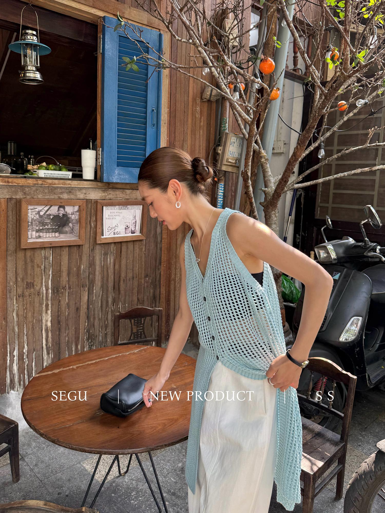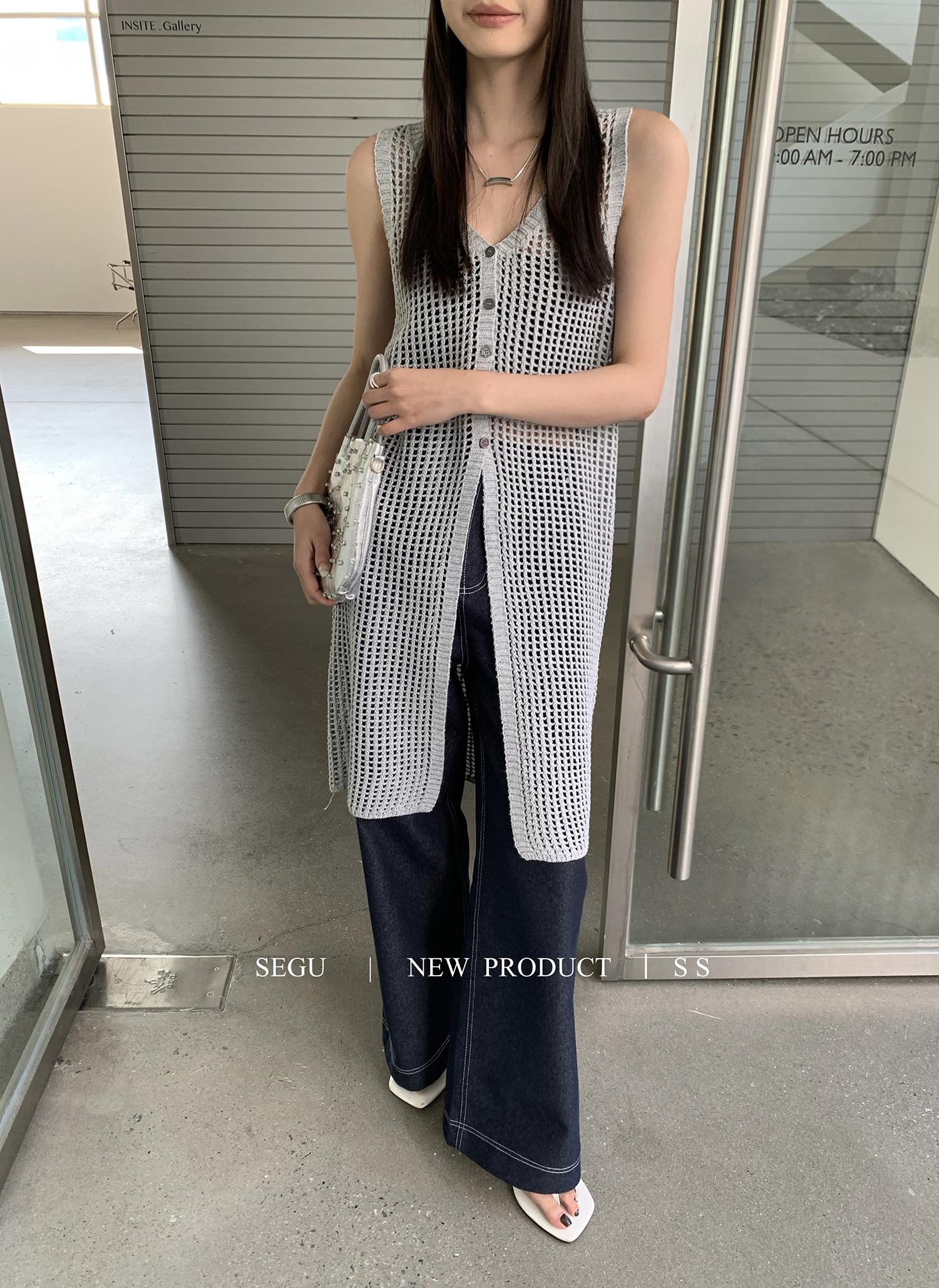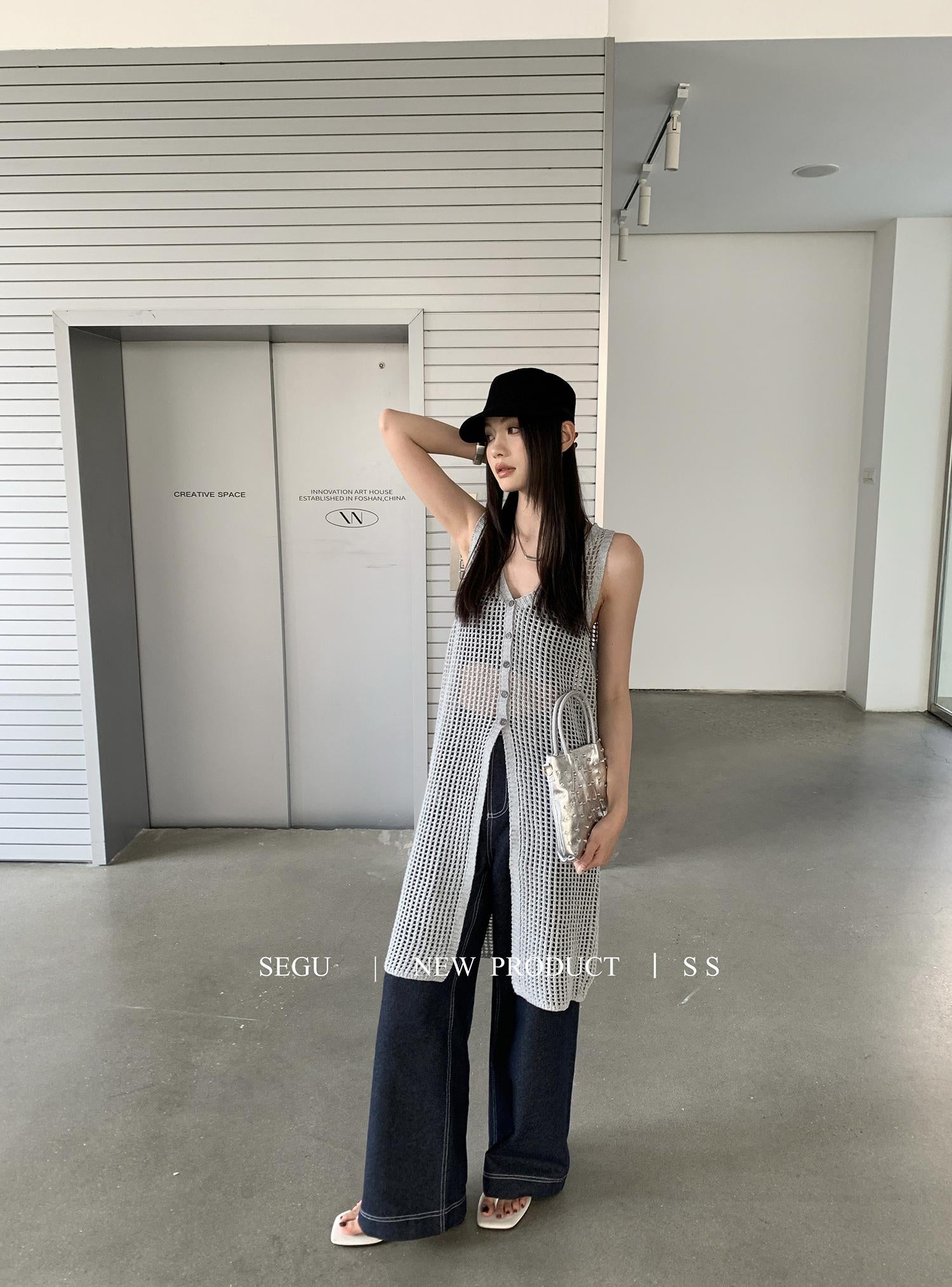 【C9267】韓系純欲風軟糯透氣薄款V領鏤空中長款針織連衣裙