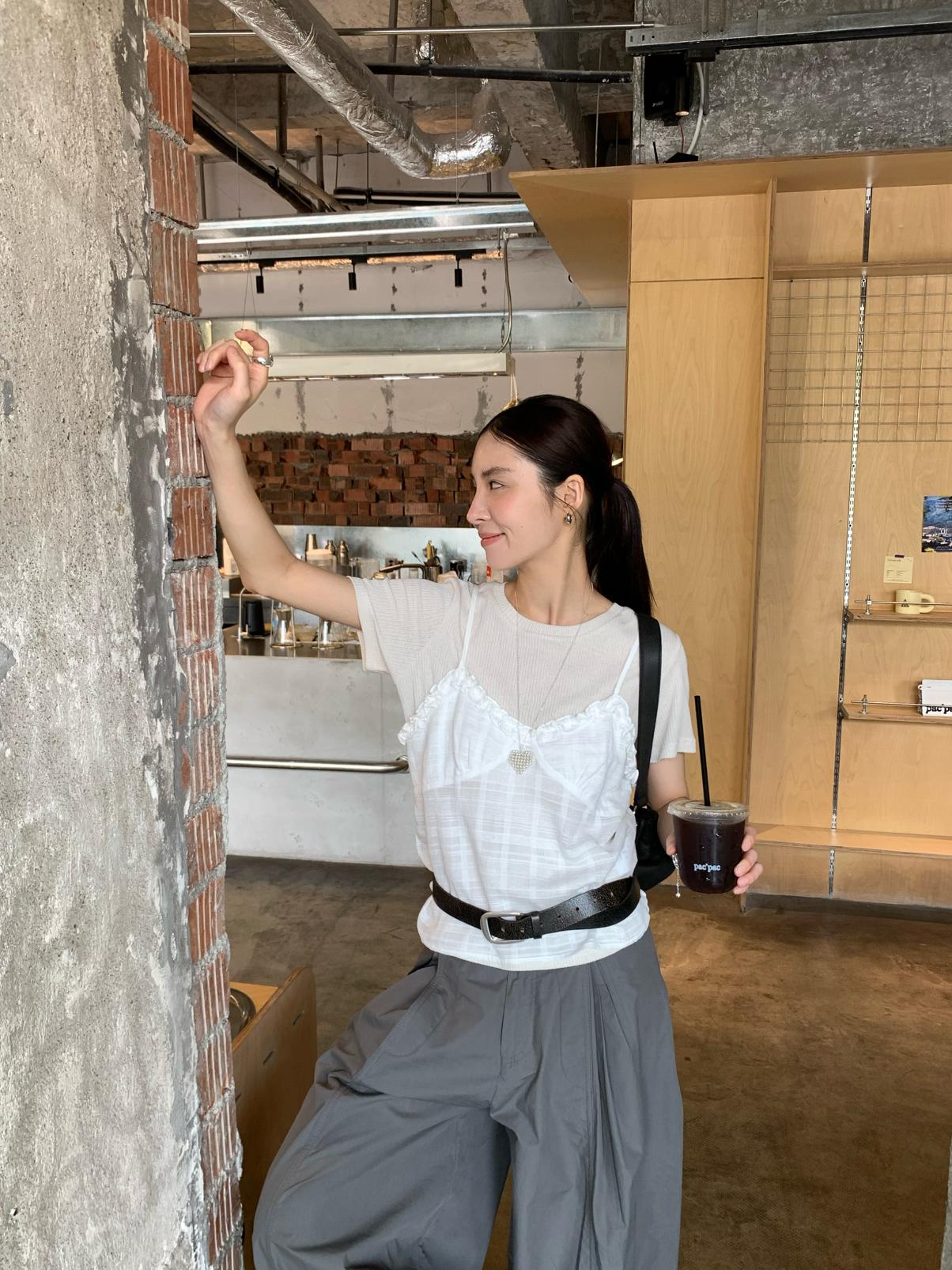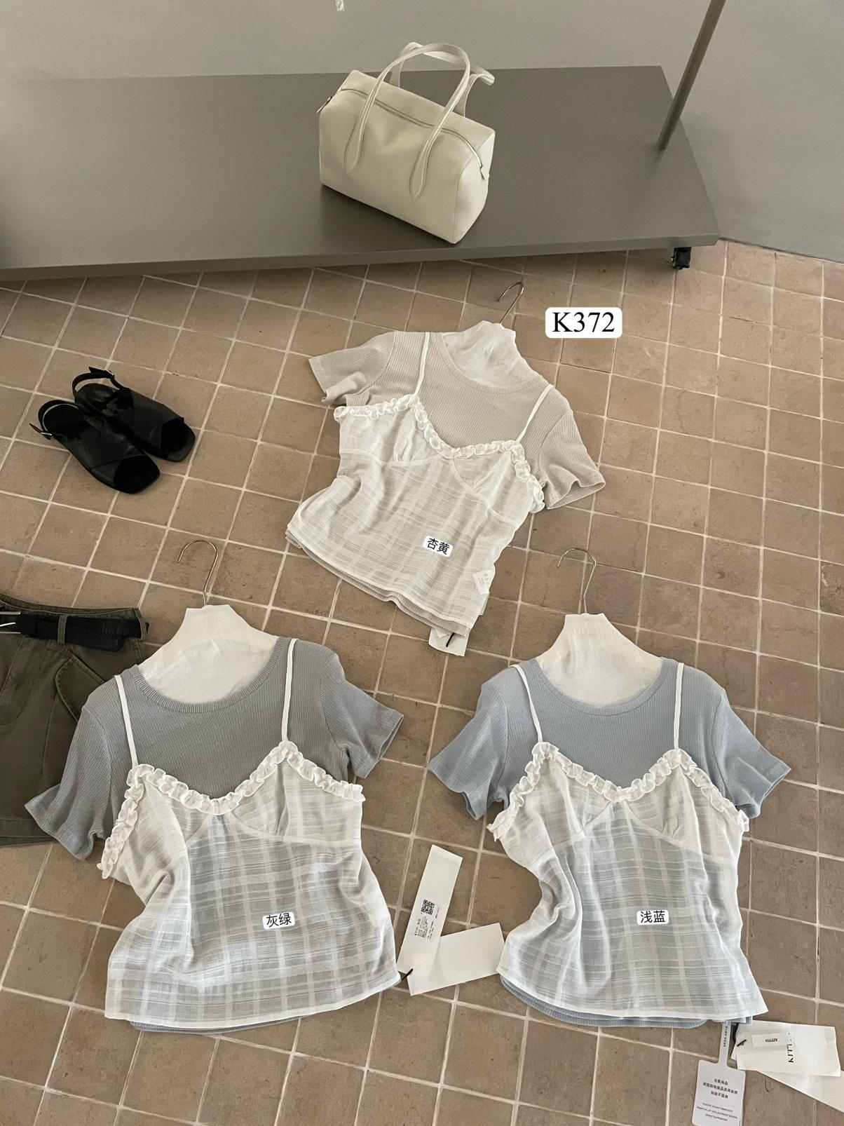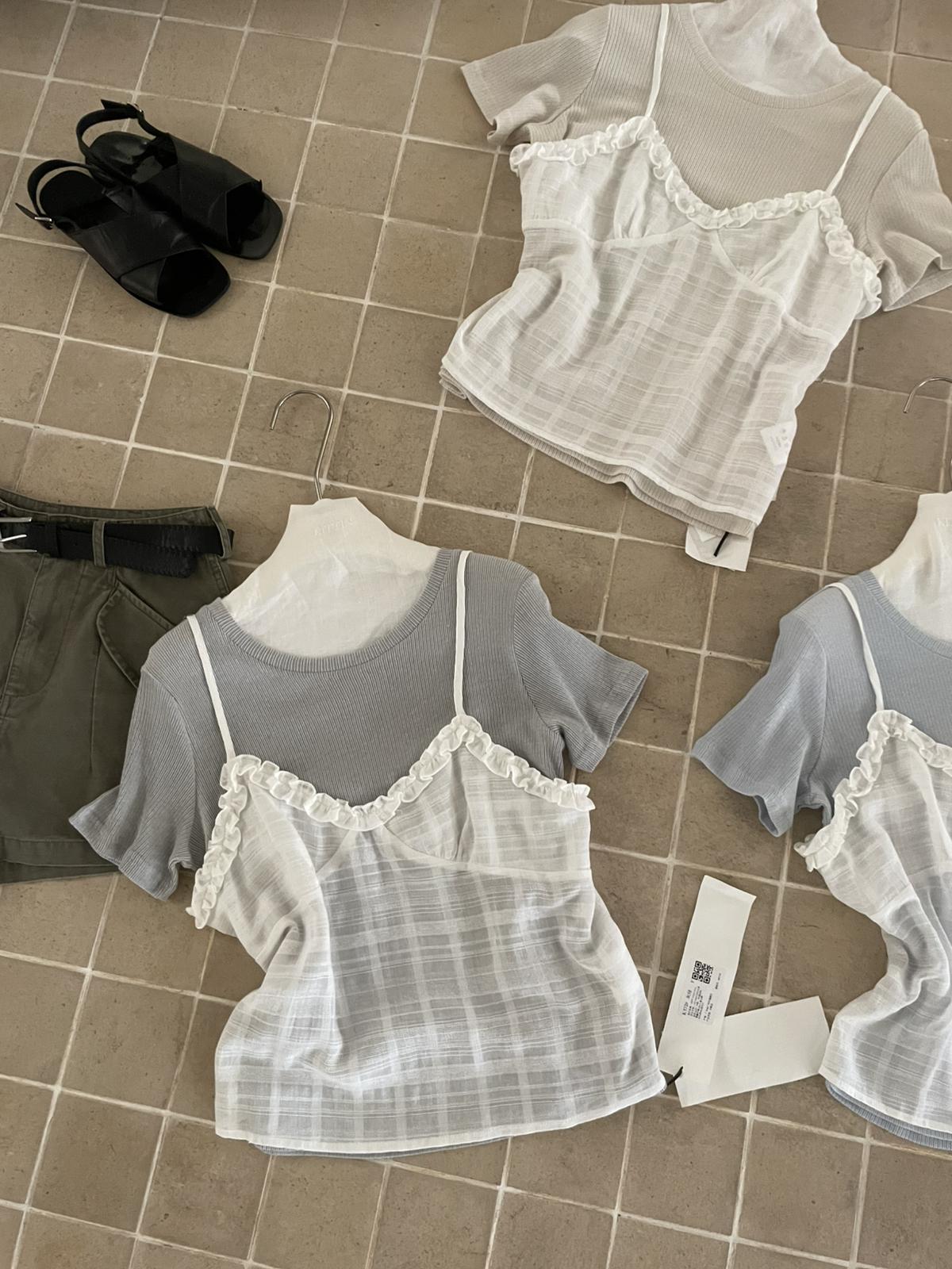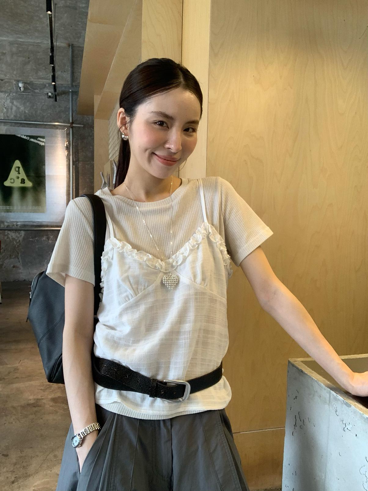 【C9273】韓系正肩短袖T恤+吊帶花邊背心兩件套套裝
