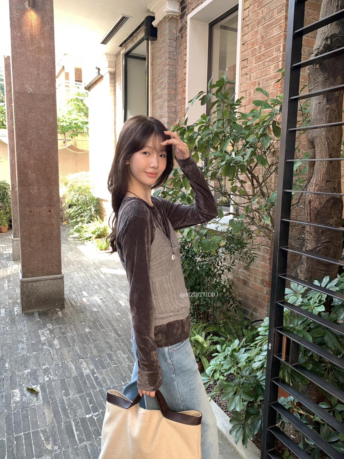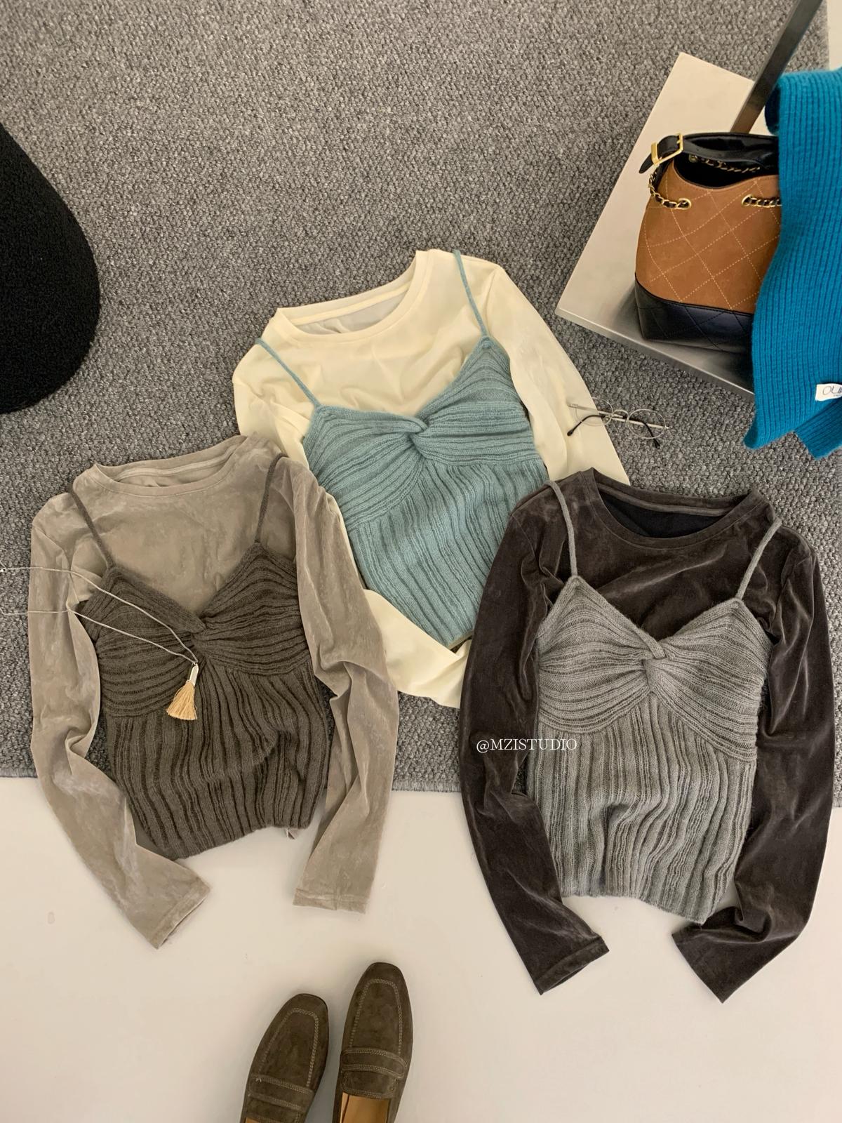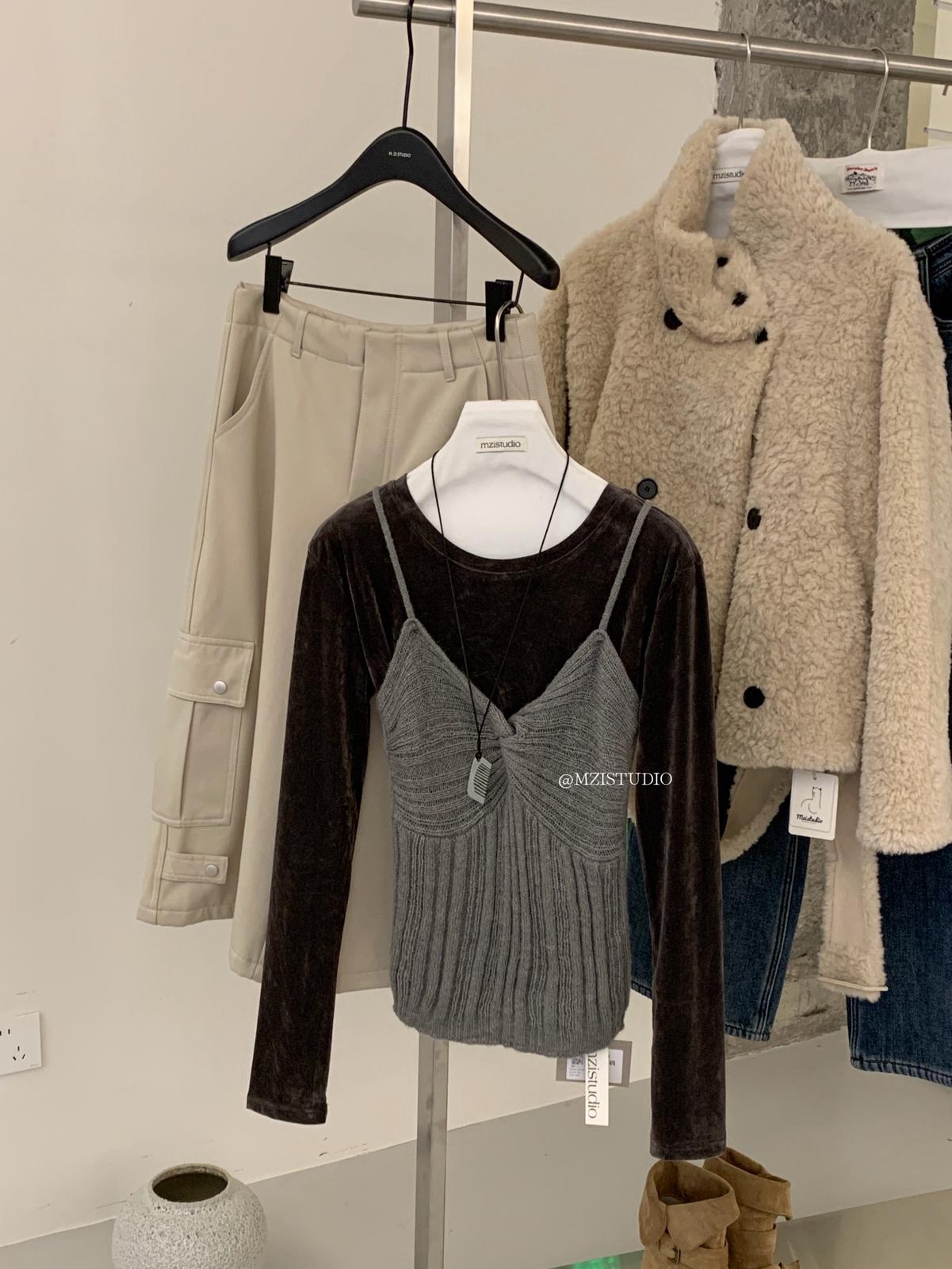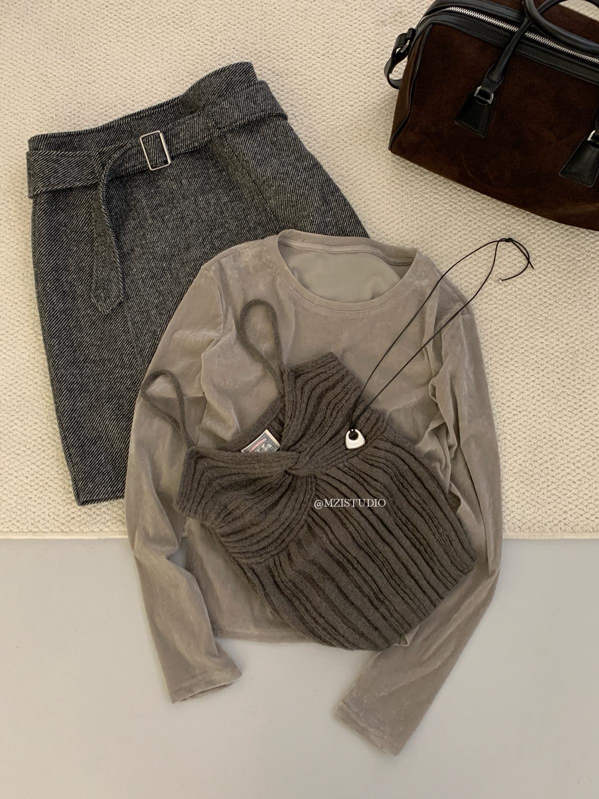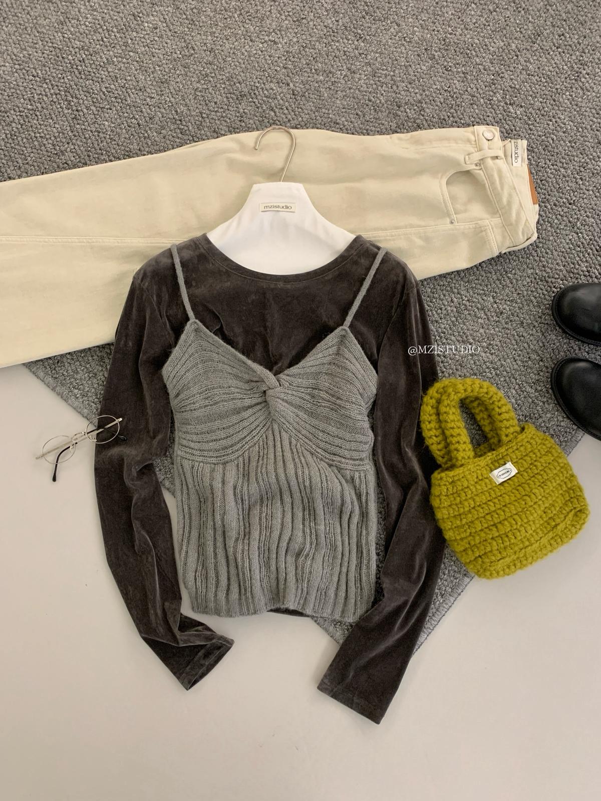 【C7904】顯露精緻釋放氣質韓系針織修身顯瘦背心+皮絨貼身套頭打底衫套裝