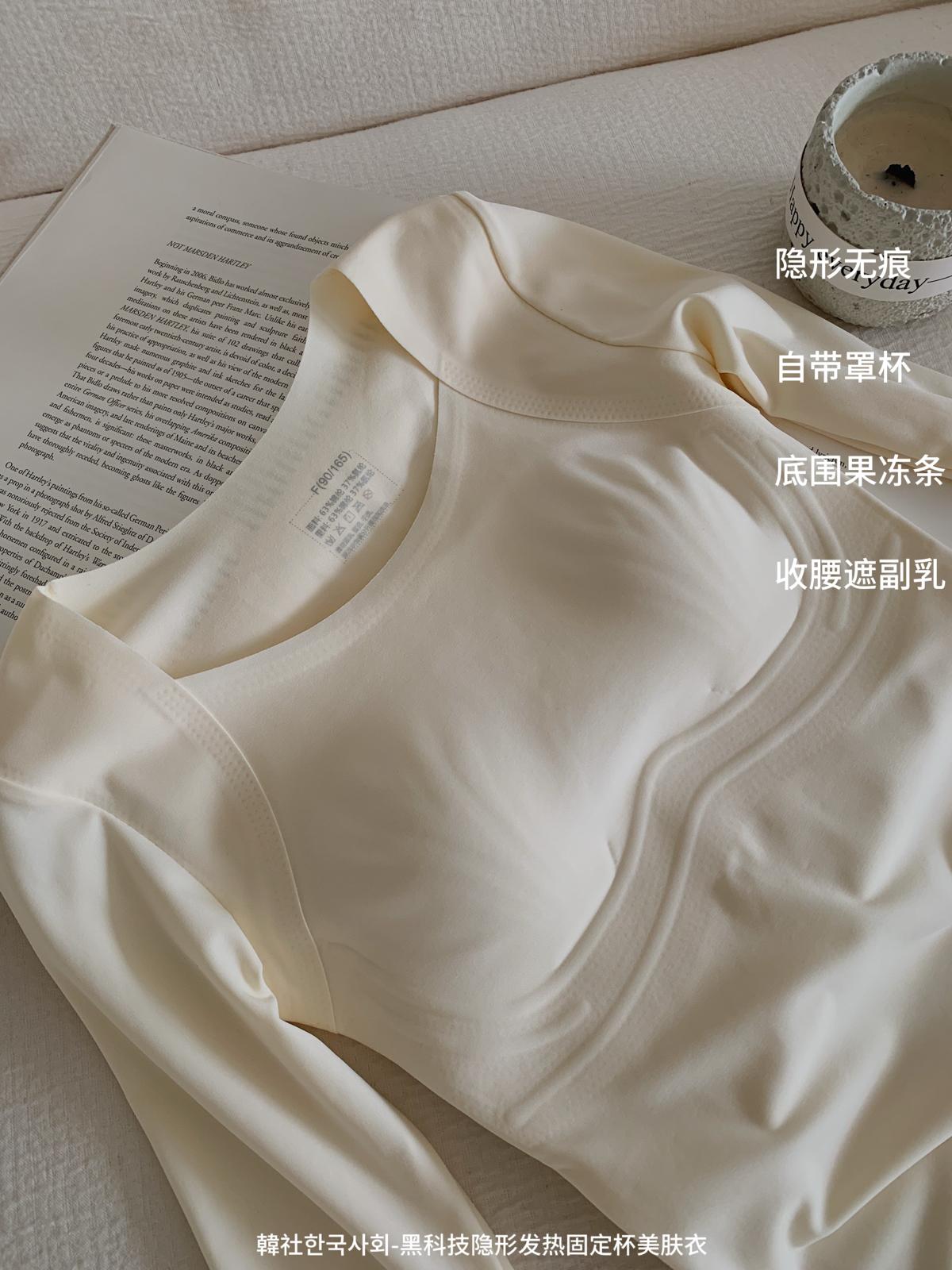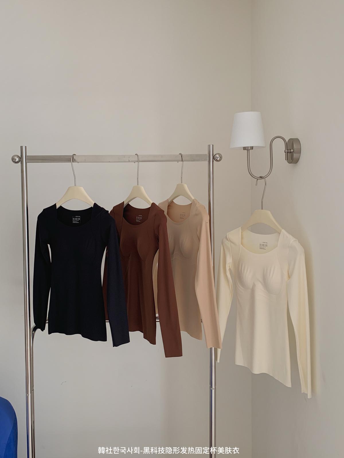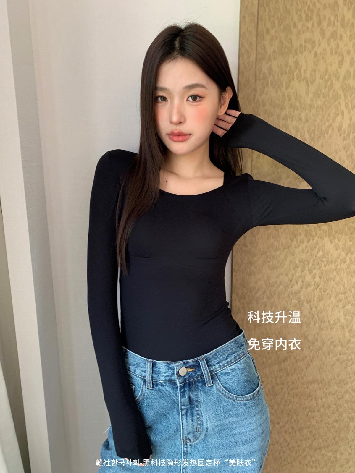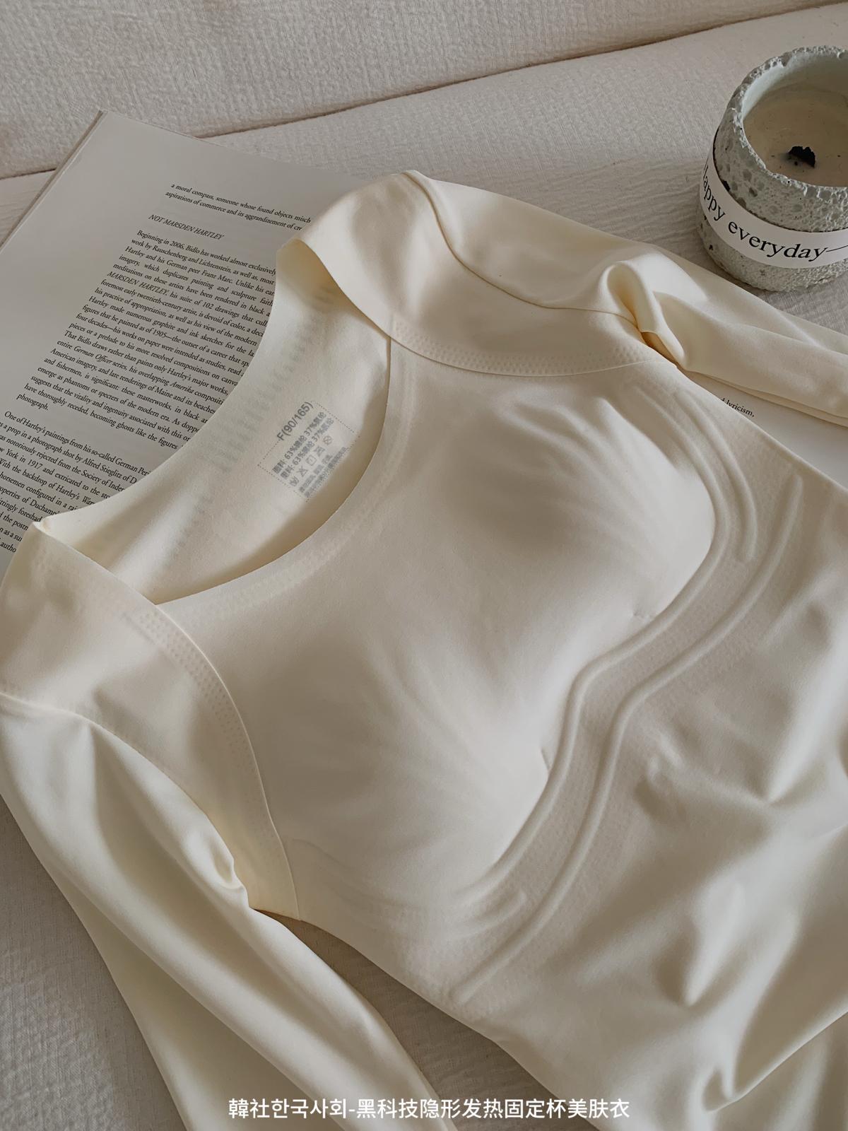 【C7860】黑科技隱形發熱固定杯美膚衣女秋冬舒適純色圓領長袖內搭上衣保暖衣