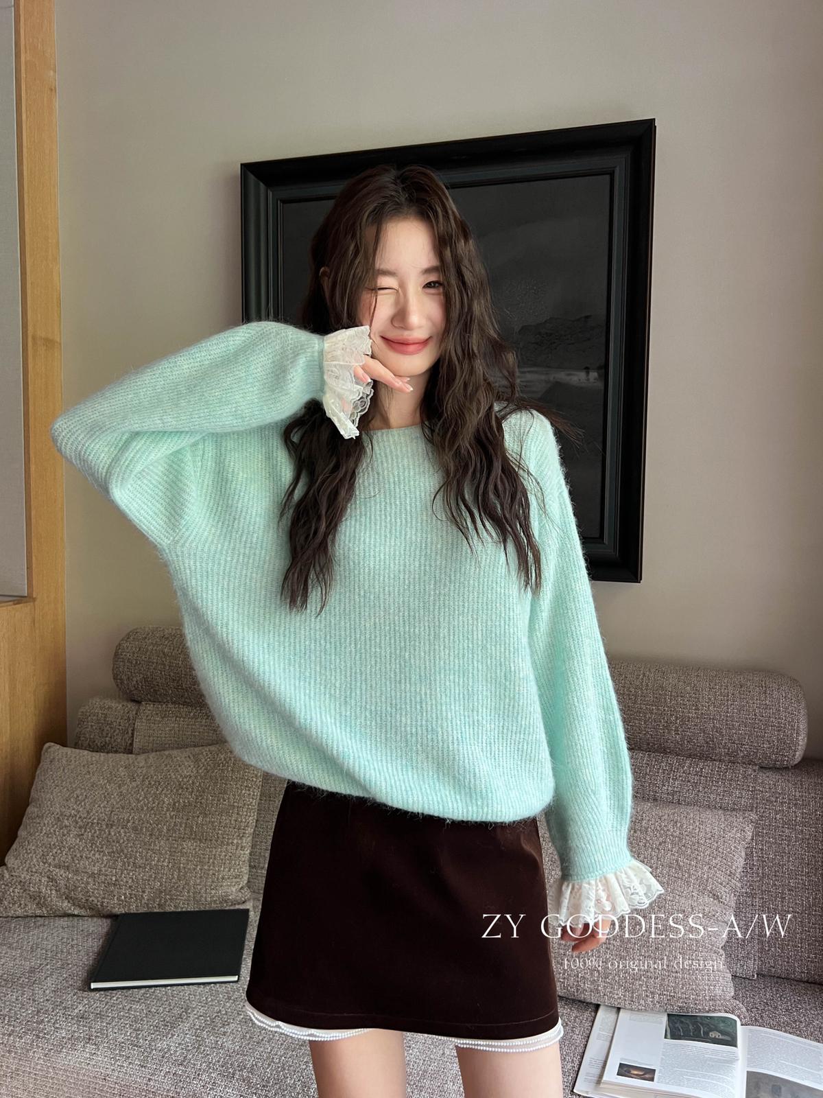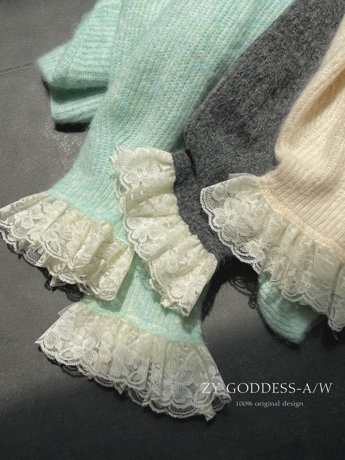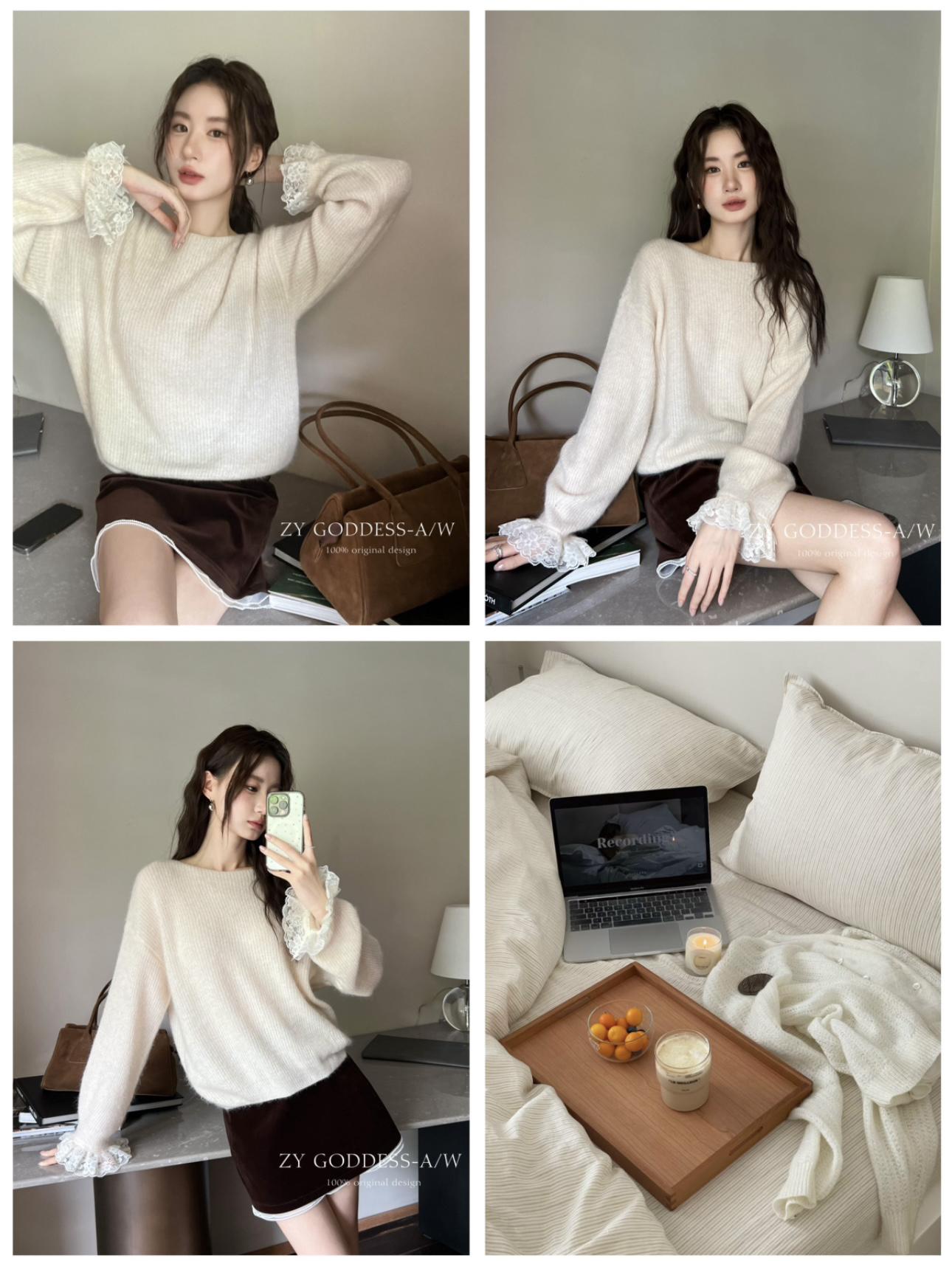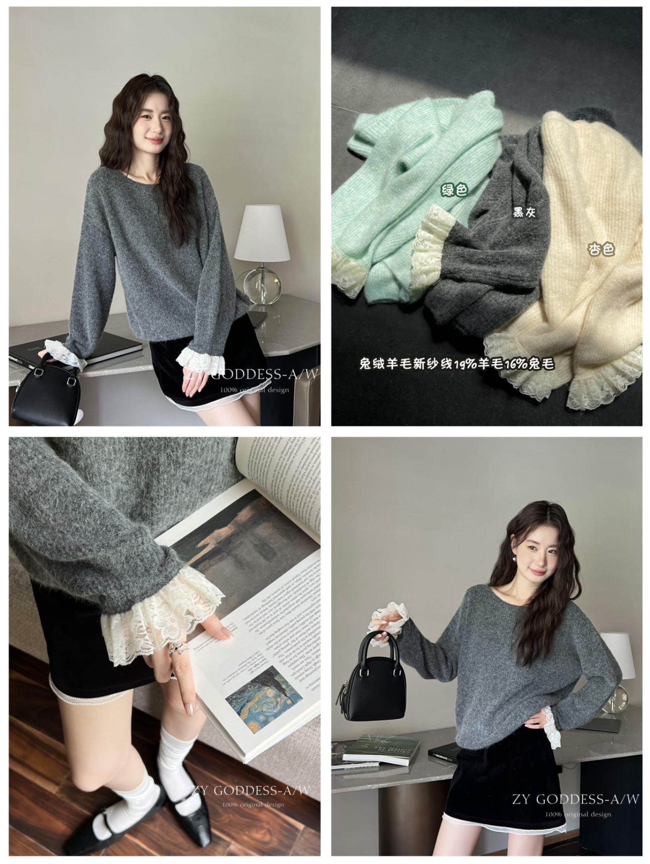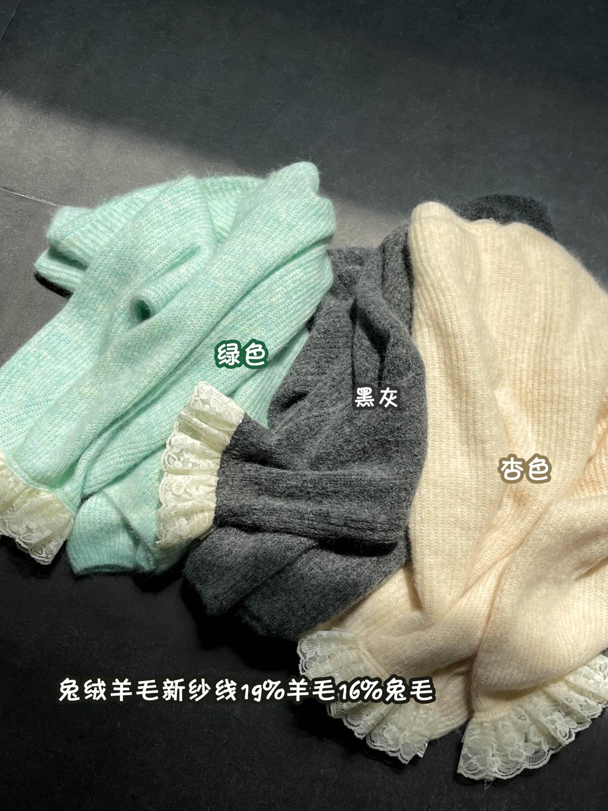 【C7916】軟糯仙系 · 羊毛兔毛甜美減齡min系拼接蕾絲袖口氛圍感保暖毛衣(含19%羊毛)(16%兔毛)