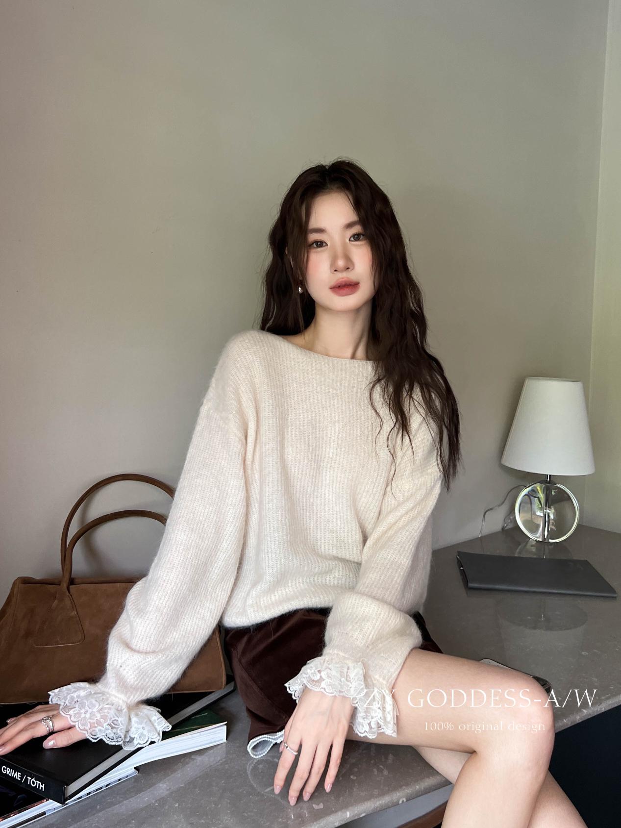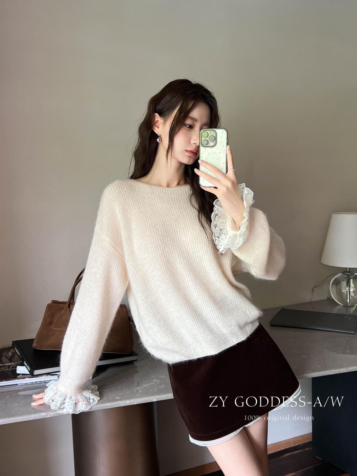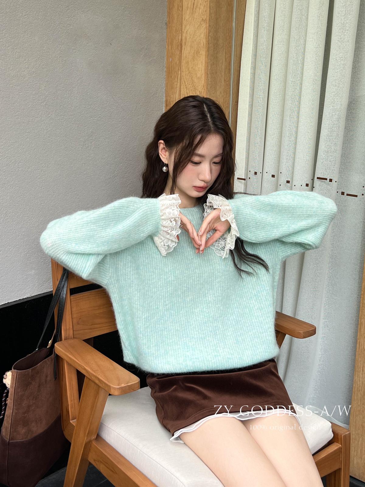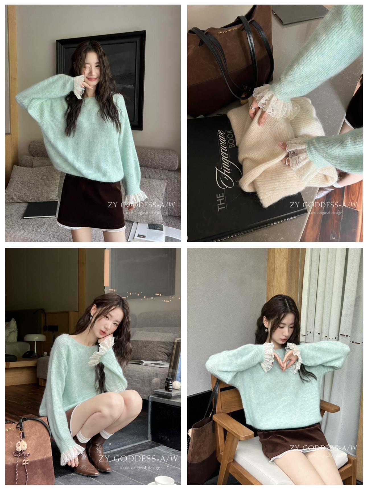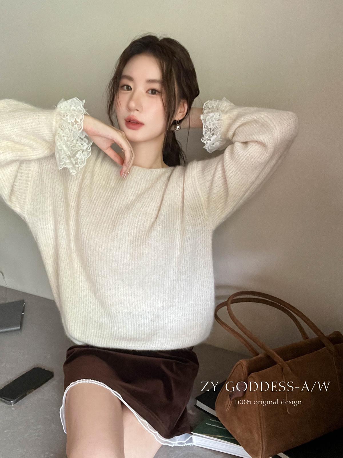 【C7916】軟糯仙系 · 羊毛兔毛甜美減齡min系拼接蕾絲袖口氛圍感保暖毛衣(含19%羊毛)(16%兔毛)