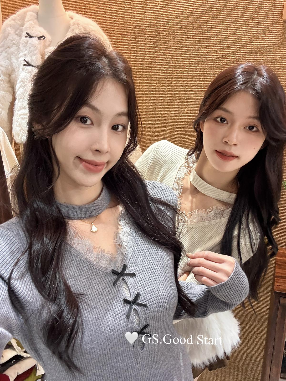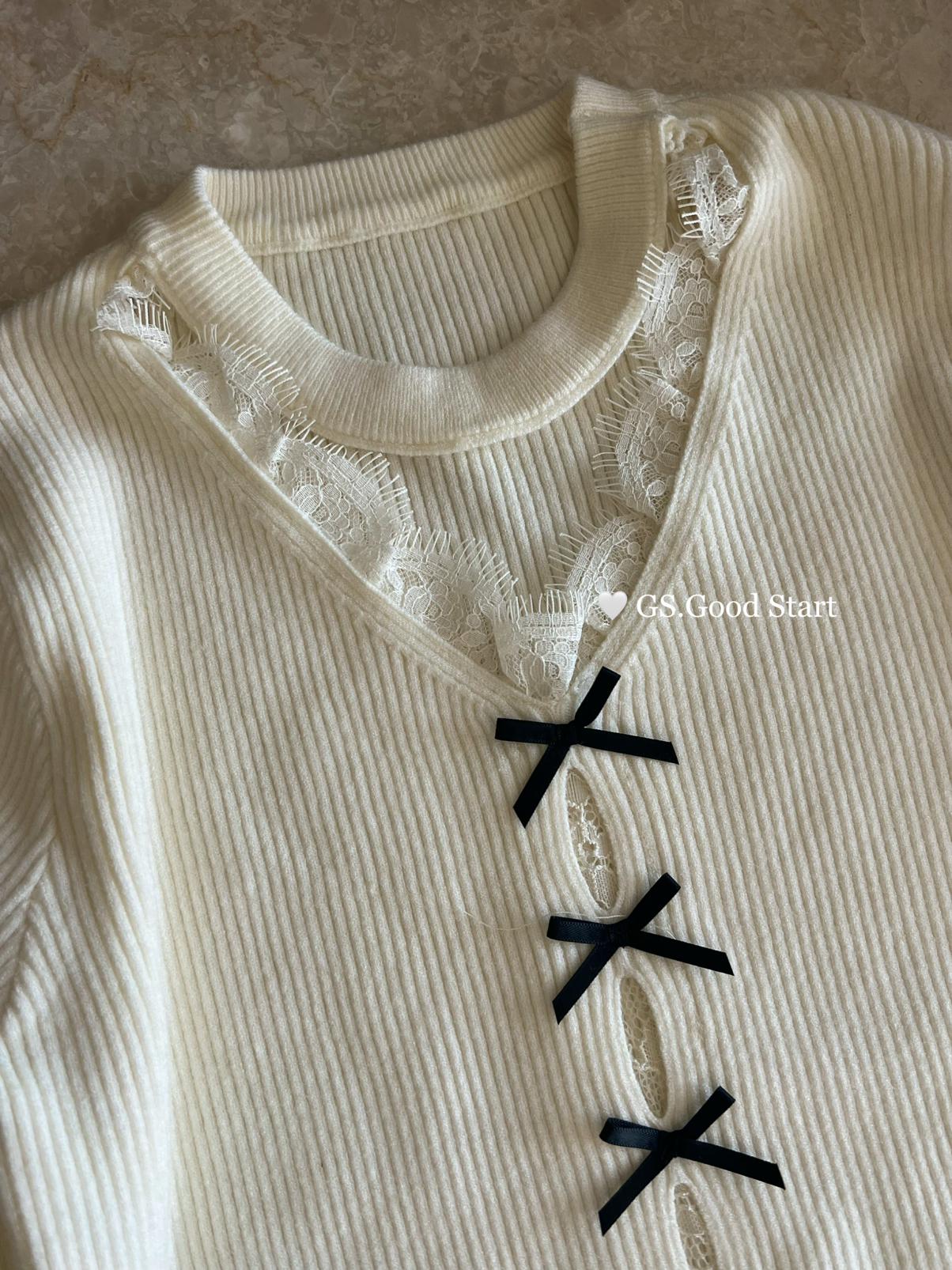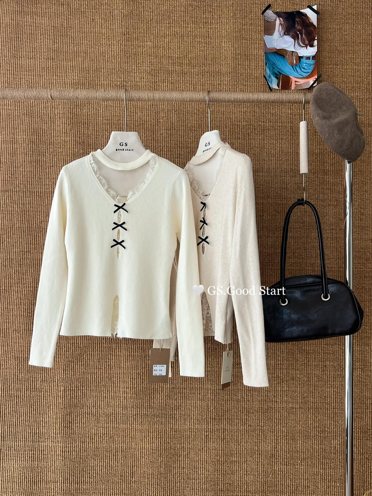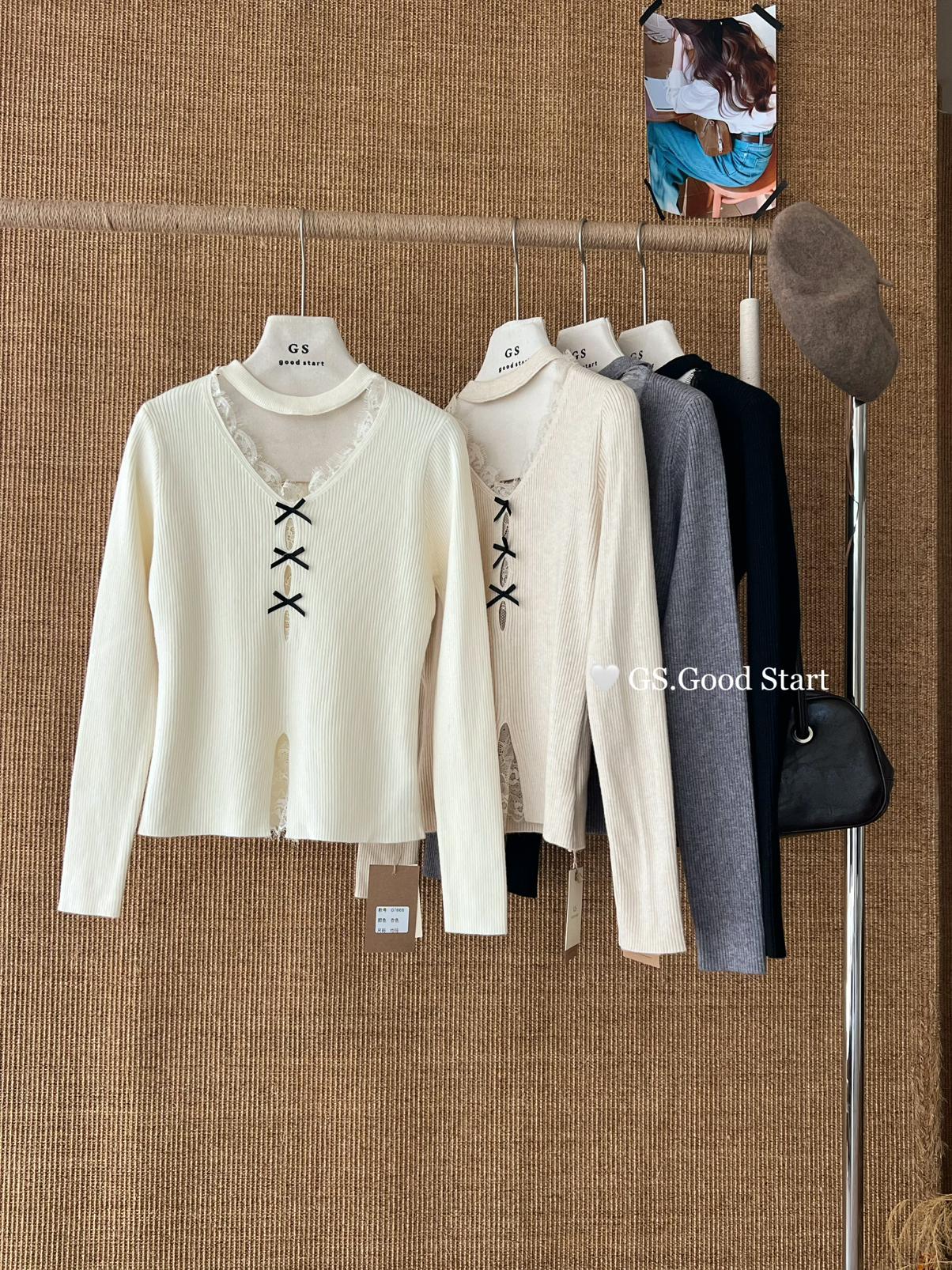 【C7862】超受歡迎!美女感很到位~秋冬純欲溫柔蕾絲拼接蝴蝶結針織小衫
