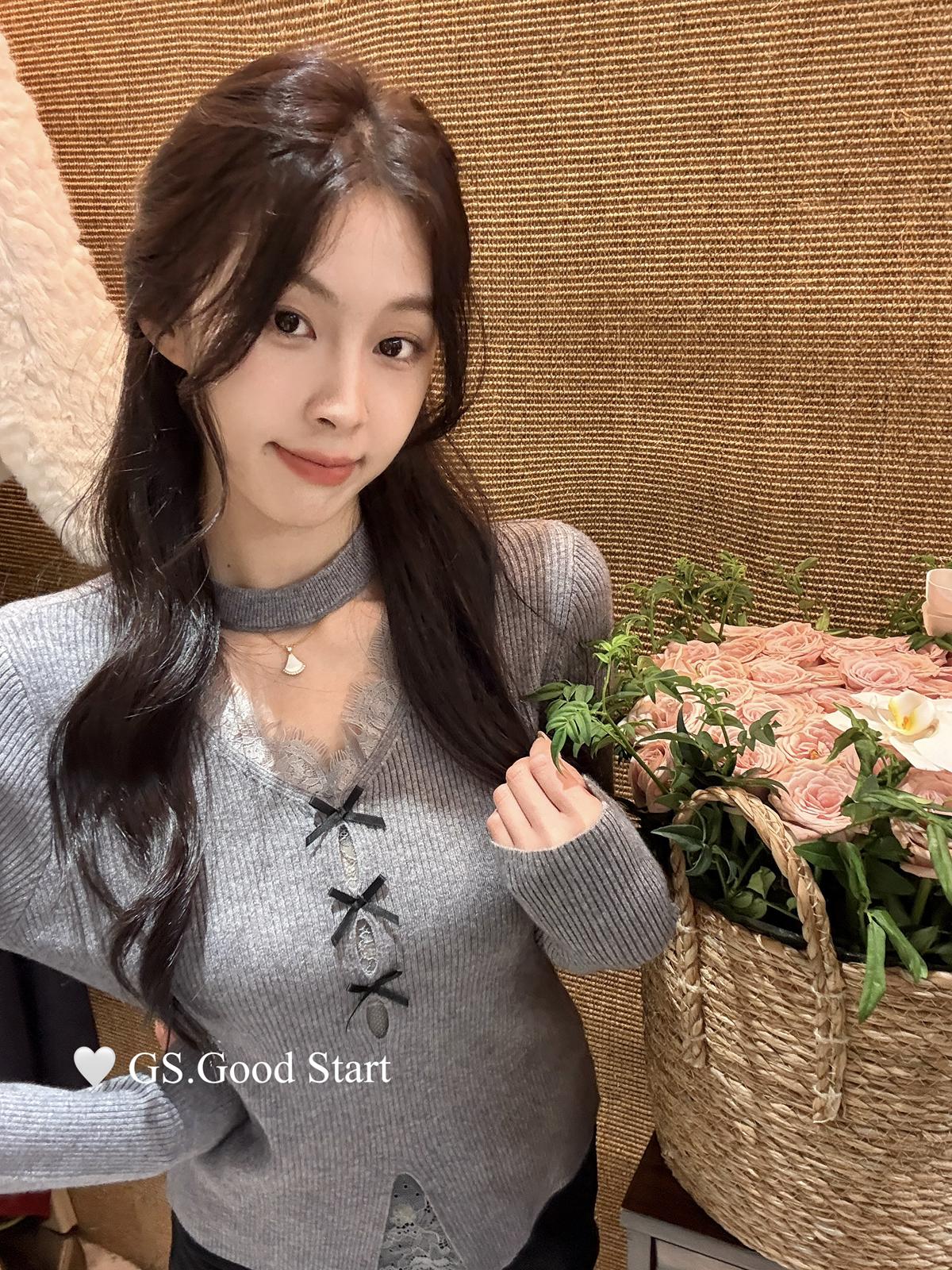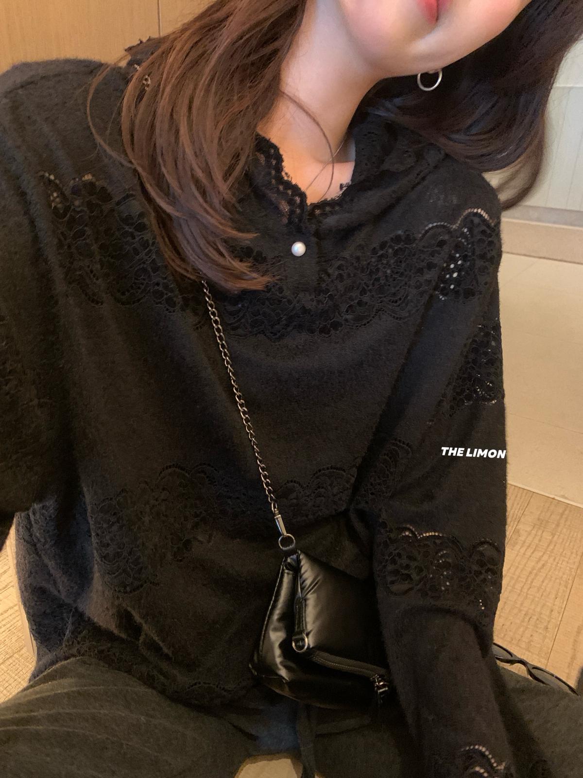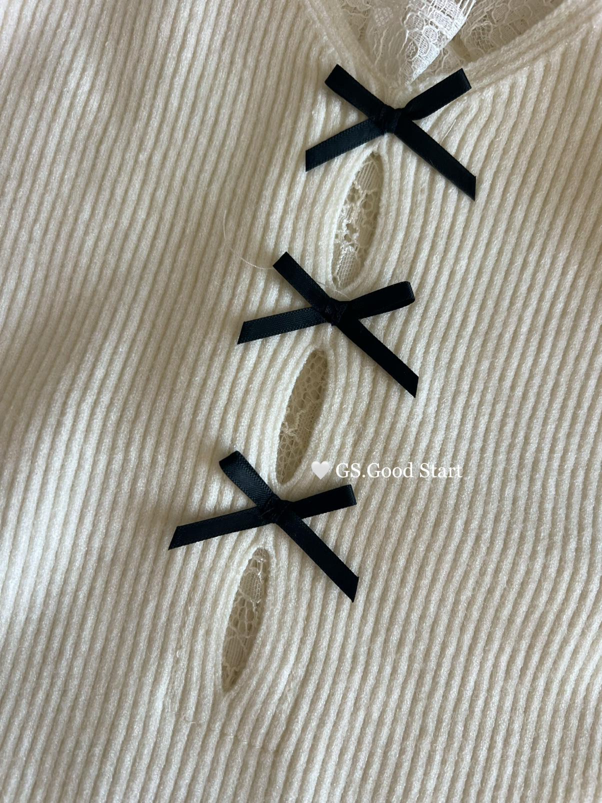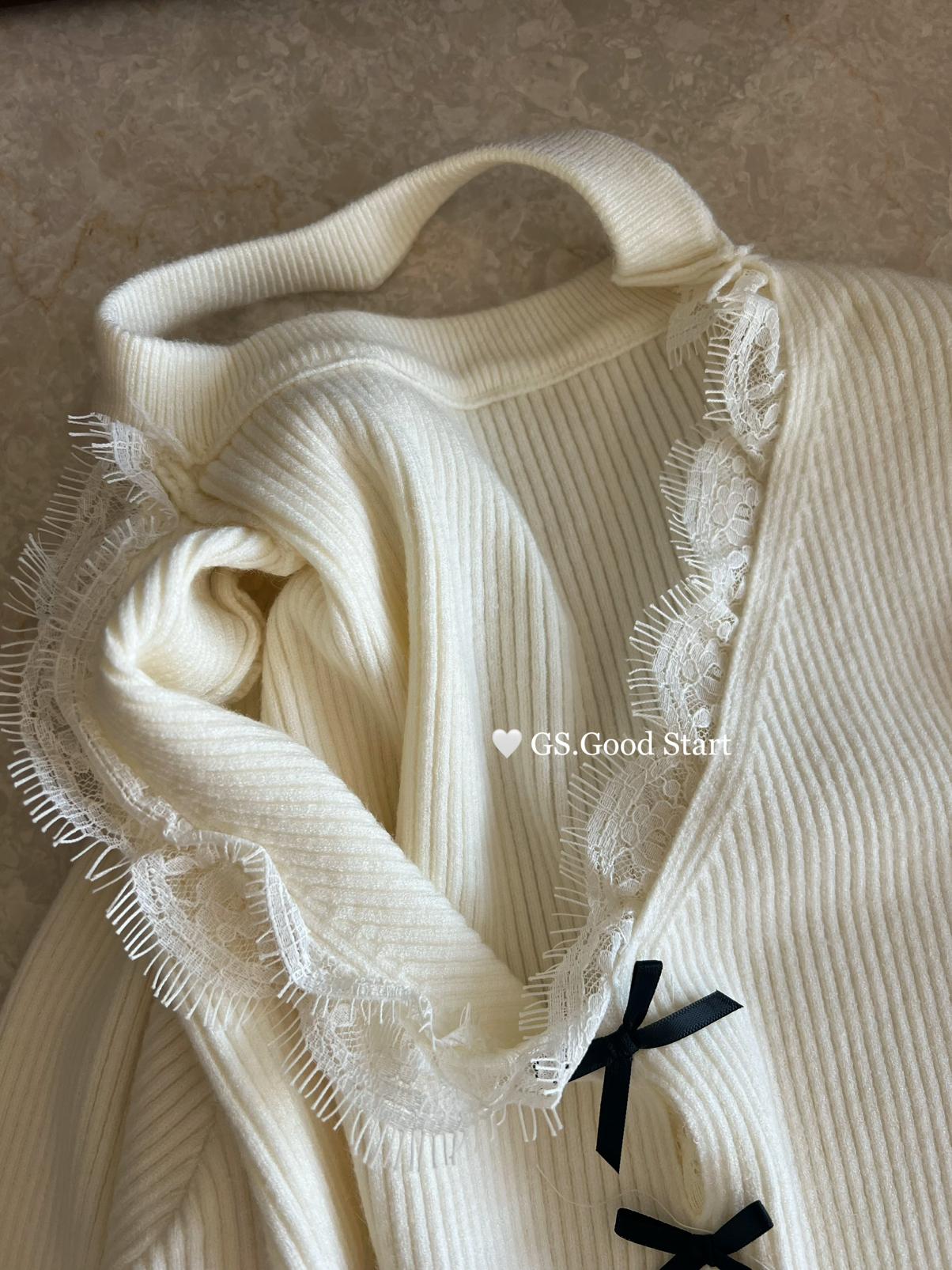 【C7862】超受歡迎!美女感很到位~秋冬純欲溫柔蕾絲拼接蝴蝶結針織小衫
