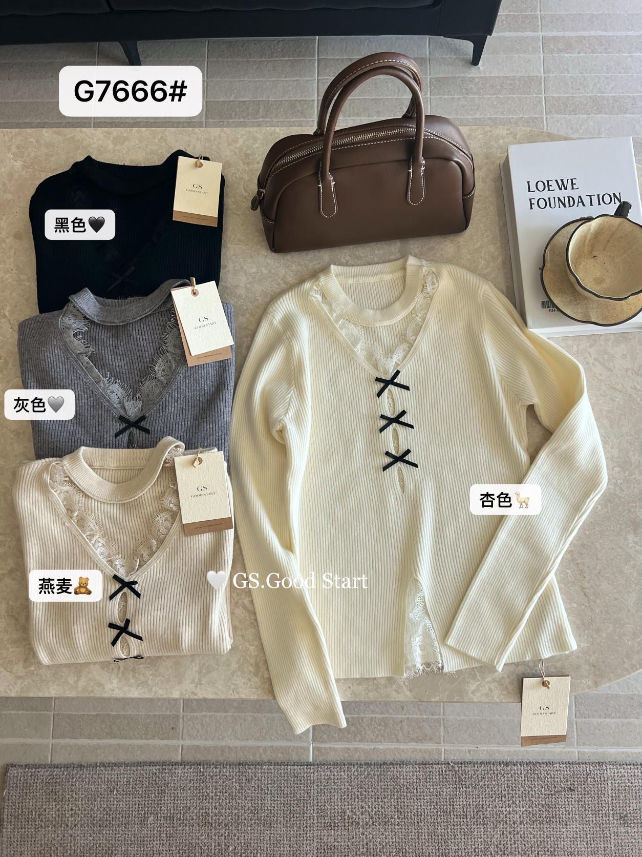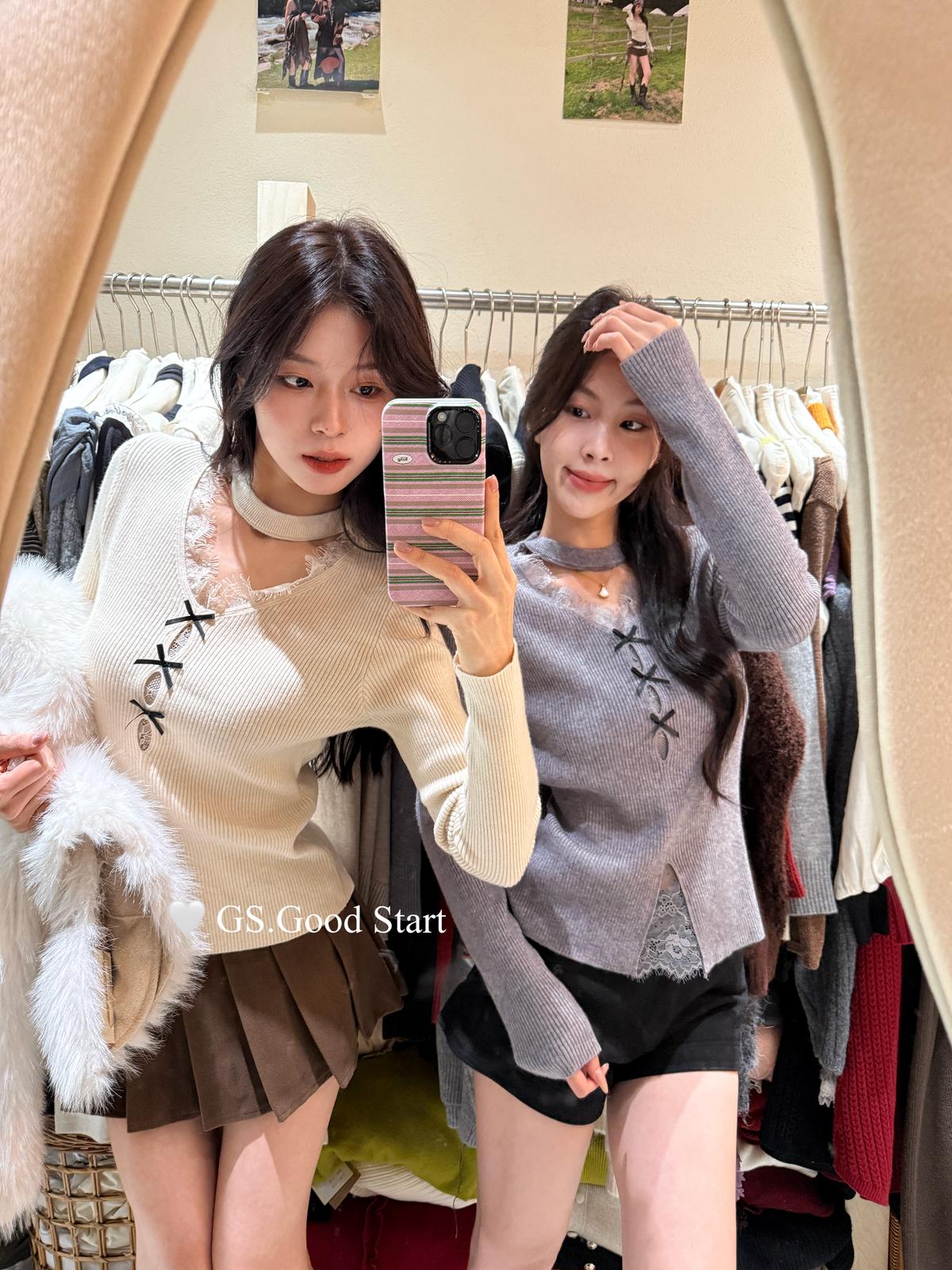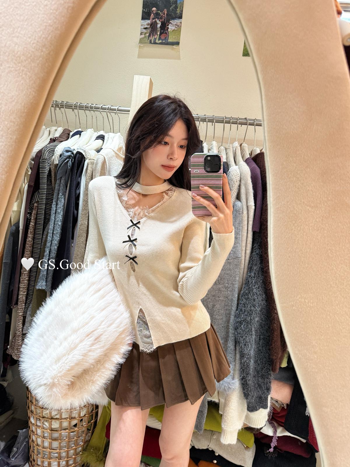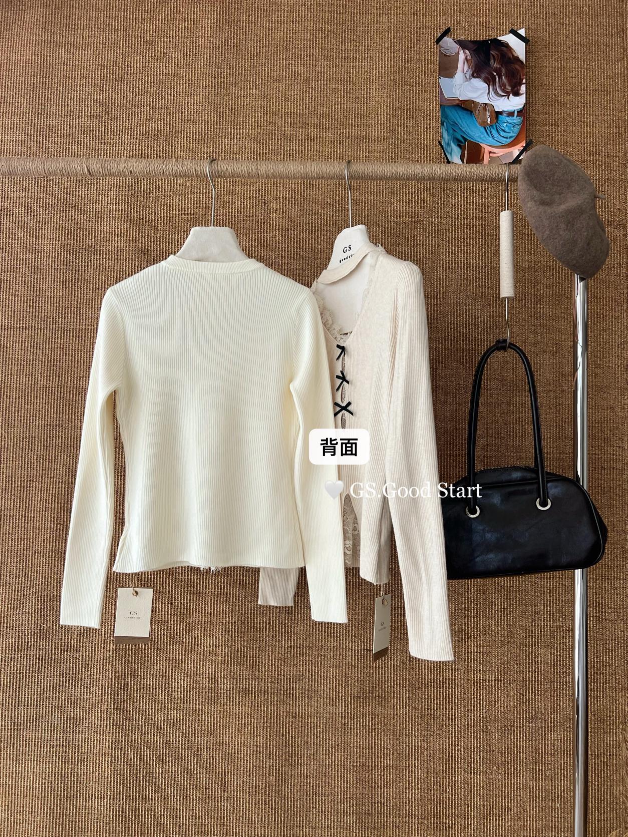 【C7862】超受歡迎!美女感很到位~秋冬純欲溫柔蕾絲拼接蝴蝶結針織小衫