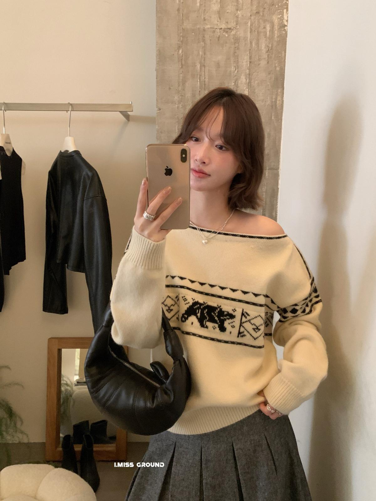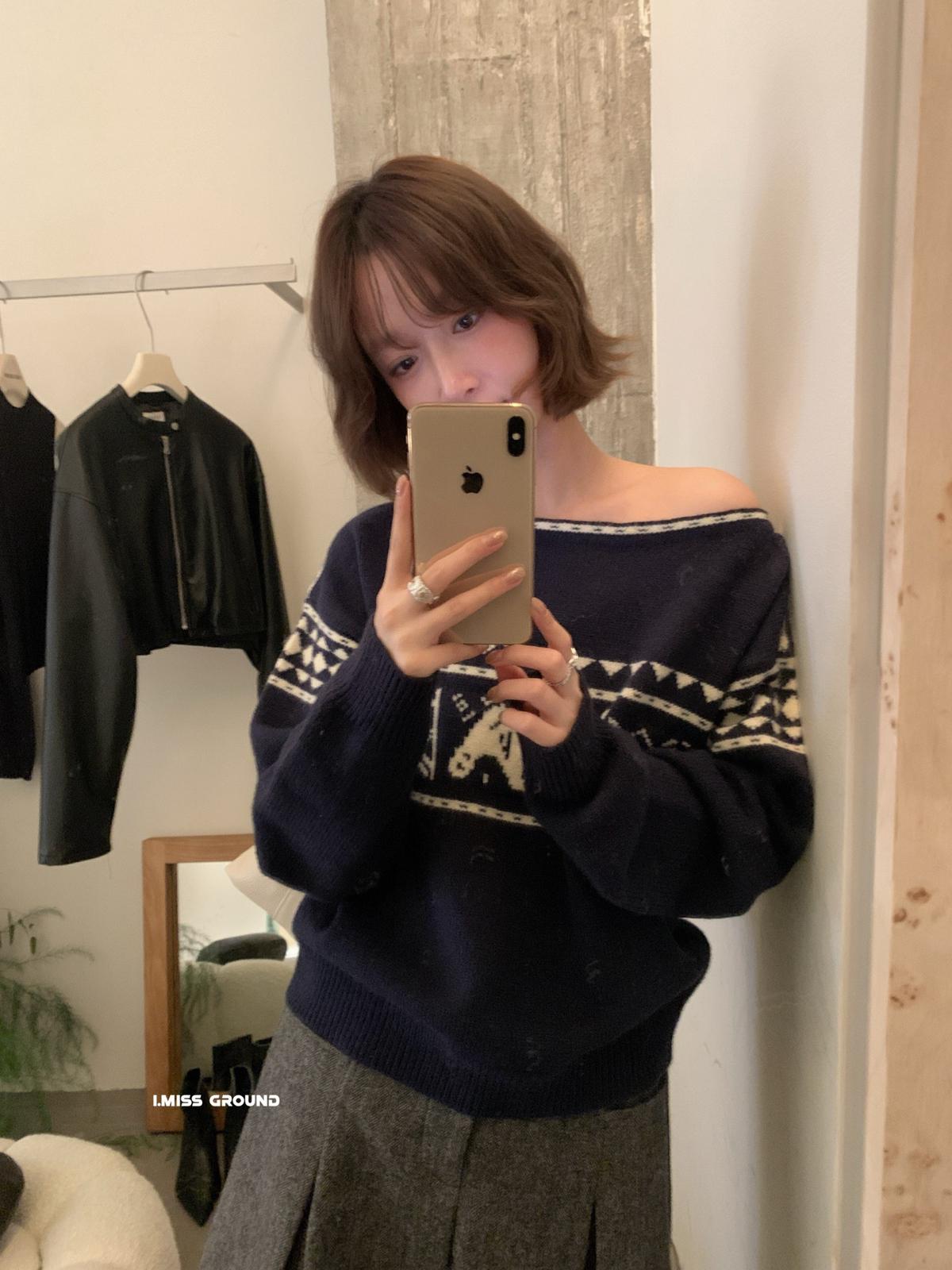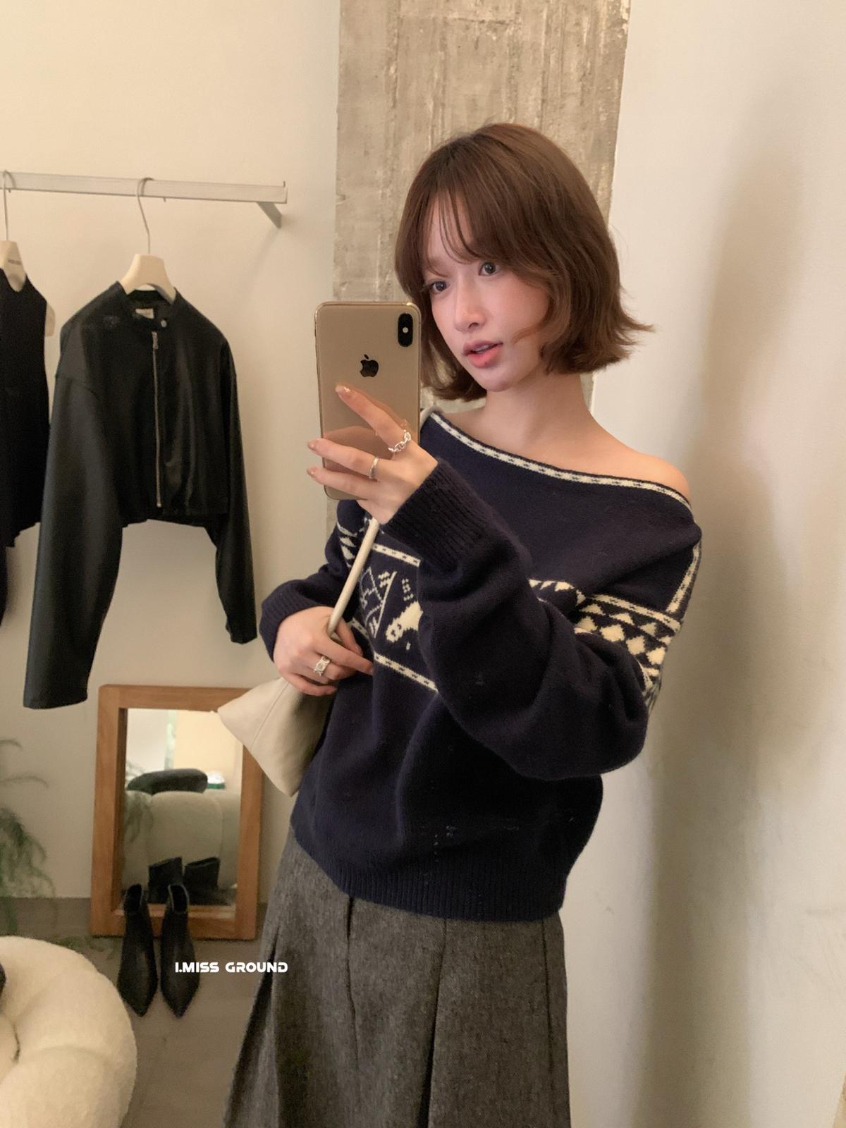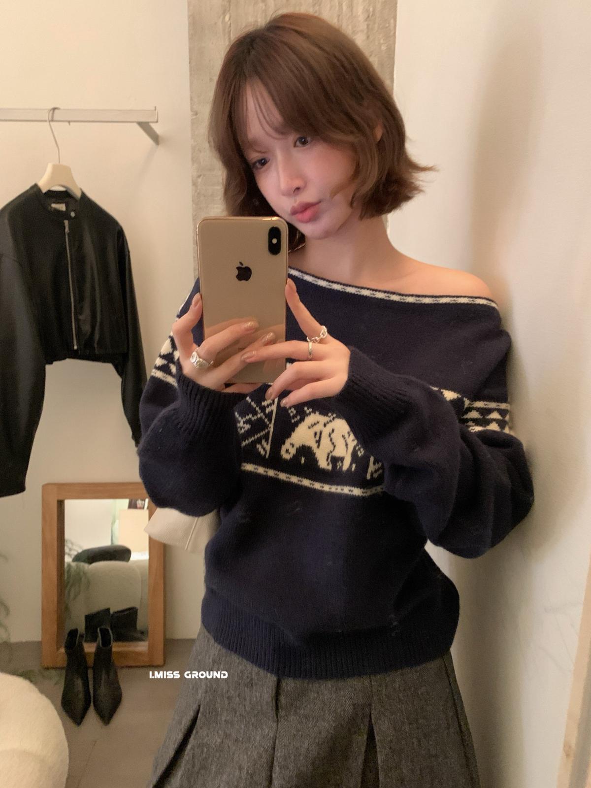 【C7868】聖誕款!兩穿復古提花斜肩保暖毛衣